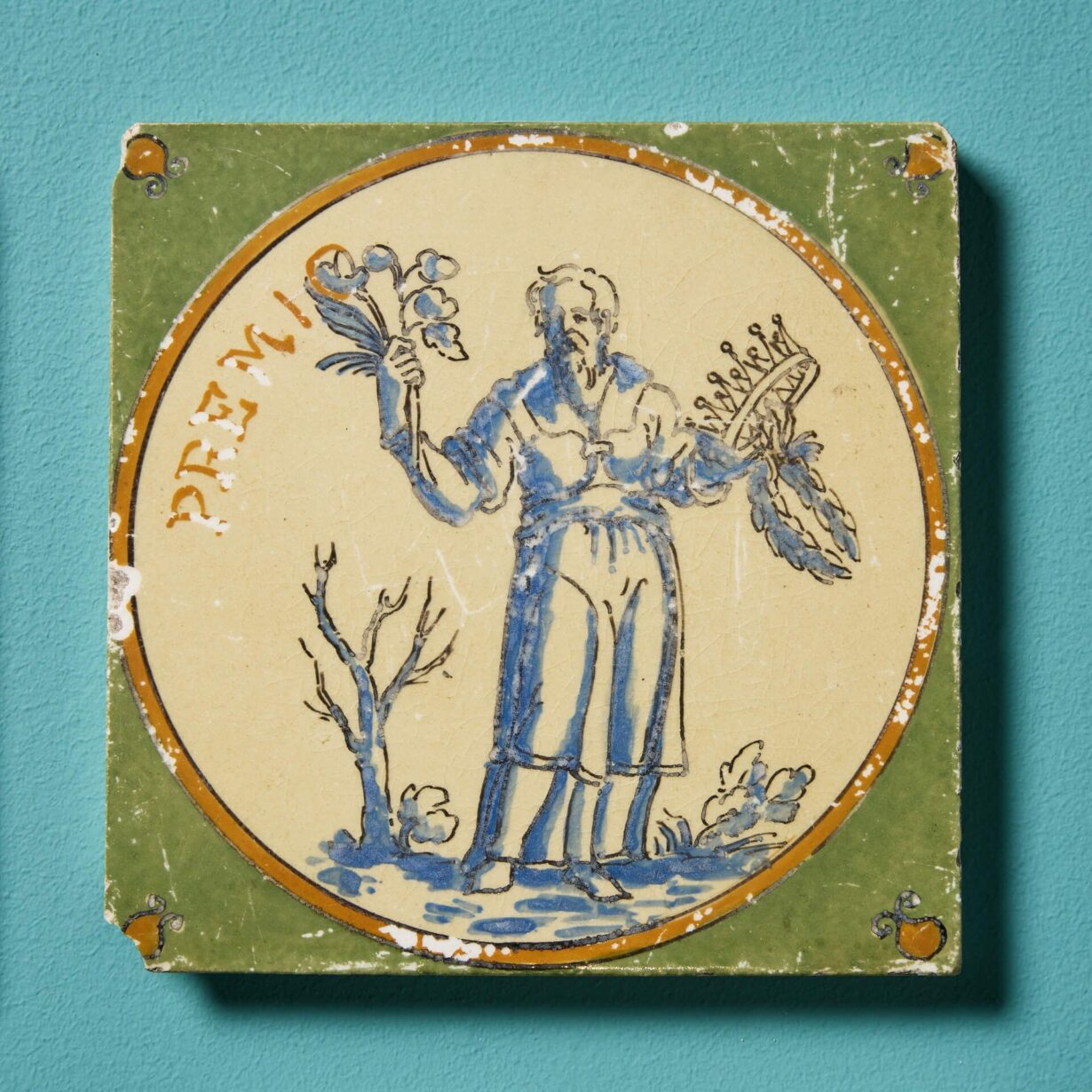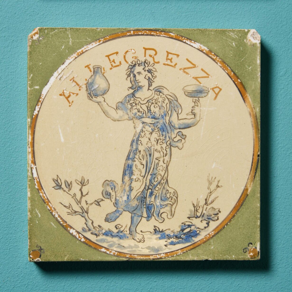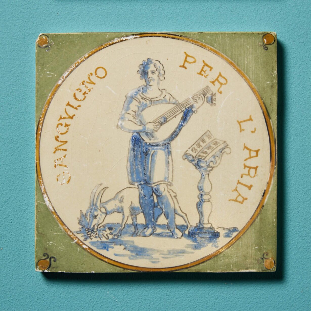 In Neoclassical style, each 5 inch tile showcases classically dressed figures, musicians, and warriors hand painted in tonal blue with ochre coloured ornaments within a pastel green border.