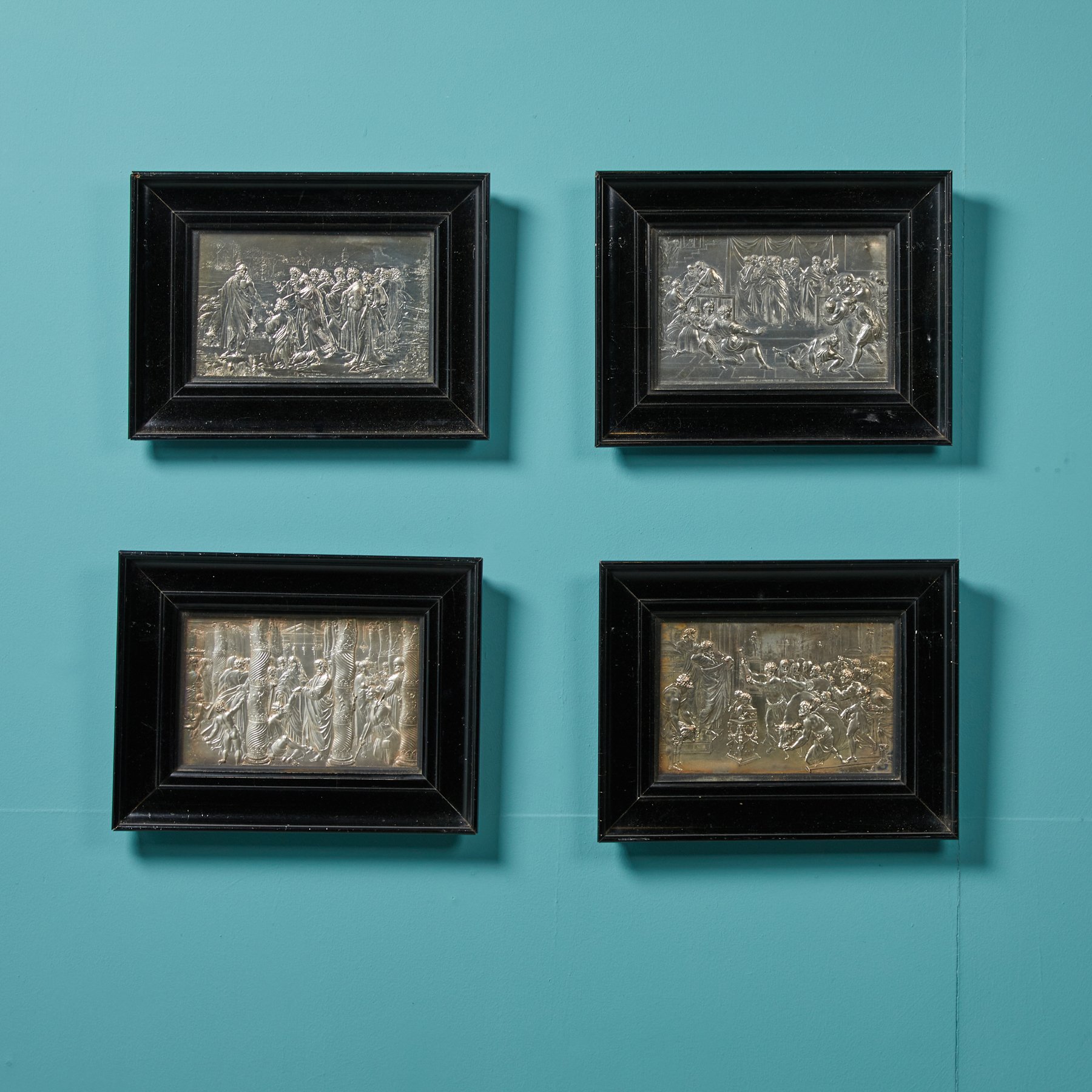 back to topThese framed artworks are after artist John F. Henning’s 19th century plaster cast depictions of seven religious tapestries by high renaissance painter Raphael. Each are made in silver plate on copper electrotype plaques within a glazed ebonised wooden frame. All scenes are of a religious nature, depicting key episodes of the lives of Christian apostles Saint Peter and Saint Paul. They include ‘The Healing of the Lame Man’, ‘Christ’s Charge to Peter’, ‘The Sacrifice at Lystra’, ‘The Death of Ananias’, ‘The Miraculous Draught of Fishes’, ‘The Conversion of the Proconsul’ and ‘Paul Preaching at Athens’. These plaques are rarely available as a complete set of seven.