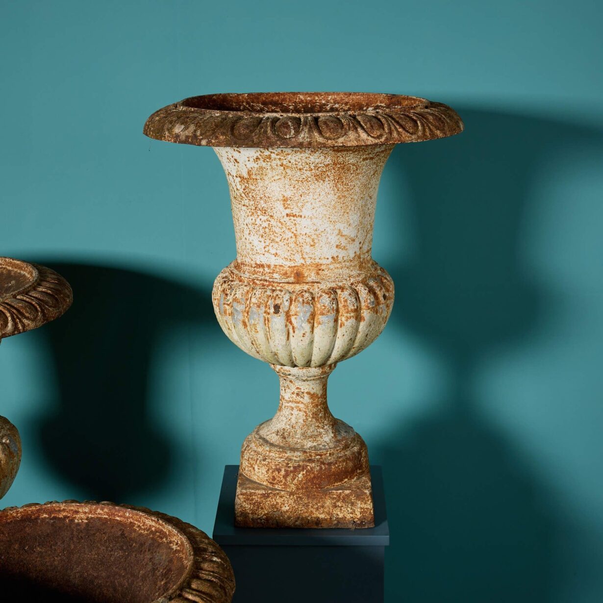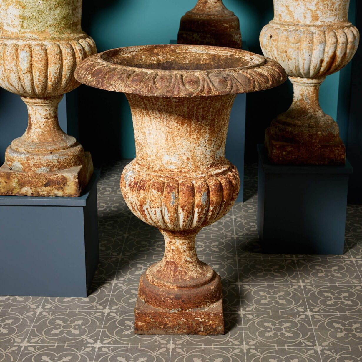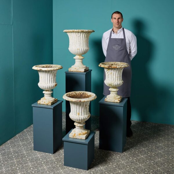 With their large scale and timeless campana style, with gadrooned bases and egg and dart rims, this set of antique garden urns is ideal for a spacious garden or sizeable country property. They will look particularly striking lining either side of a stone driveway or atop the walls of a courtyard garden.