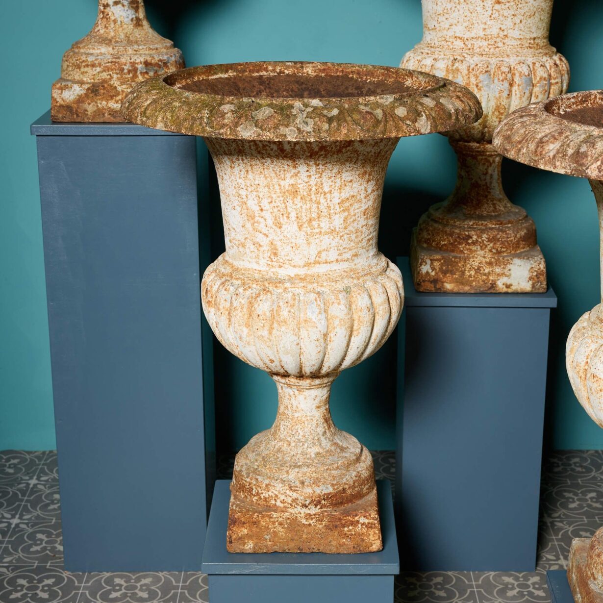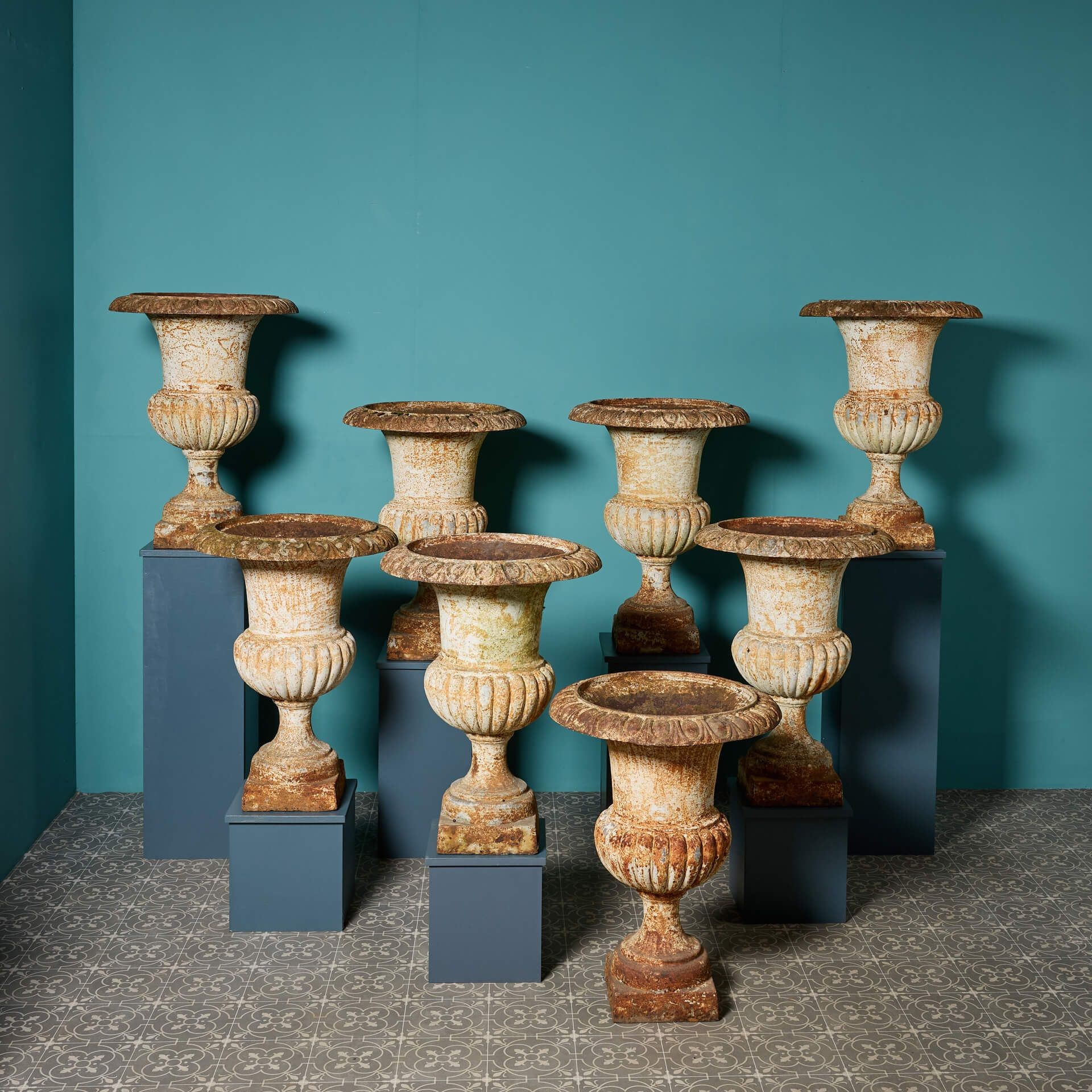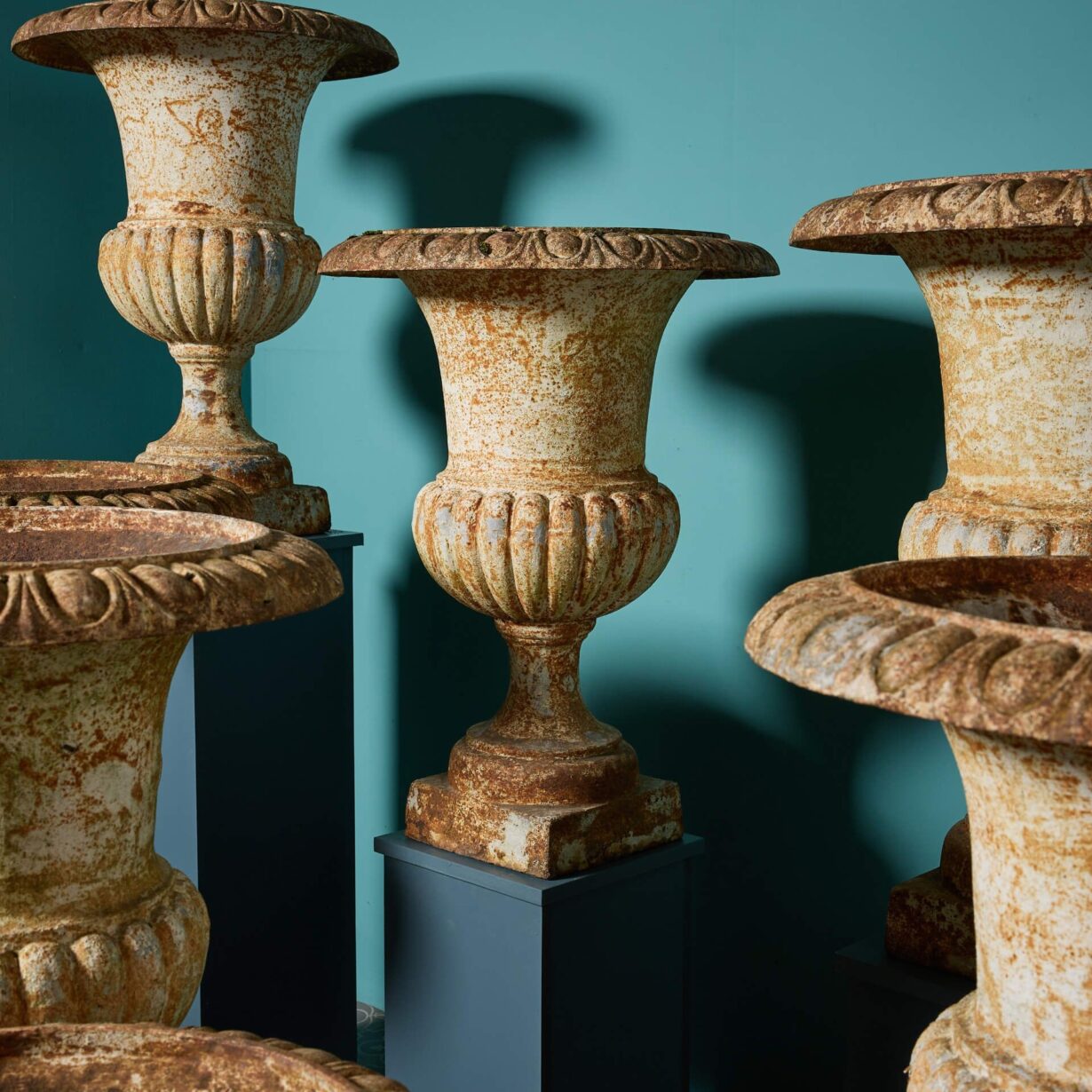 Dating from the Victorian period, antique matching urns of this quantity are an unusual find. This is a rare opportunity to purchase a large number of matching urns, each beautifully weathered.