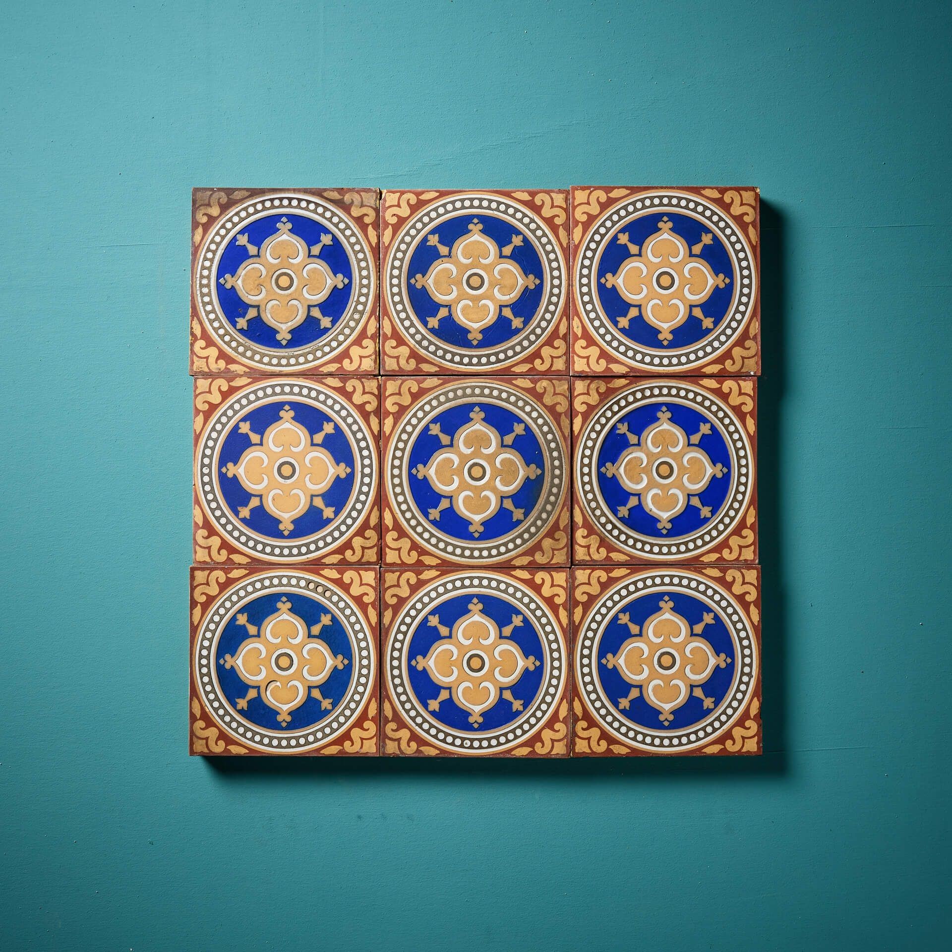 This set of nine reclaimed tiles could be used in a number of ways including a decorative panel or a vibrant splashback for a vintage kitchen. We are selling various sets of these tiles in panels of nine as pictured which could be used together as floor tiles.