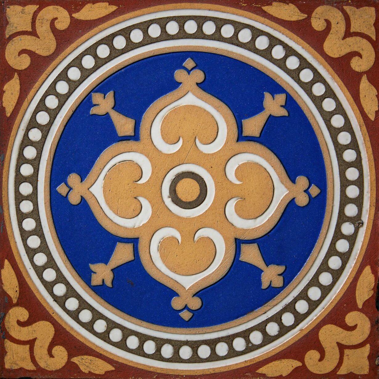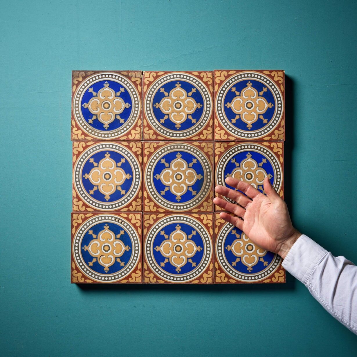 back to topNine 6-inch antique Maw & Co encaustic tiles displaying red and buff patterns surrounding roundels with blue glaze around a central floret.