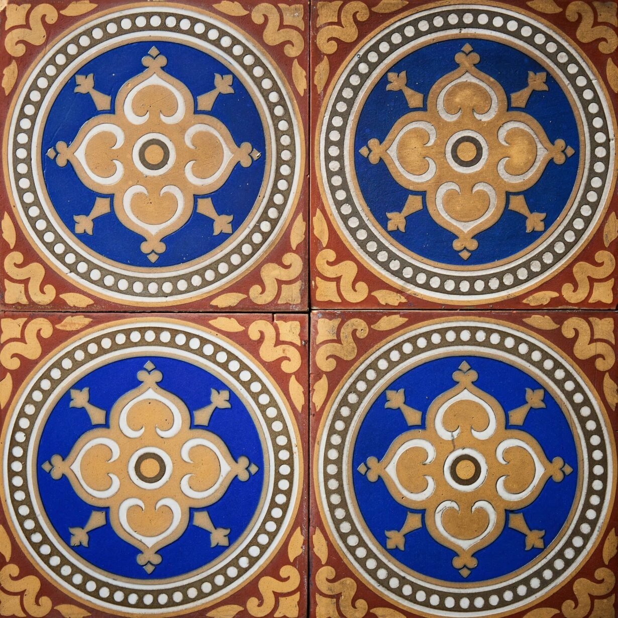 back to topNine 6-inch patterned Maw & Co encaustic tiles (stamped) displaying red and buff patterns surrounding roundels with blue glaze around a central floret. This is just one of various sets of these tiles we are selling, sold in batches of 9 as pictured.