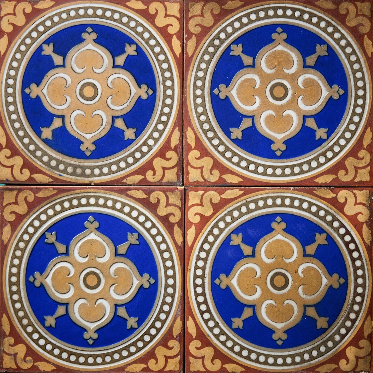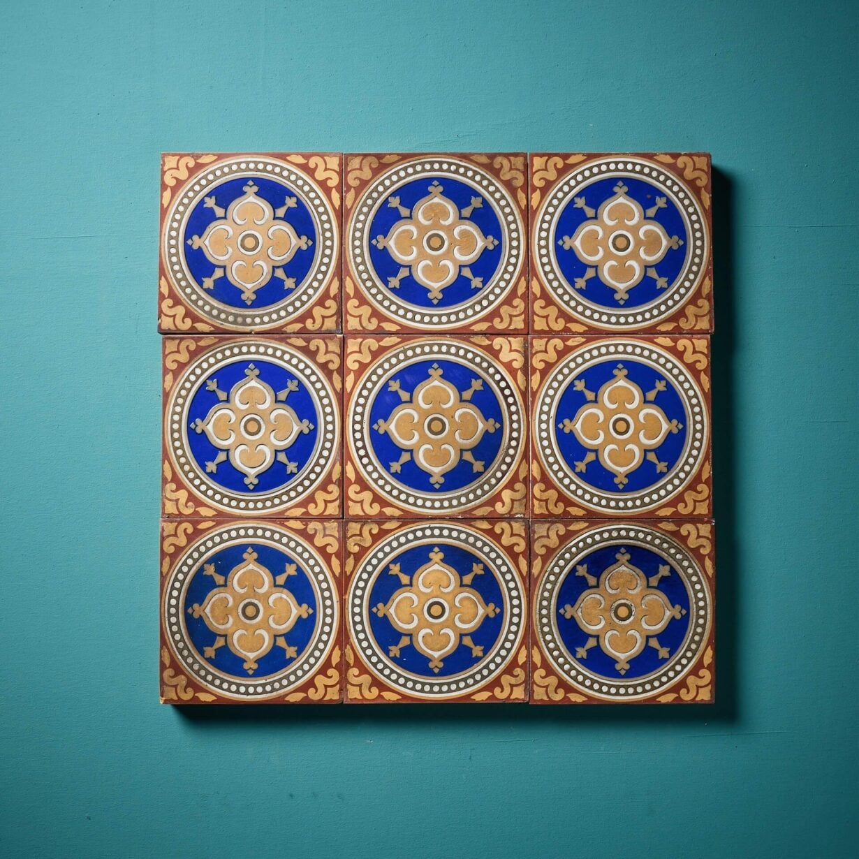 back to topNine 6-inch patterned Maw & Co encaustic tiles (stamped) displaying red and buff patterns surrounding roundels with blue glaze around a central floret. This is just one of various sets of these tiles we are selling, sold in batches of 9 as pictured.