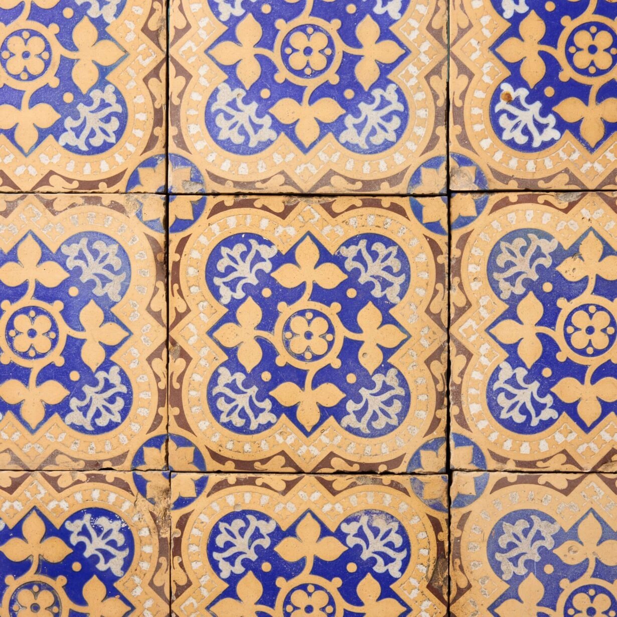 back to topA set of 9 reclaimed Minton encaustic floor tiles perfect for a period cottage or townhouse. The set comprises of nine 6-inch by 6-inch tiles in Pugin style with a repeating mustard and white floral pattern with stylised foliage and a blue background.