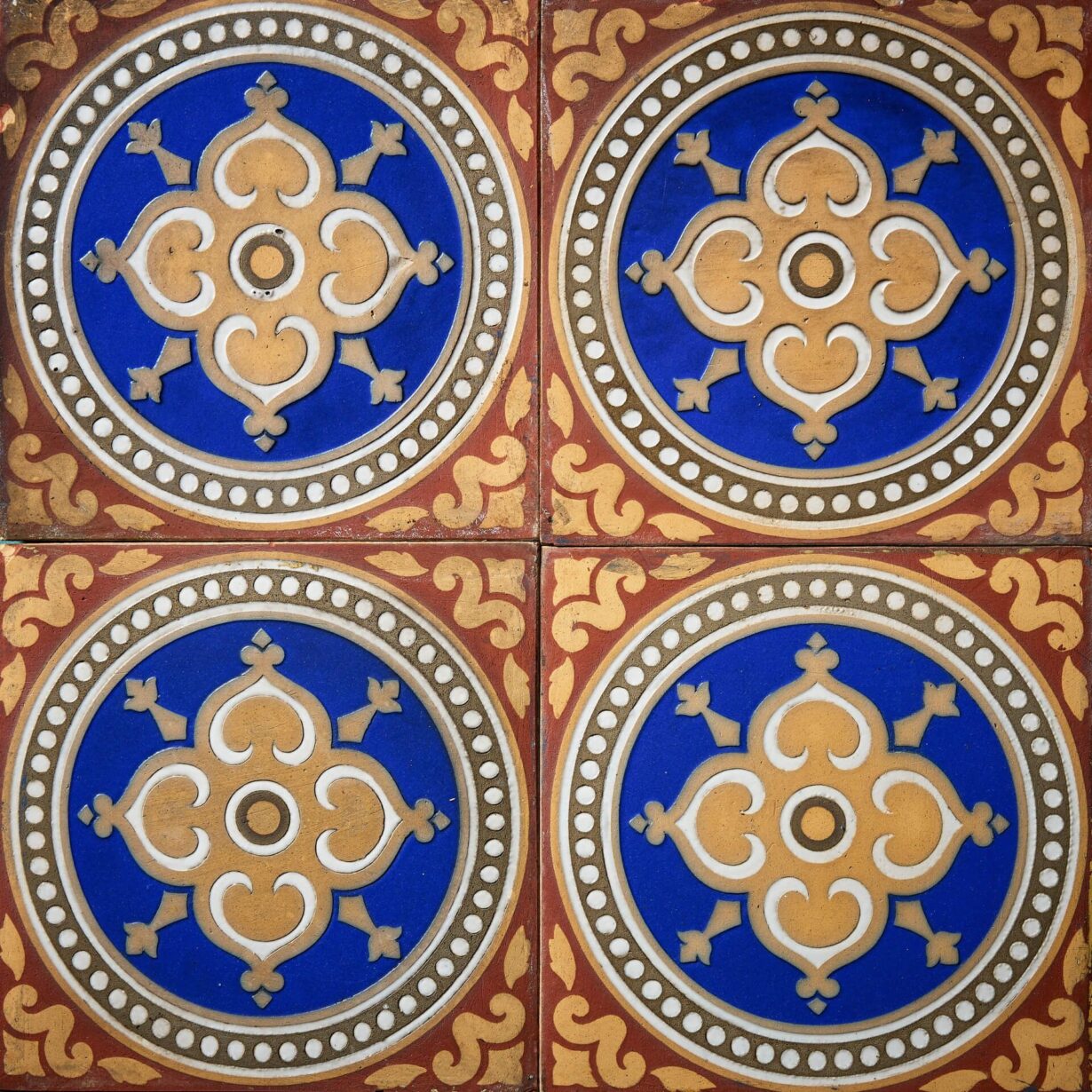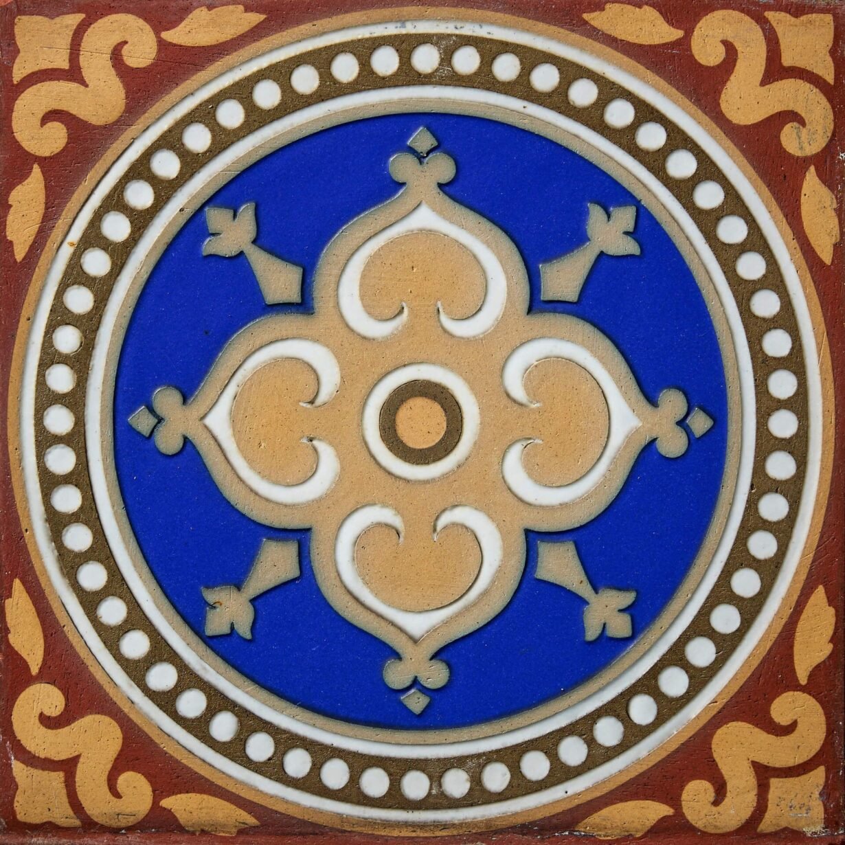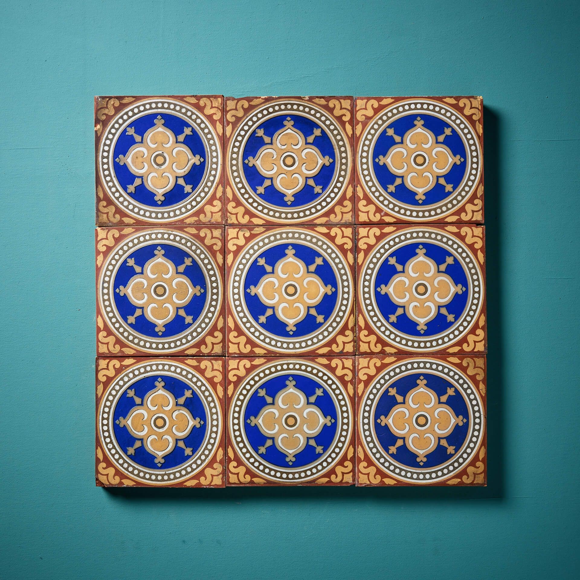 back to topNine 6-inch patterned Maw & Co encaustic tiles (stamped) displaying red and buff patterns surrounding roundels with blue glaze around a central floret. This is just one of various sets of these tiles we are selling, sold in batches of 9 as pictured.