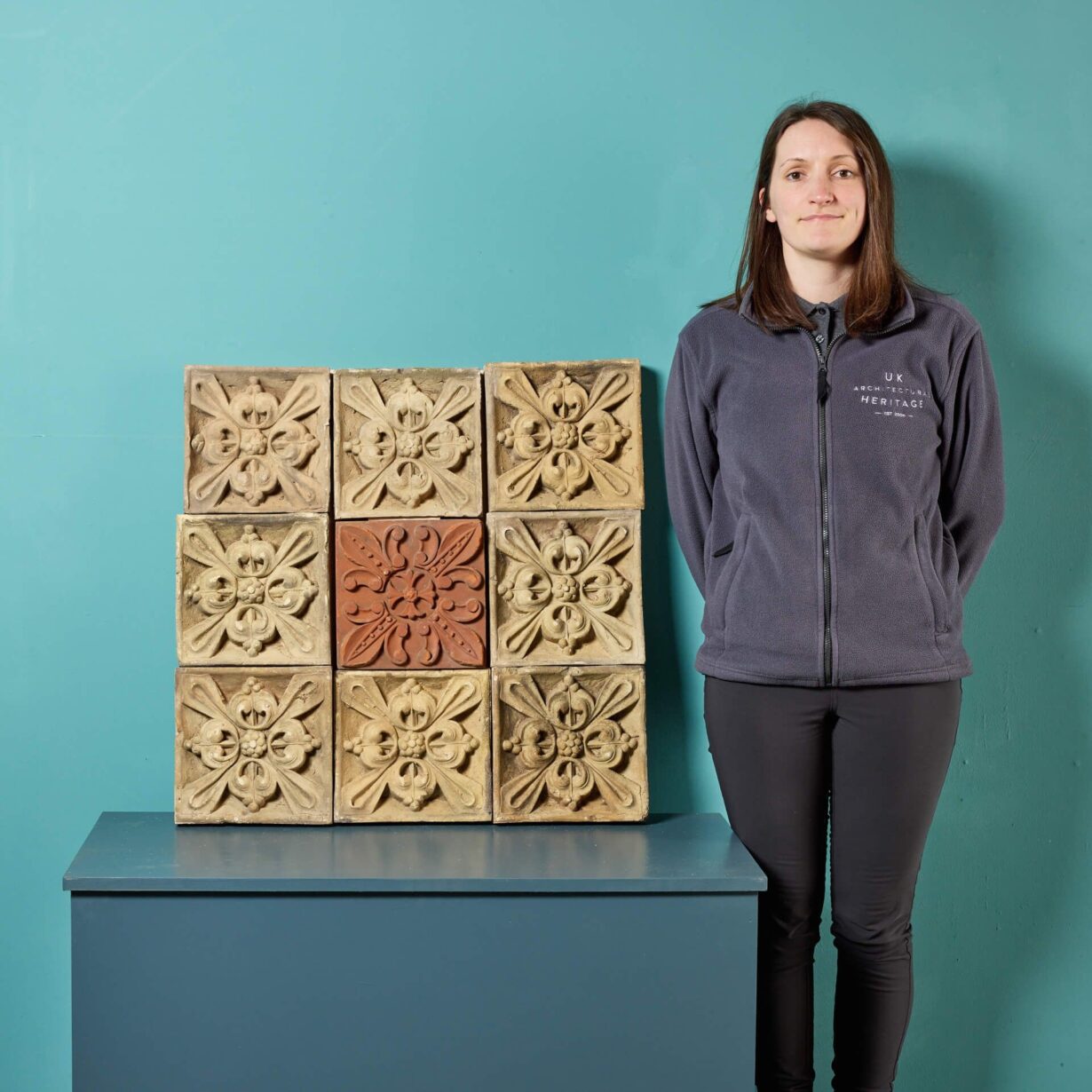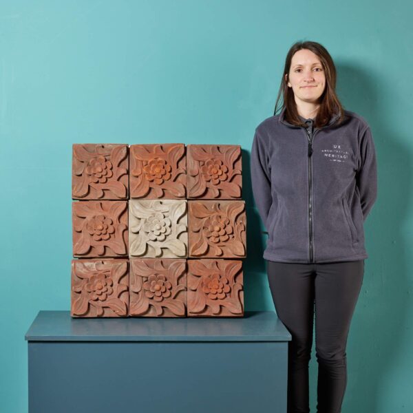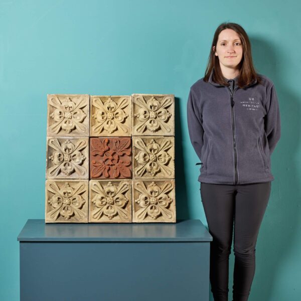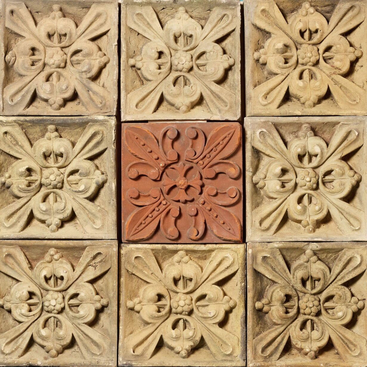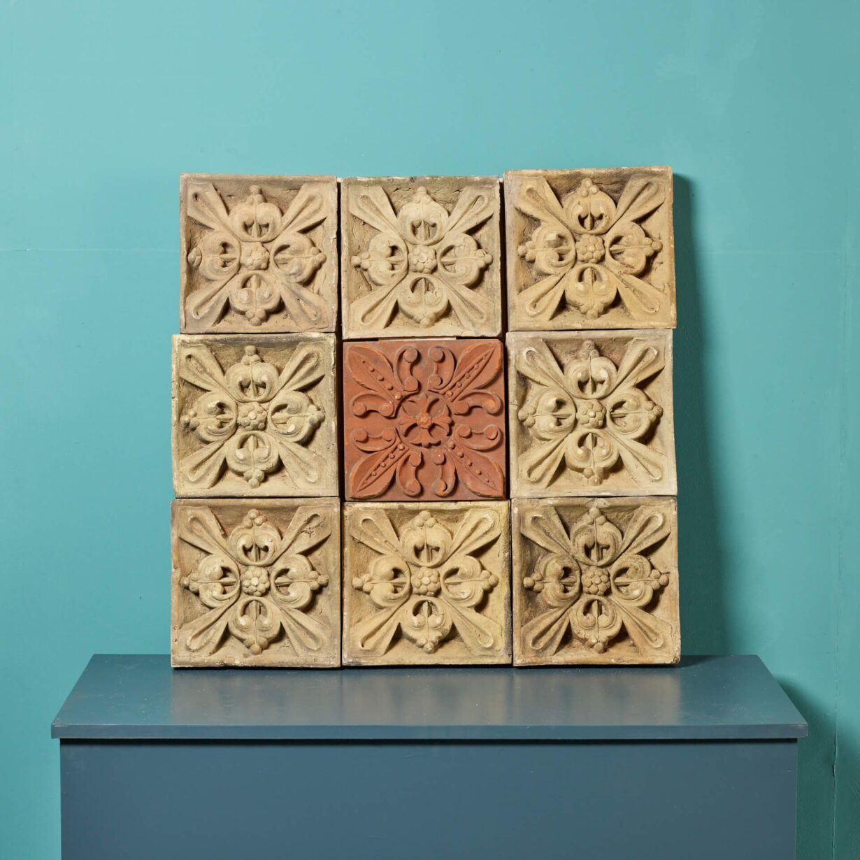 back to topAn antique 19th century decorative panel of 9 individual buff and rich terracotta plaques, sourced from an estate in Cambridge.