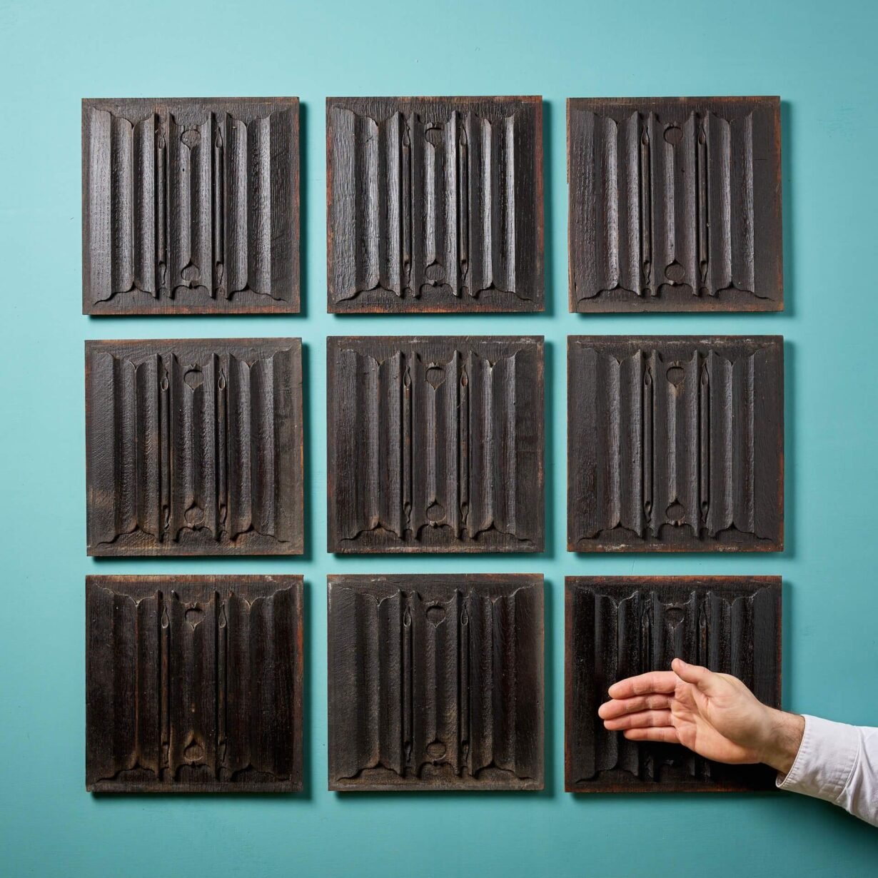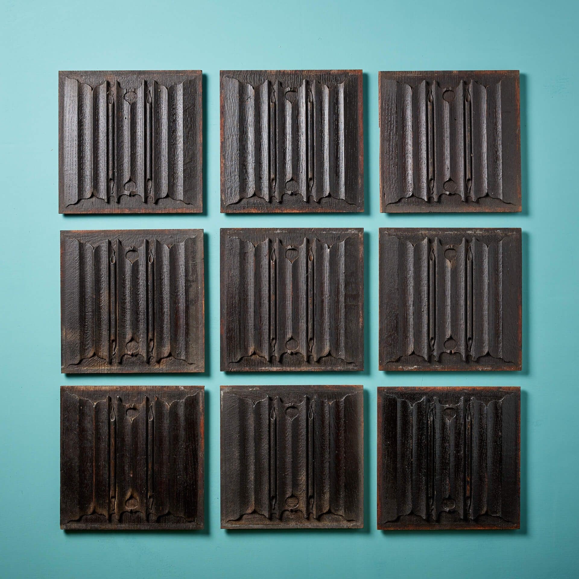 Originally part of a panelled room in a grand English home, these nine panels could be repurposed as a set of decorative wall hangings in any formation as desired.