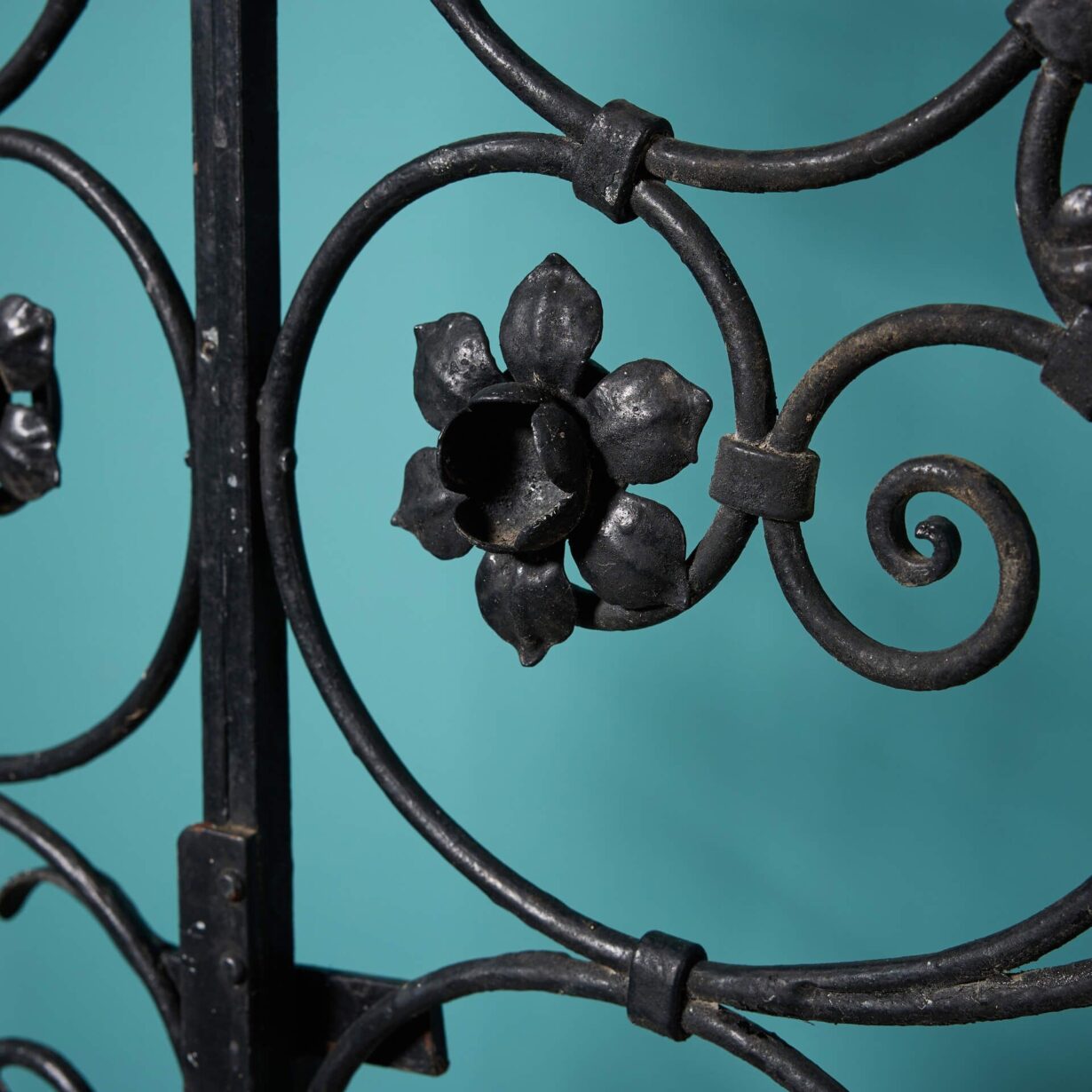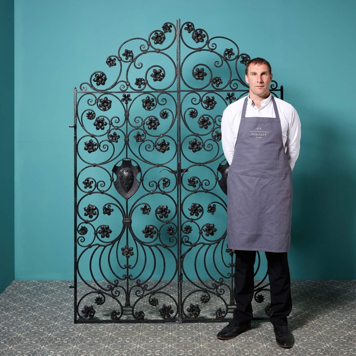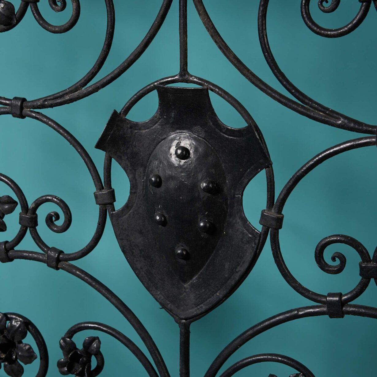 Not only providing security with their tall profile, these pedestrian gates are highly elaborate, decorated with shields surrounded by an abundance of scrolls and daffodil flowers.