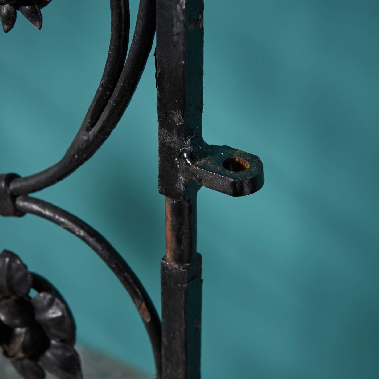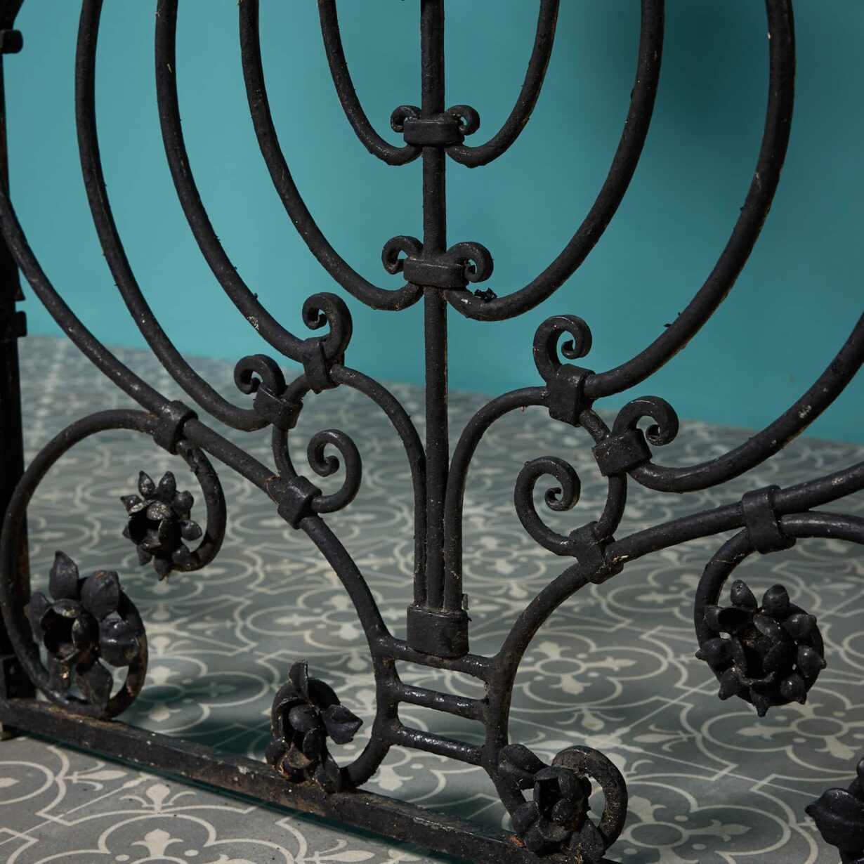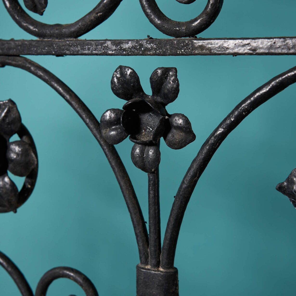 Not only providing security with their tall profile, these pedestrian gates are highly elaborate, decorated with shields surrounded by an abundance of scrolls and daffodil flowers.
