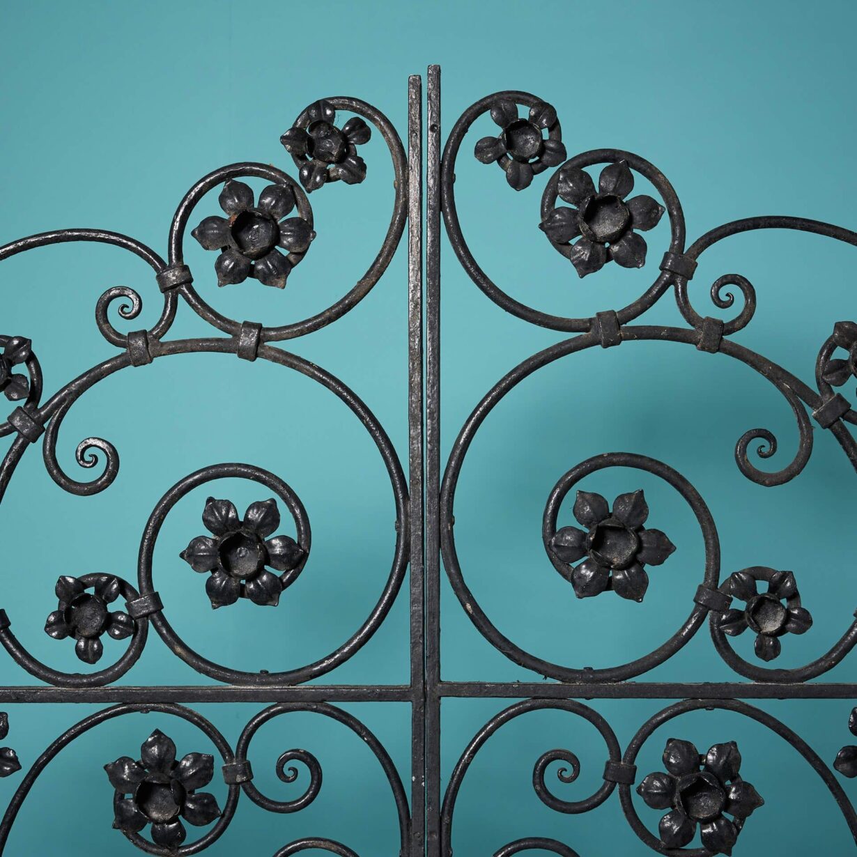 back to topA tall set of handcrafted wrought iron double garden gates, traditionally made by a skilled blacksmith.
