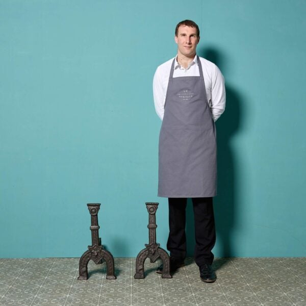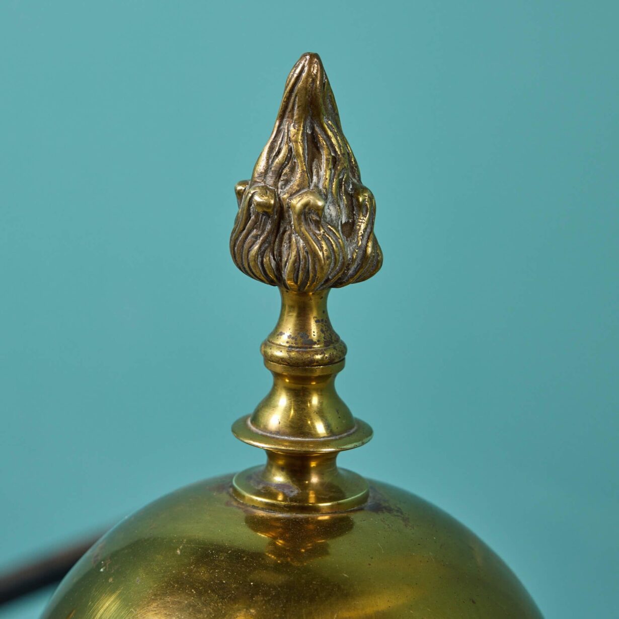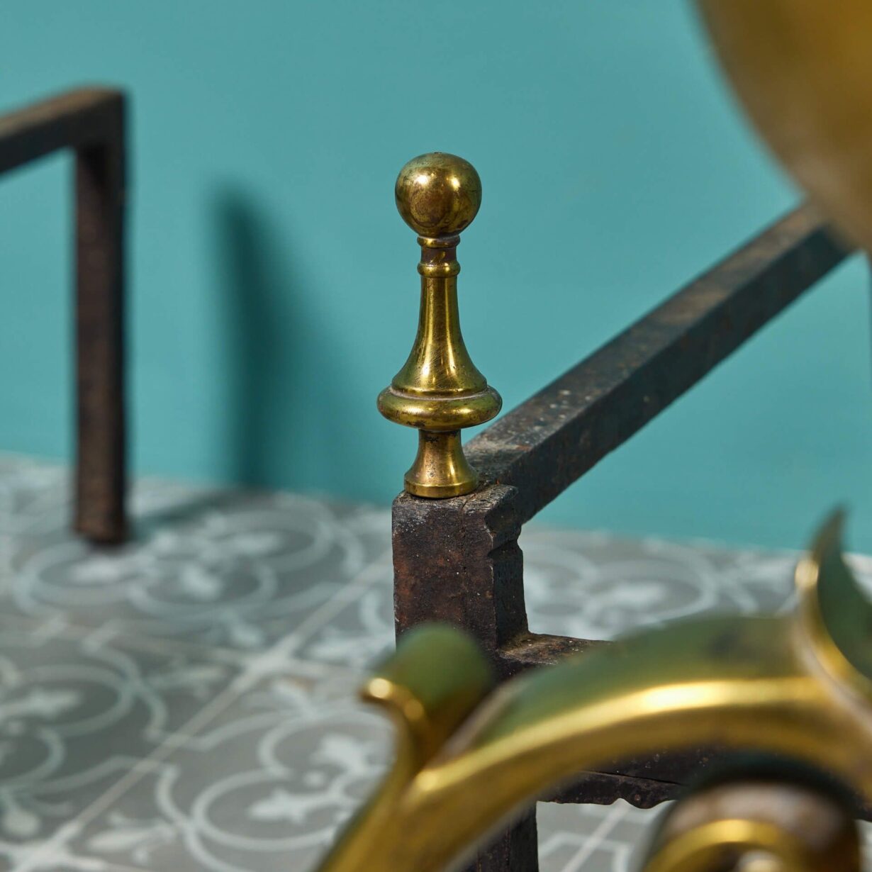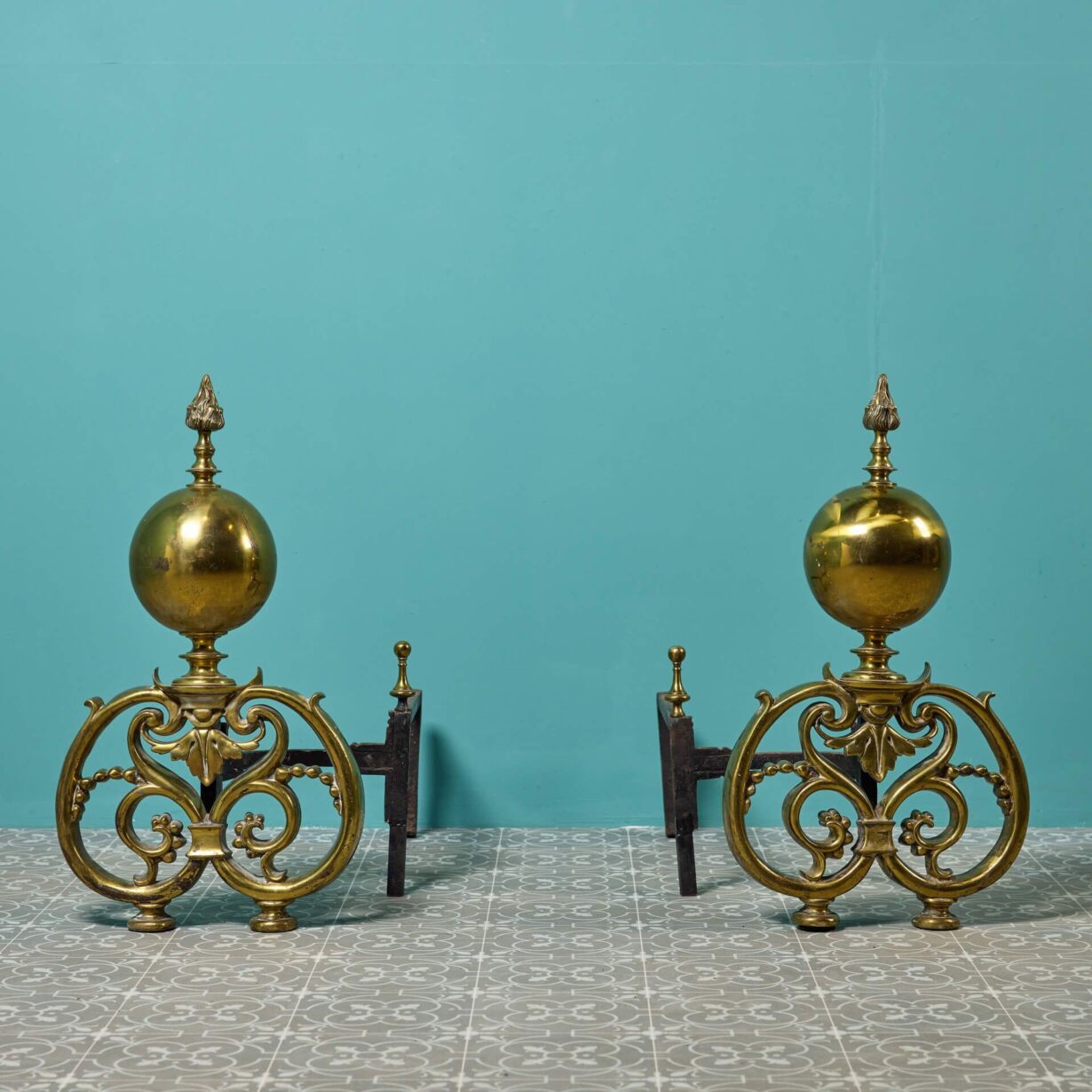 back to topAn impressive set of large baroque style cast brass fire dogs circa 1800. Though they date from the Georgian and Regency eras, these antique fire dogs have a distinctly baroque look with their elaborate scrolling design, striking globe forms and flame finials. More than 200 years old, each fire dog is cast in brass with a lightly tarnished finish in places, supported by wrought iron supports to the back.