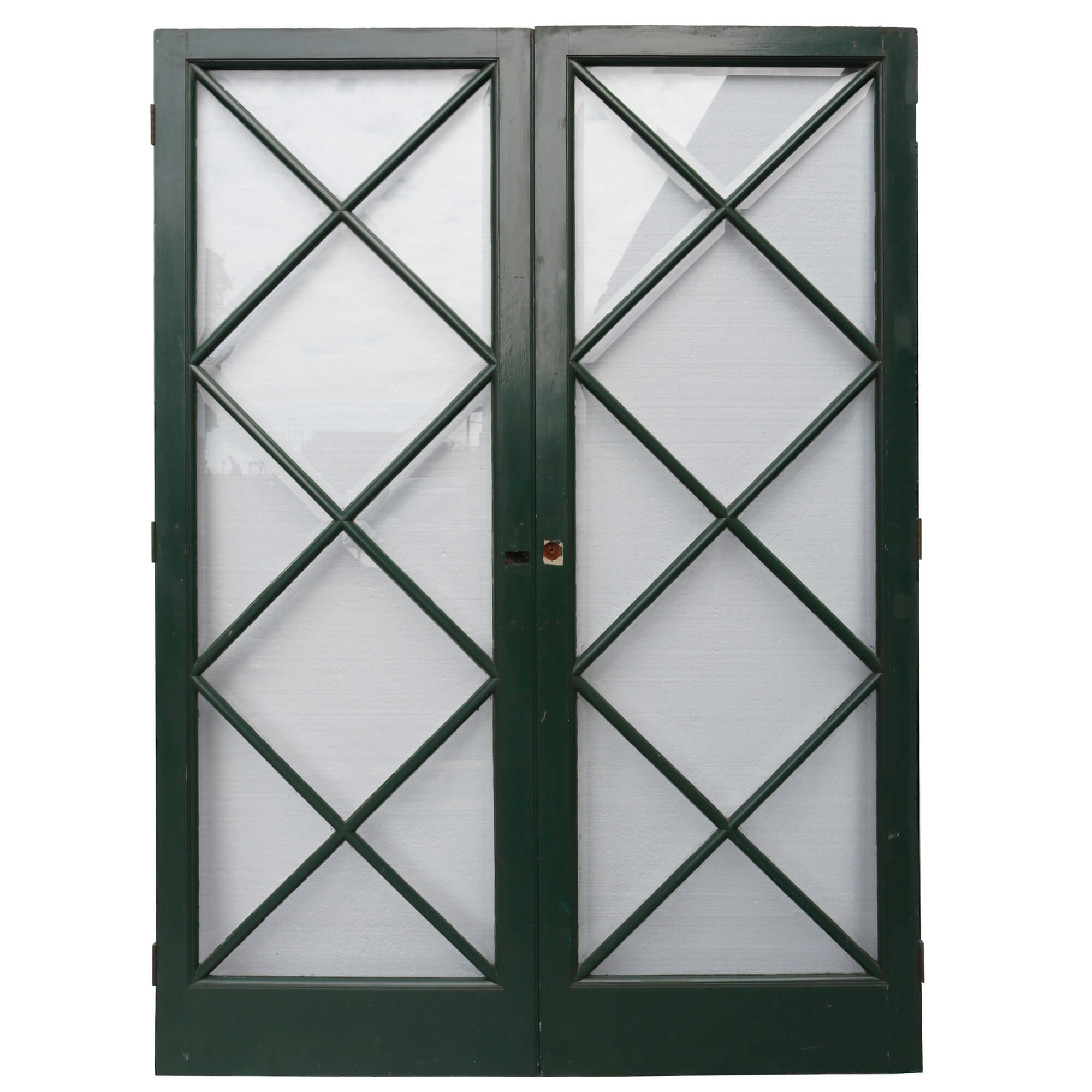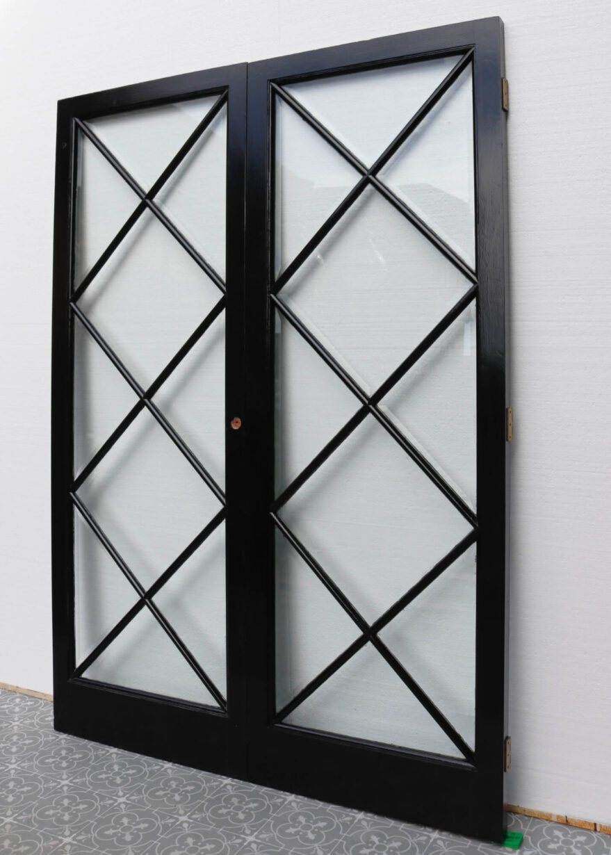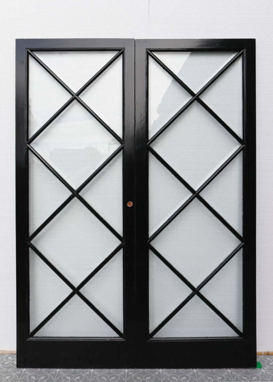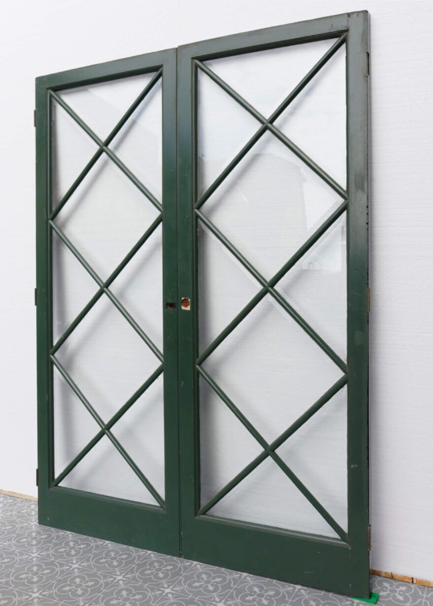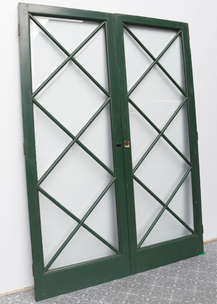back to topDating from the 1950s, this pair of reclaimed glazed internal doors make a stylish set of dividing doors. Channelling a mid-century look, they are striking double doors for a modern interior, making a statement with their geometric diamond-shaped, glazing. These doors are currently dual colour, painted in green on the front with a black painted reverse. The frames are mahogany, supporting single glazing and clear bevelled glass, making these mid-century doors best suited to internal use between hallways and reception rooms. They would also make a beautiful set of doors for a summer house or garden room alongside this matching pair.
