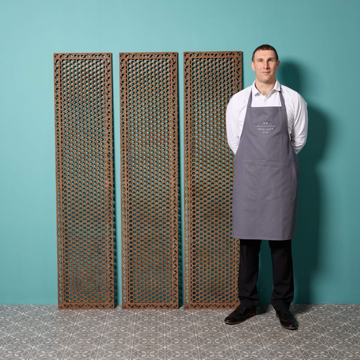 back to topReclaimed cast iron floor grids (37 available), suitable for interior and exterior use. Suitable for a variety of uses, these original ornate grids or grills were once used to cover heating pipes in church orangeries and Victorian greenhouses or mills.