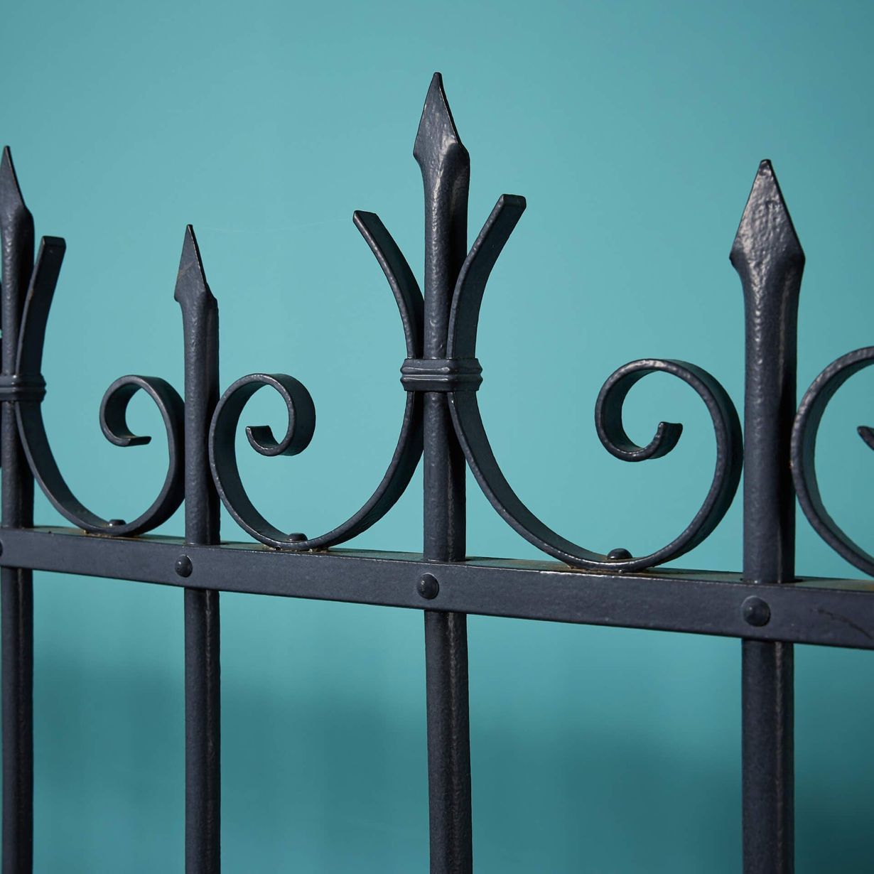 These antique driveway gates bring both style and security to your property with their secure wrought iron panel bases and streamline half-rounded vertical bars, complete with arrowhead finials between scrolls to the top.