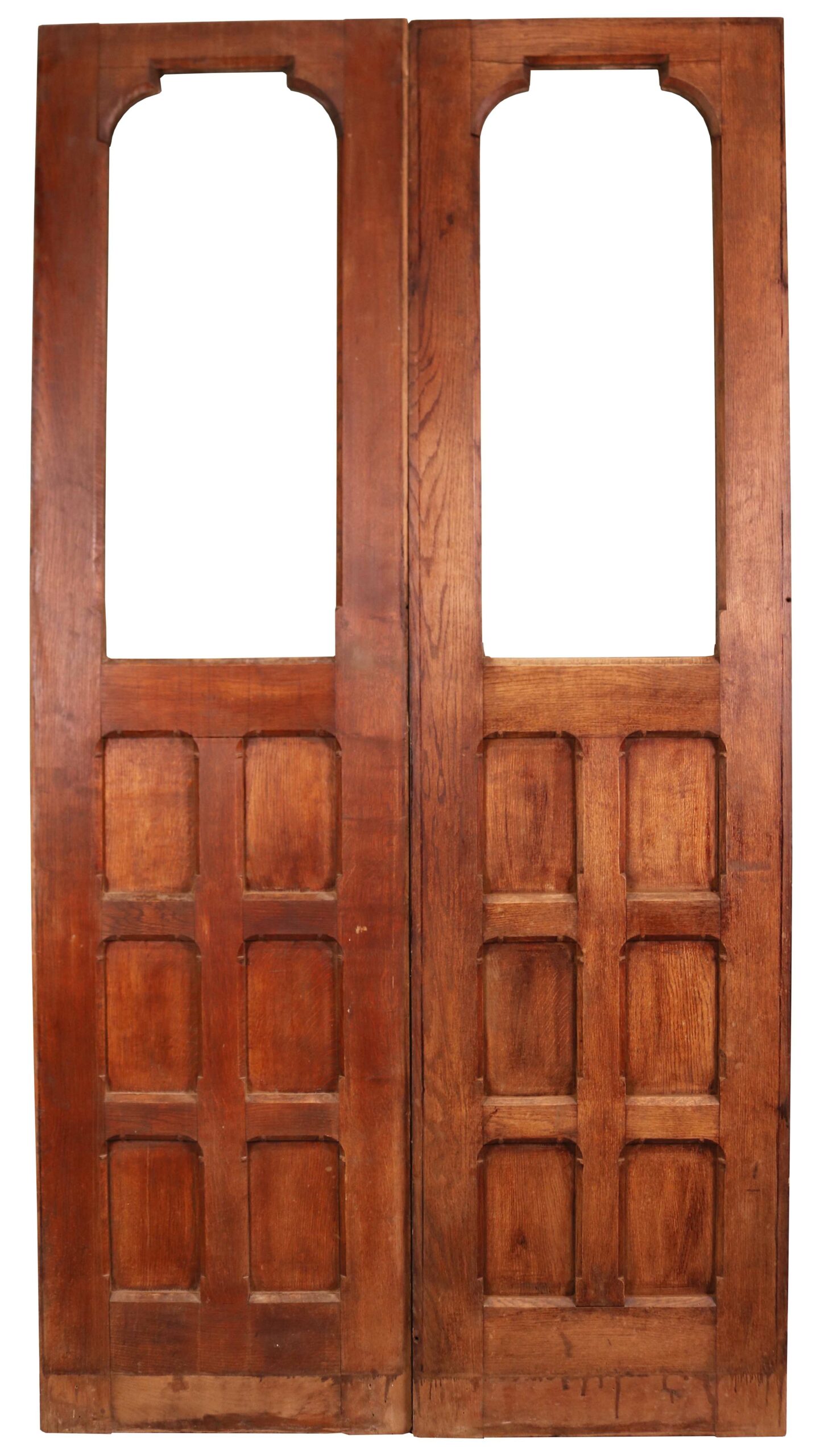 Good structural condition. The doors are fitted with clear glass. These were previously used as fixed panels, so they do not have any cut outs for hardware of hinges. There is no rebate. There is a small scratch near the bottom of the glass.