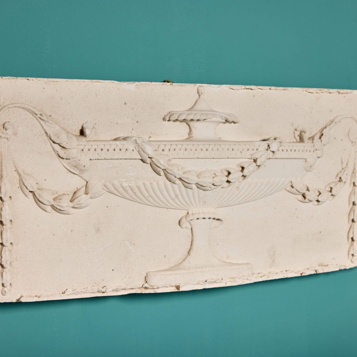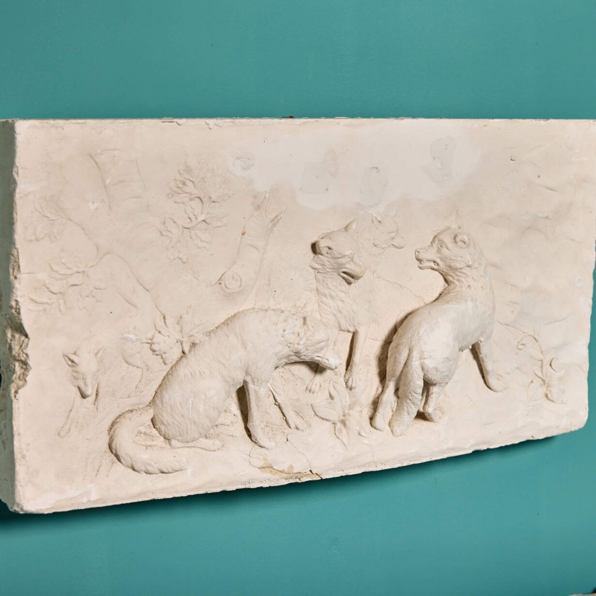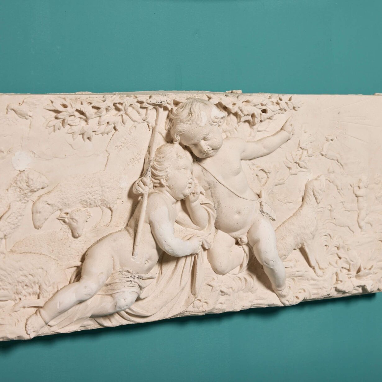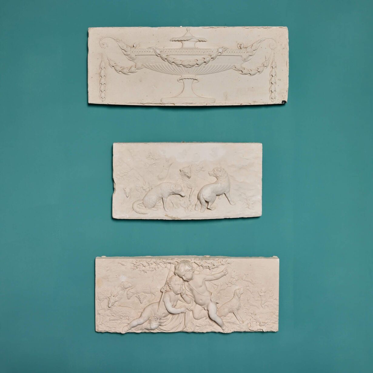 back to topSet of three neoclassical style plaster plaques depicting classical scenes. The first plaque shows an elegant urn, while the second is a wolf pack surrounding an impressive tree. The third shows two sweet cherubs or putti surrounded by doting sheep, a leaping deer, and a watchful dog, while more merry putti dance in the background. Made from plaster, these casts were taken from Georgian chimney piece tablets. All three could be displayed as they are pictured or in an order of your choosing.