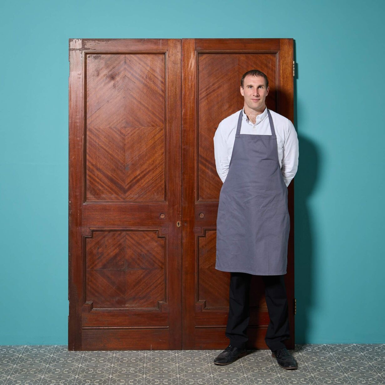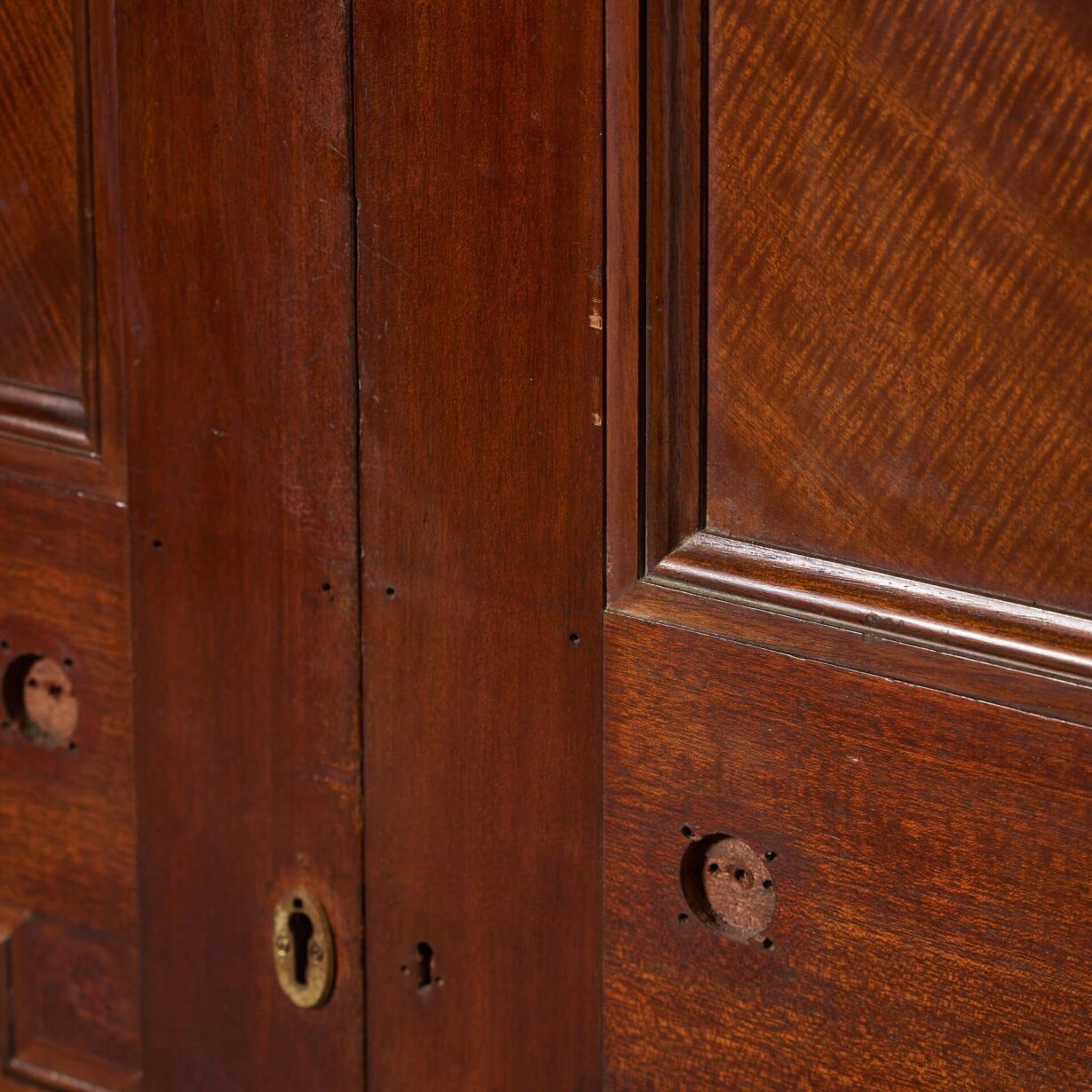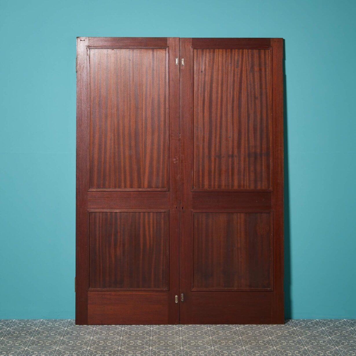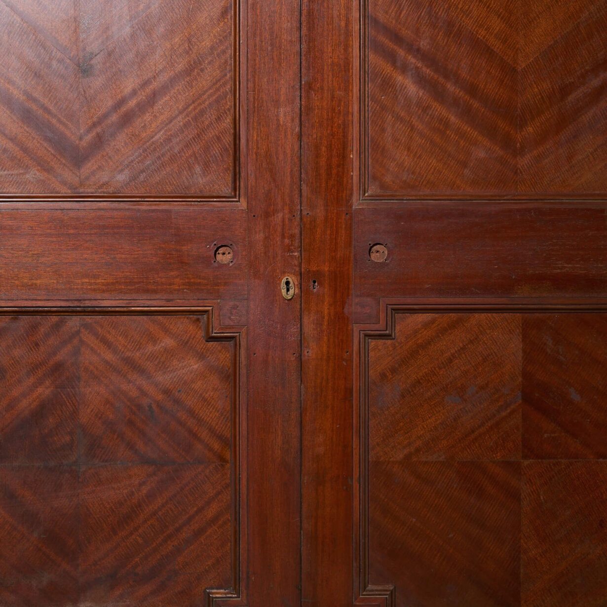 back to topA handsome set of English Victorian double doors originating from the early 20th century. With their beautiful colour and decorative quarter veneered fronts, you can just imagine these doors at the entrance to a period style study, bedchamber or drawing room. Each door is made from hardwood – we believe it to be mahogany – and features 2 moulded panels to the front with a simpler, flush reverse.