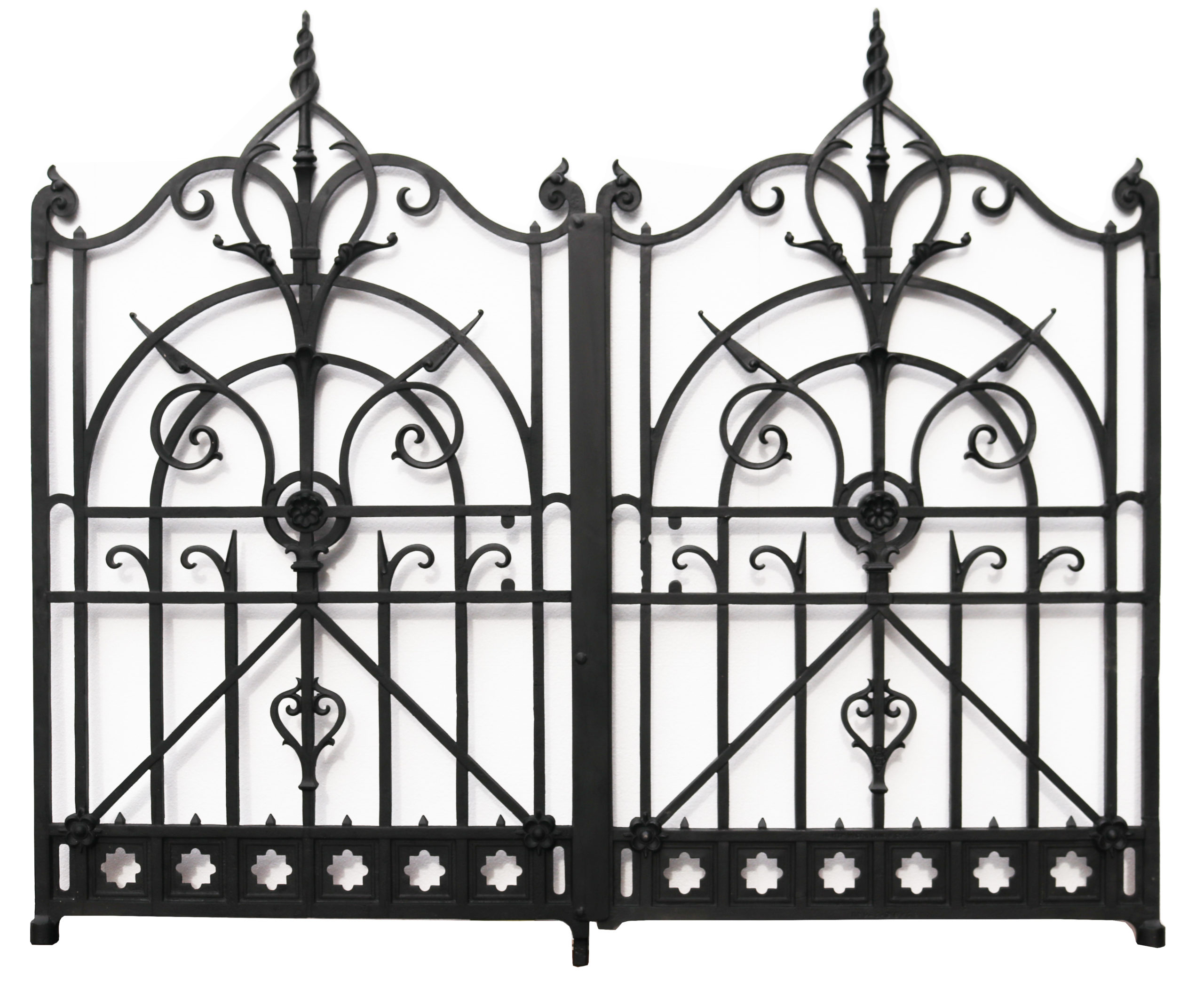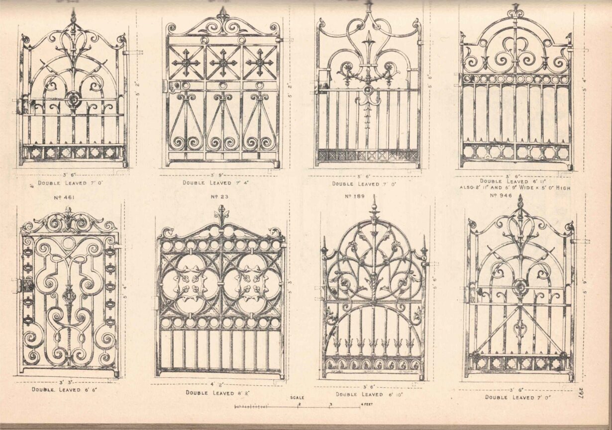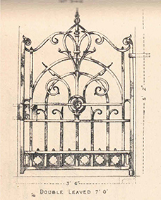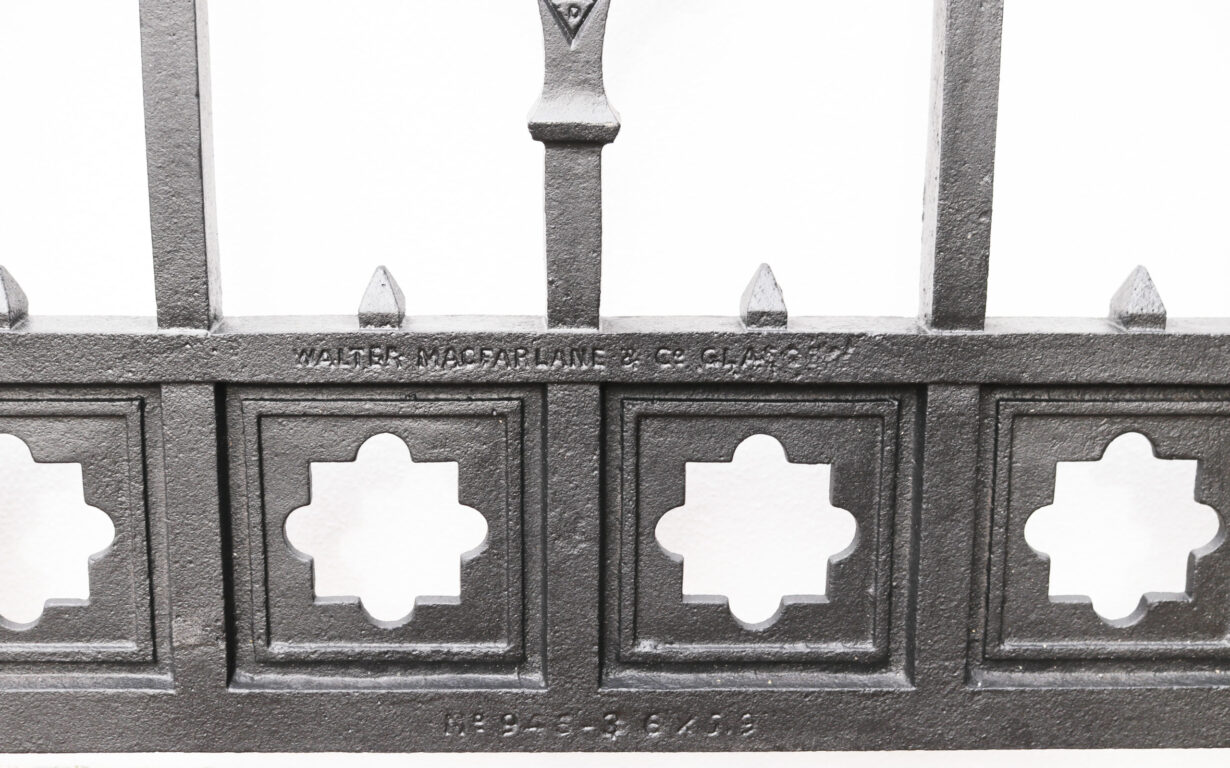 back to topSet of Victorian Walter MacFarlane Cast Iron Gates. A set of antique cast iron gates stamped Walter Macfarlane and Co., Glasgow. With diamond registration stamp. The last image contains original sketches from MacFarlane and Co. booklets of their new designs, of which you can see our own included in the top left corner.