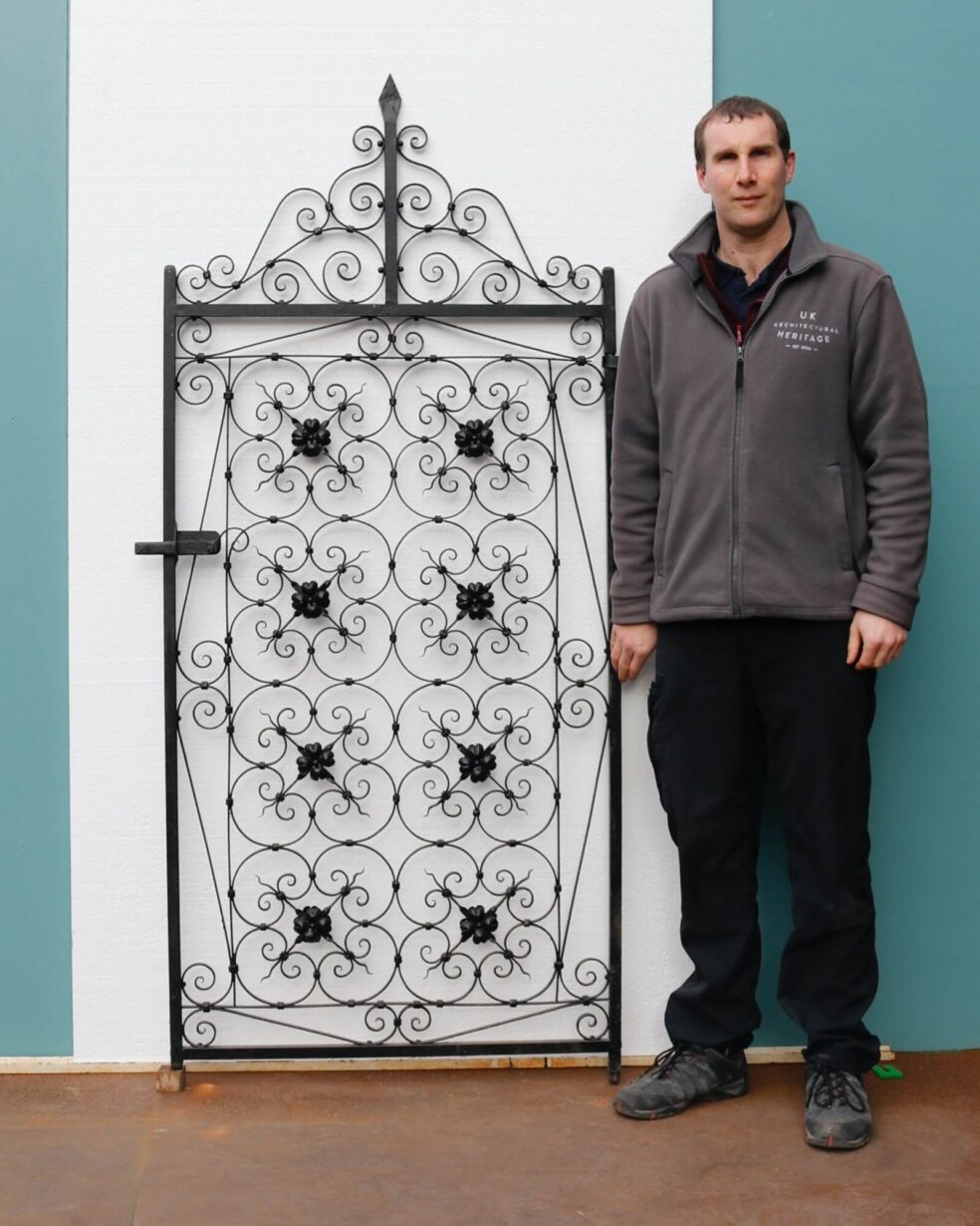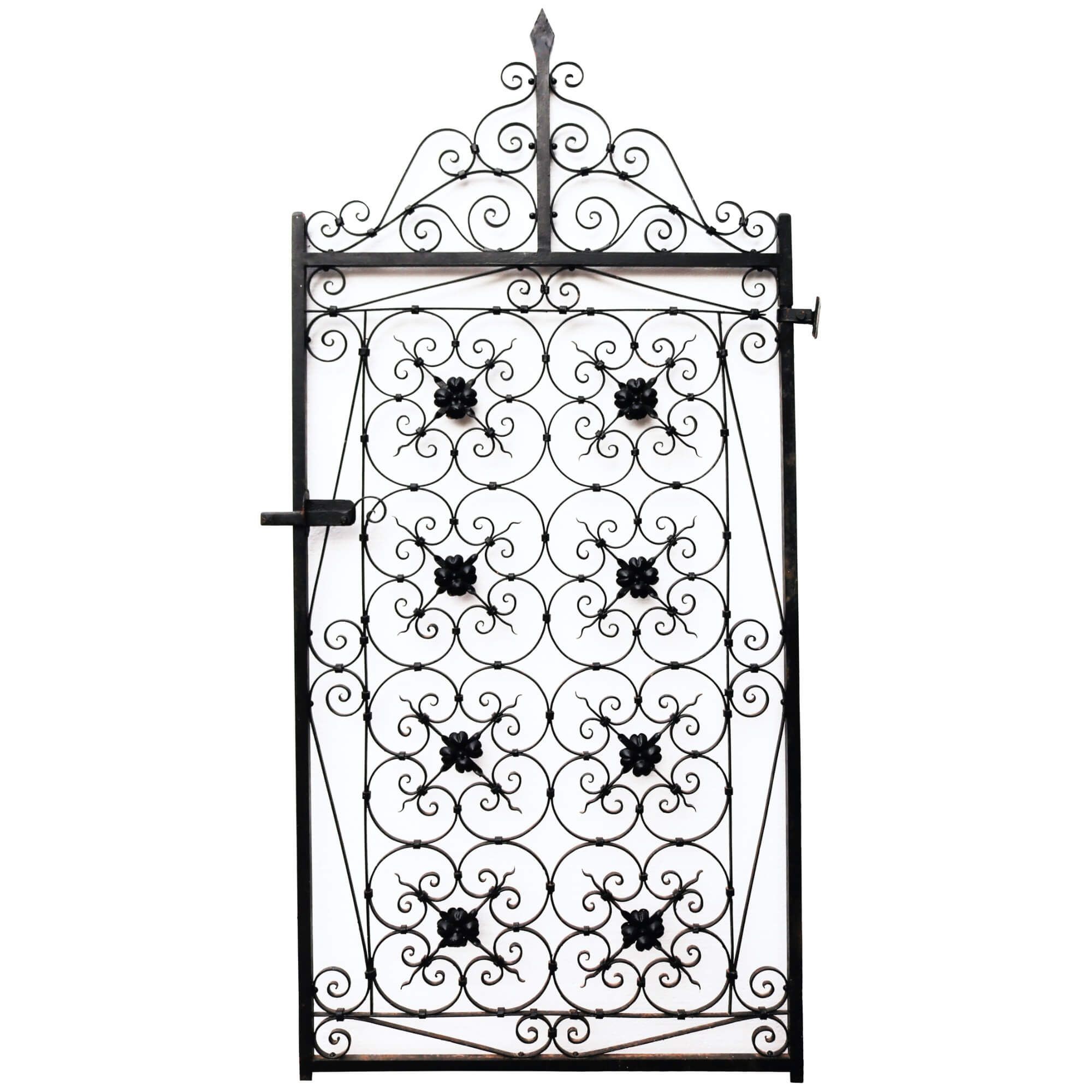 back to topDetailed with a spearhead finial among scrolling details to the top, this ornately crafted antique wrought iron side gate is a striking piece for any garden. It is expertly crafted with quatrefoils and flowers, showcasing the talent of the 19th century blacksmith. This beautiful antique gate is in good condition, fitted with its original working latch and parts of its original hinges.
