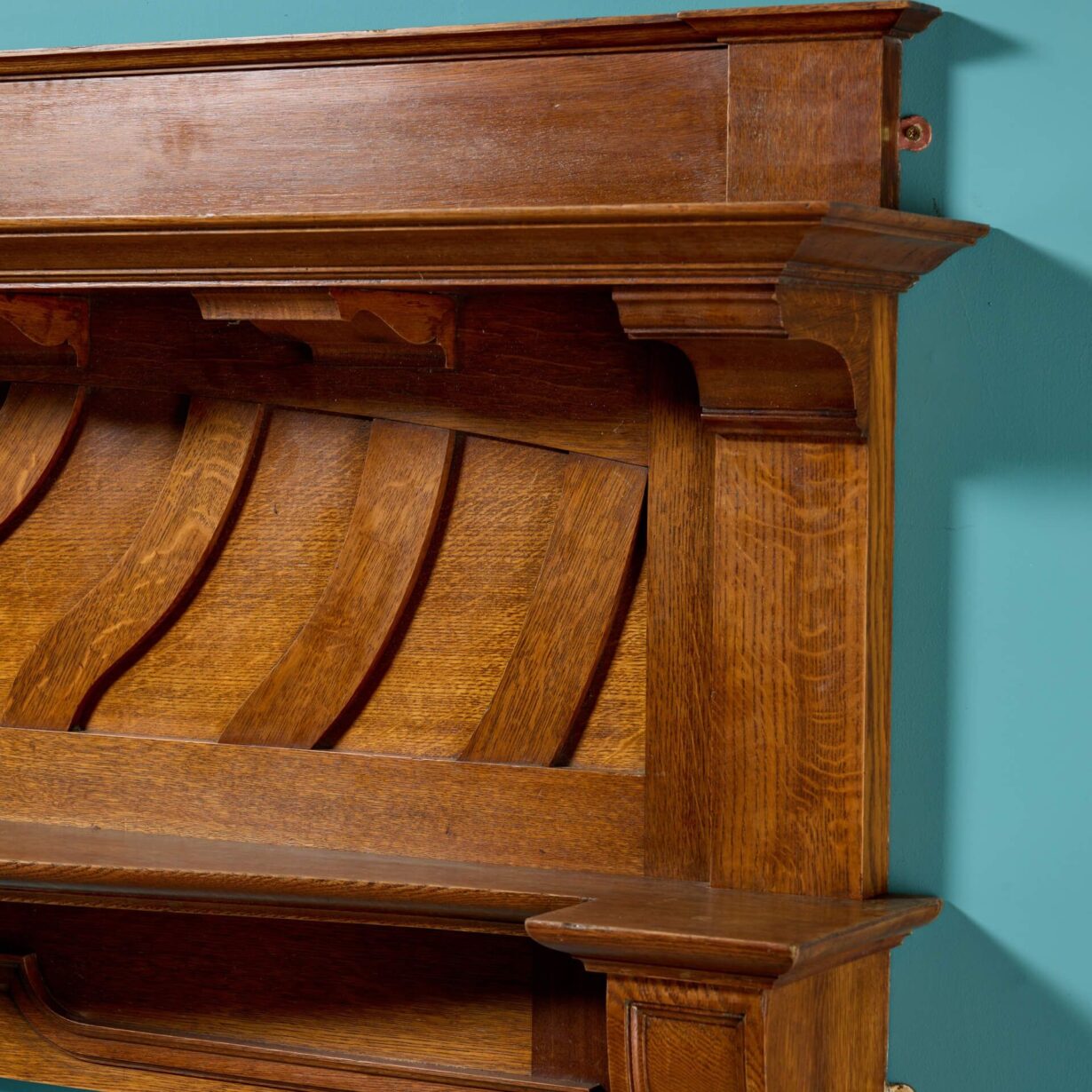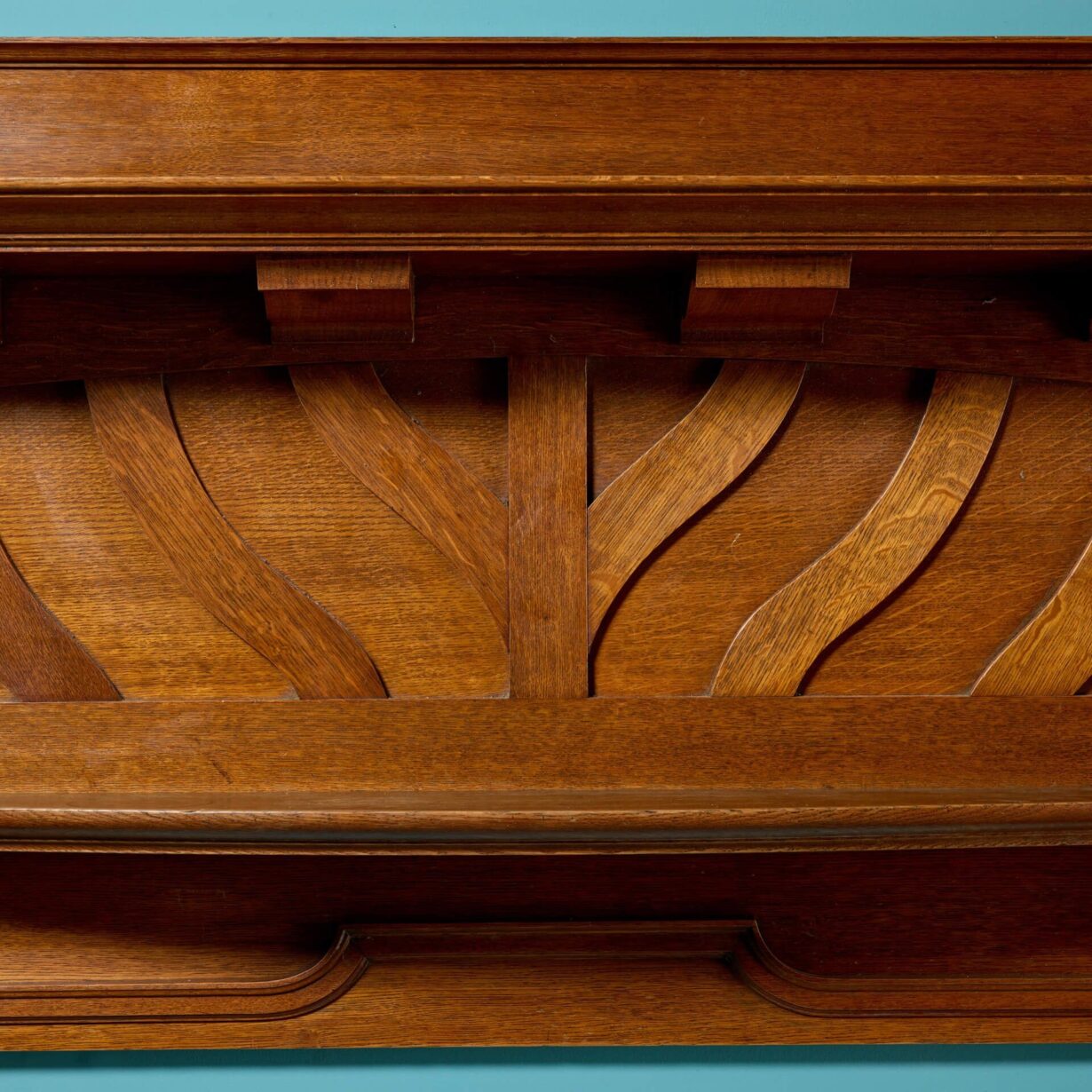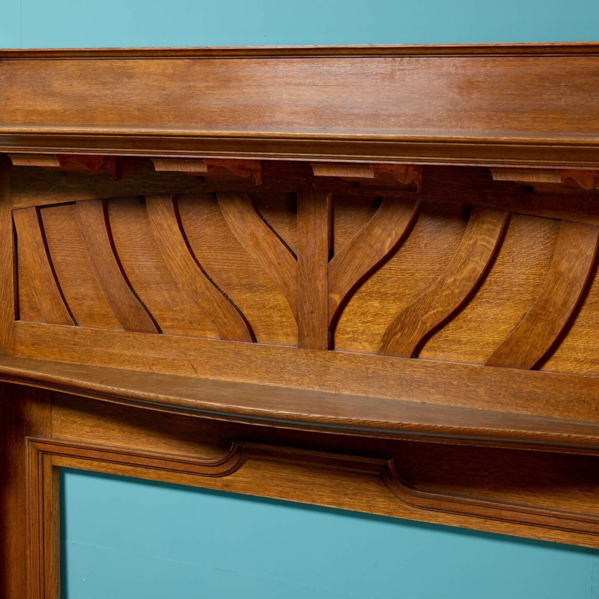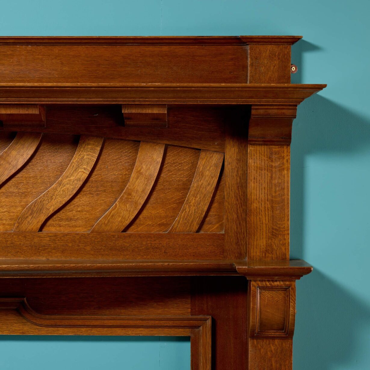 back to topA striking yet elegant quality English oak Arts and Crafts fireplace with a rich golden colour dating from the early 20th century. Tall and imposing, this antique fire surround unusually has two shelves, the lower of which is defined by a smooth curve, providing plenty of surface space for display items and decor. Evocative of the era, the frieze is subtly decorated with a series of sweeping panels that bring a sense of elegance to this Arts and Crafts fireplace, making an understated addition to any room.
