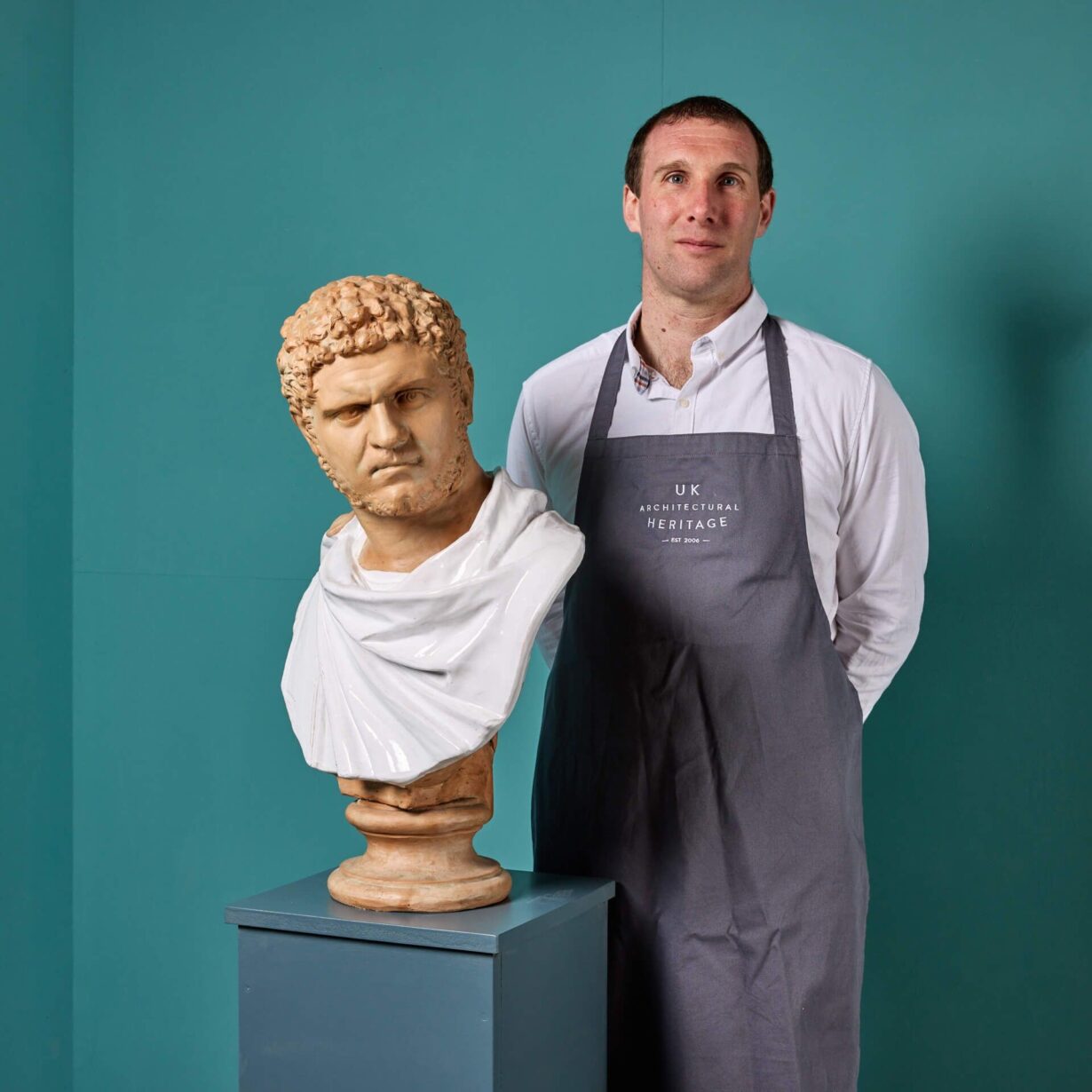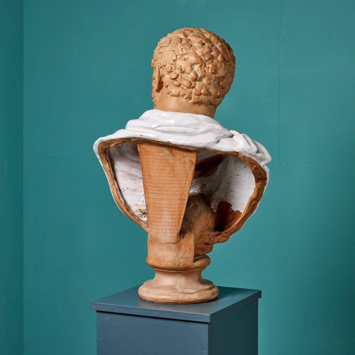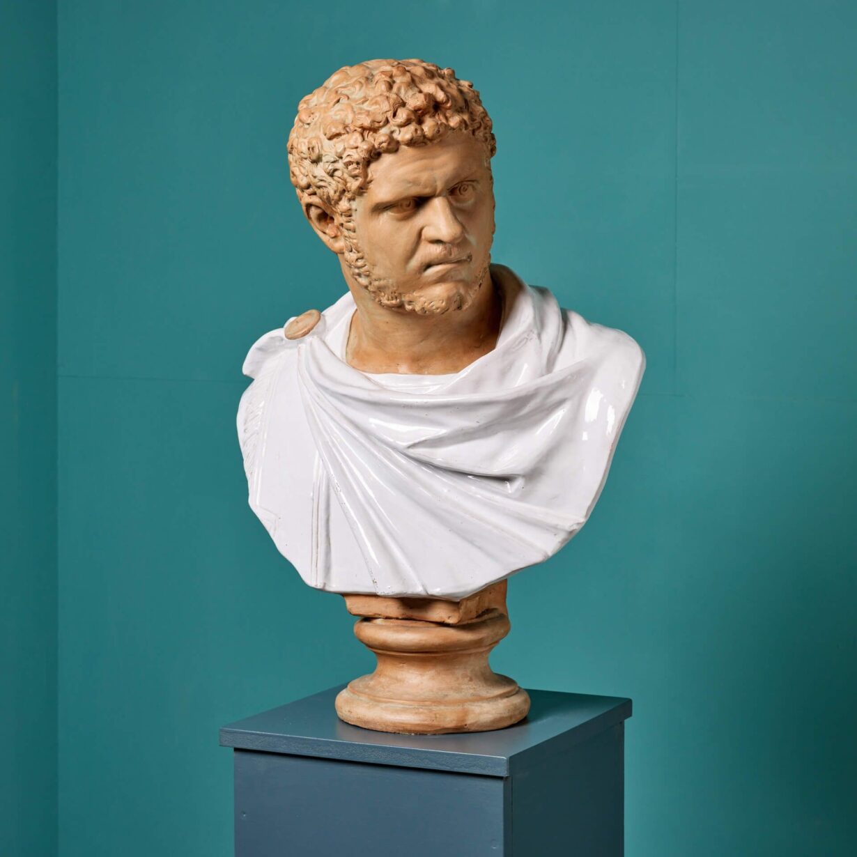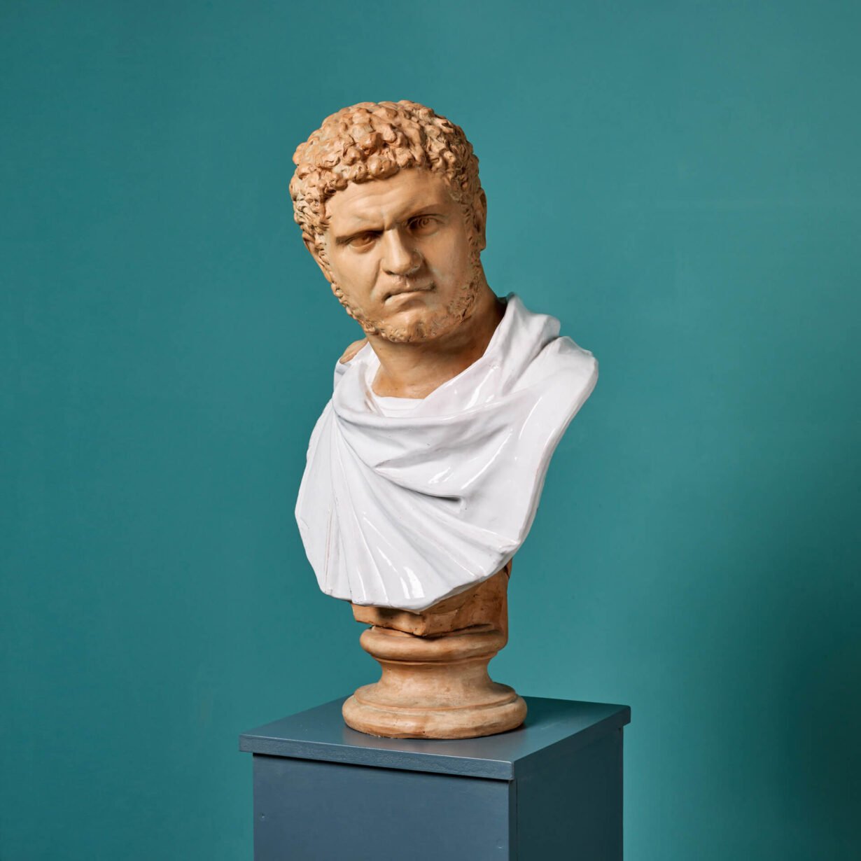 back to topA terracotta portrait bust of Caracalla, Roman Emperor from 198 to 217 AD. The Emperor is depicted in expressive detail and wears a swathed toga which is glazed in white for a striking colour contrast. Similar portrait busts, showing Caracalla with cropped hair, stubble beard and a menacing glare, are found on display in museums across the globe including The Metropolitan Museum of Art, New York and The St. Louis Art Museum, Missouri.