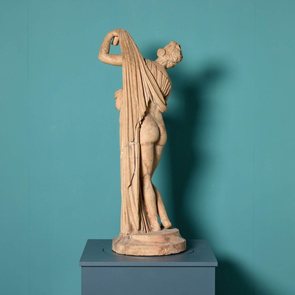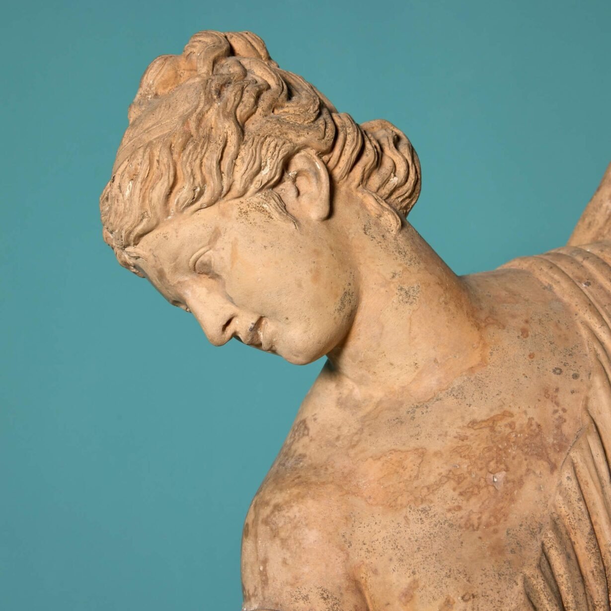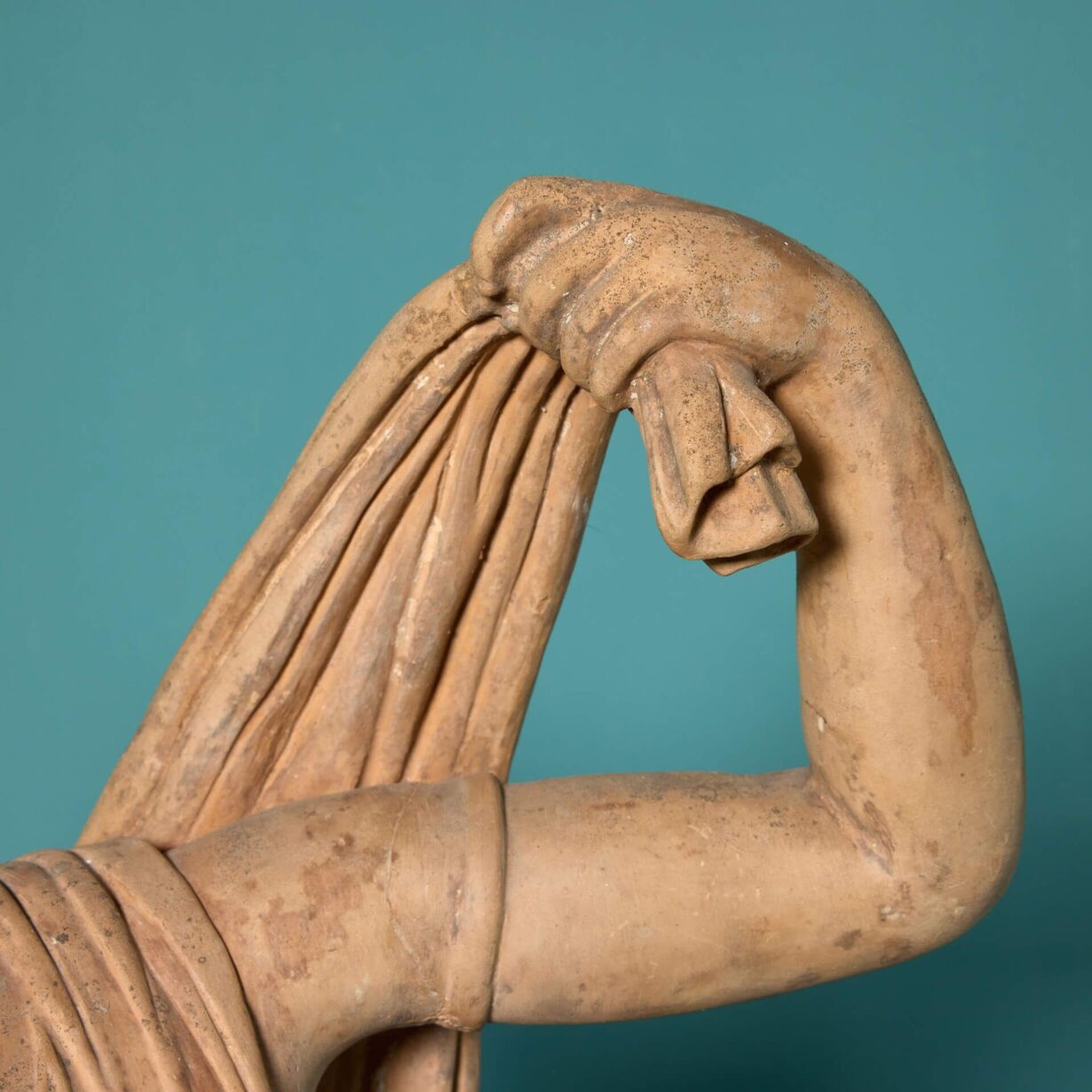 back to topA late 19th century French terracotta figure of the Callipygian Venus, after the antique. Also known as the Venus Callipyge or Aphrodite Kallipygos, the Callipygian Venus literally means “Venus of the beautiful buttocks” and was often referred to as Venus leaving the bath throughout the 17th and 18th centuries. This 19th century terracotta statue attributed to J. Garouste is a beautiful depiction of the larger than life-size marble antique, capturing the elegance and grace of the Roman goddess of love and beauty.