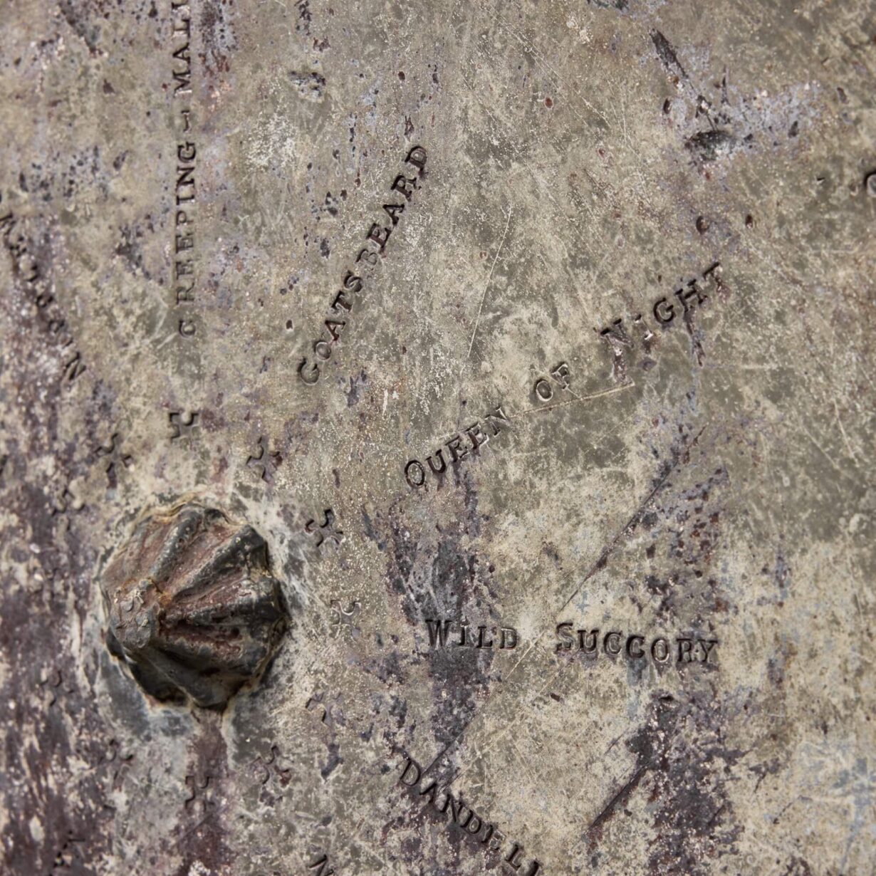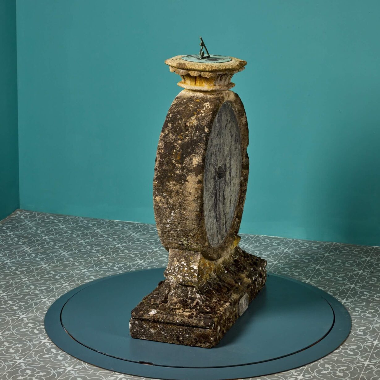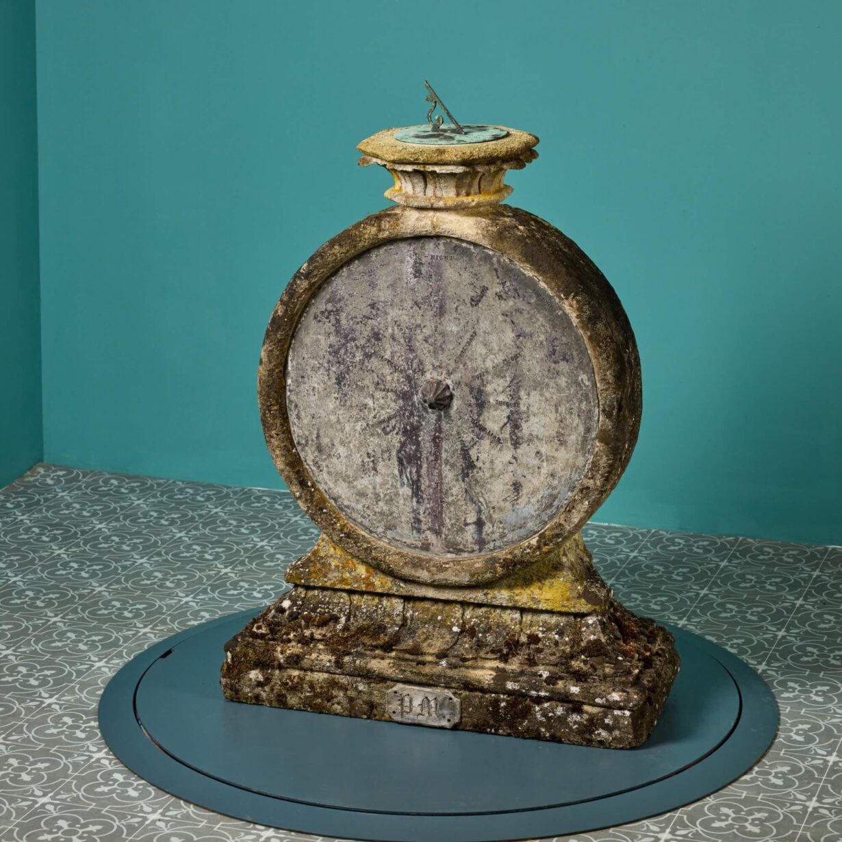 Resembling the shape of a pocket watch, this antique garden sundial sits on a carved limestone base and features a lead insert on both sides above the markings AM and PM. Though weathered through time by the elements, inscriptions of names of flowers and botanical plants remain present, projecting outwards and clockwise in the shape of a clock.