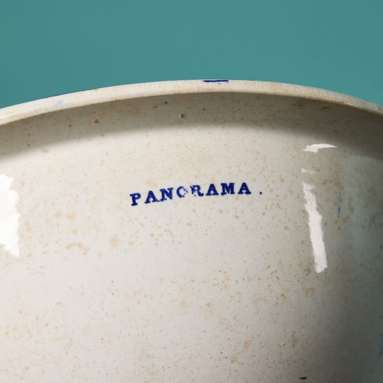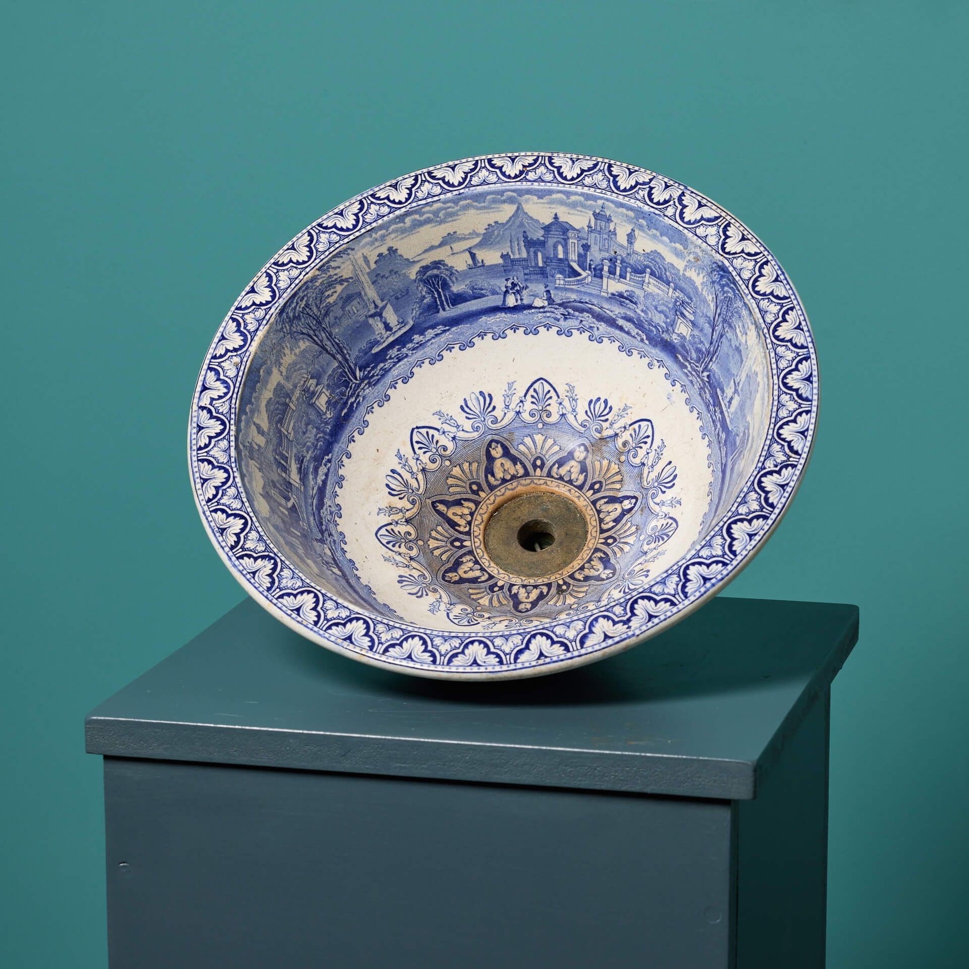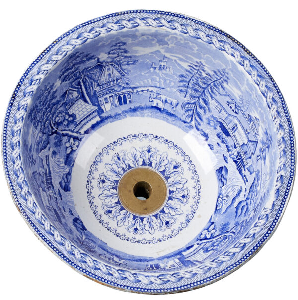 back to topA handsome Victorian blue and white transfer print bowl sink circa 1880. This model is ‘The Panorama’ and is suitable for mounting above a surface or recessed depending on your desired look. Over 140 years old, this beautiful antique sink has stood the test of time for over a century yet looks timeless in period and contemporary homes alike, bringing a vintage look to modern bathrooms.