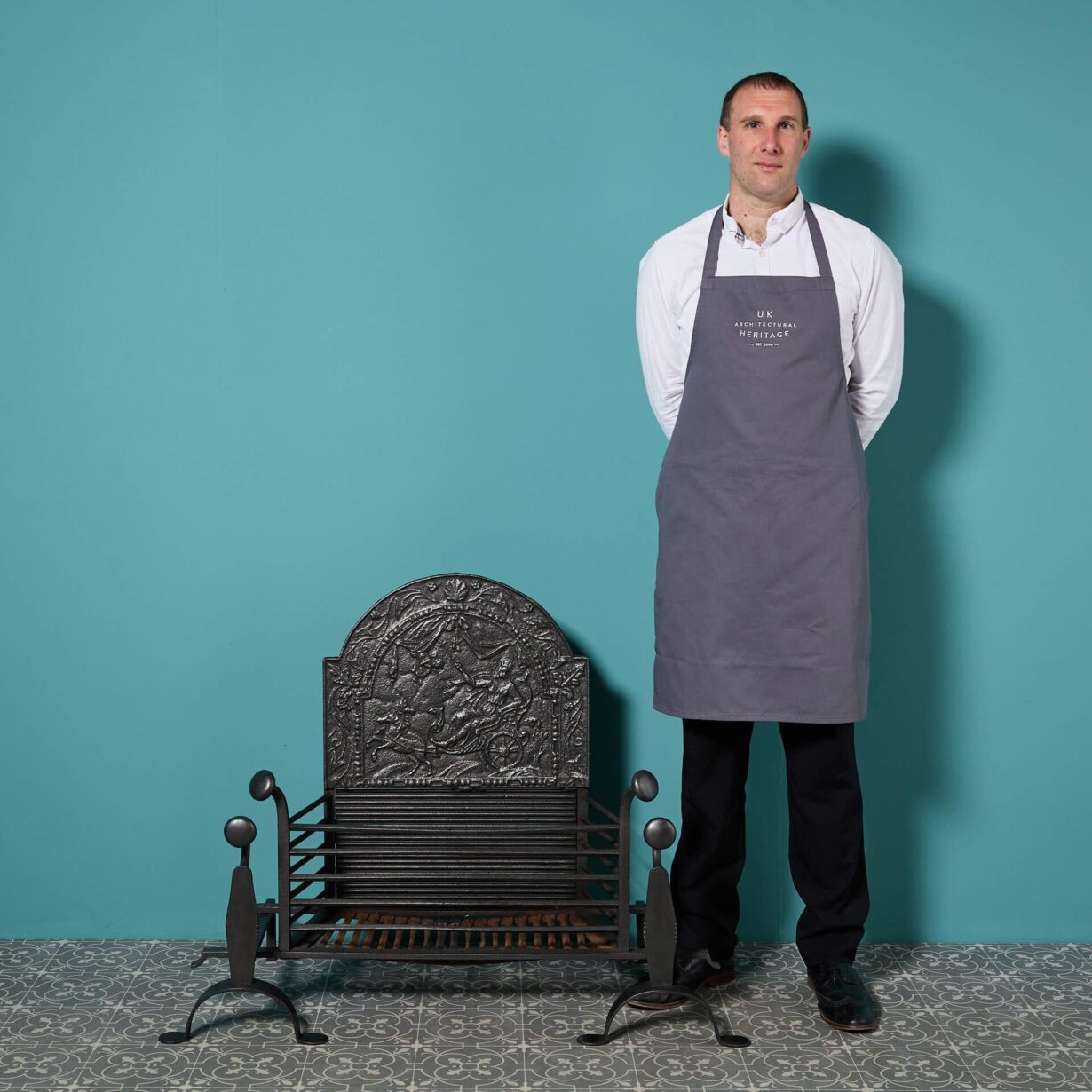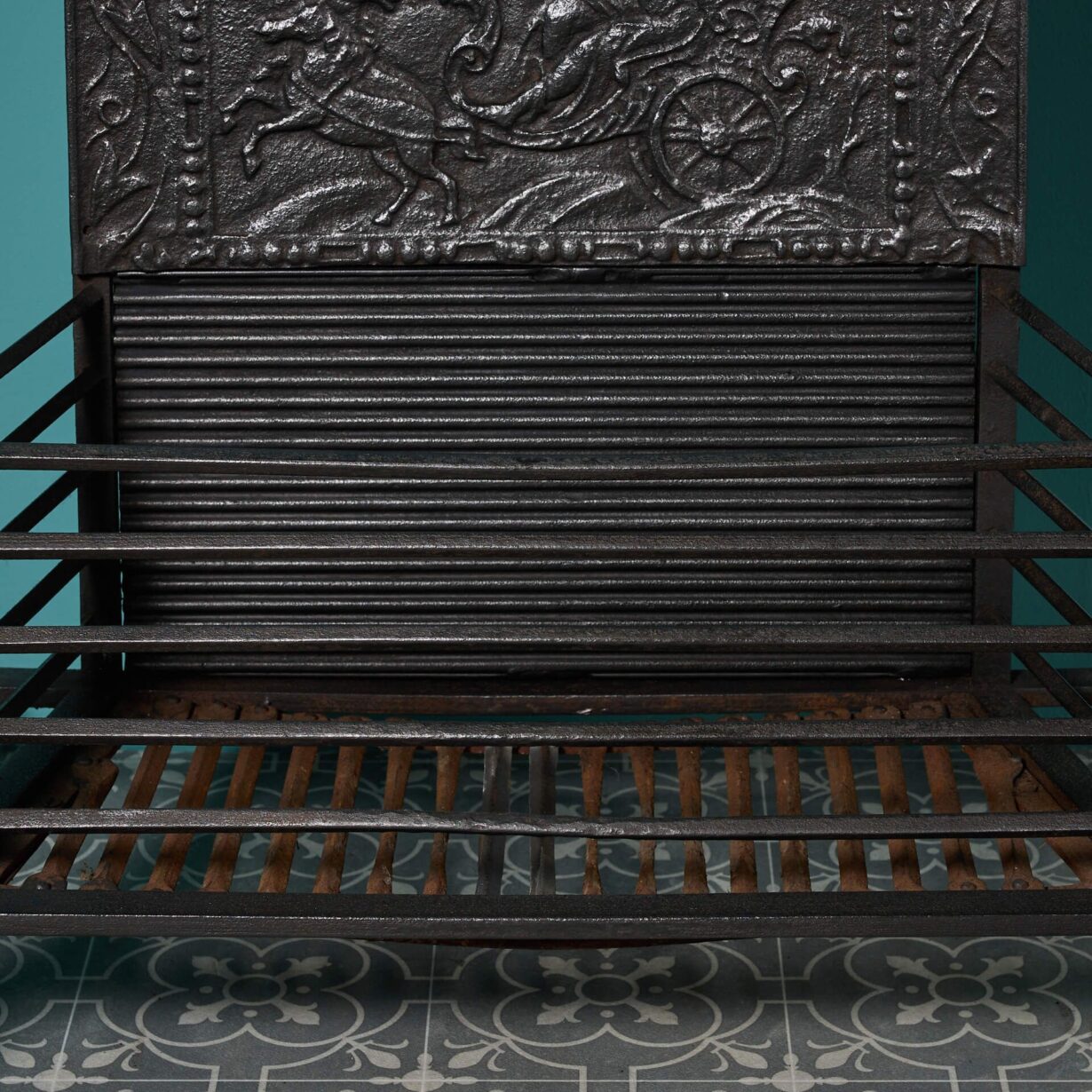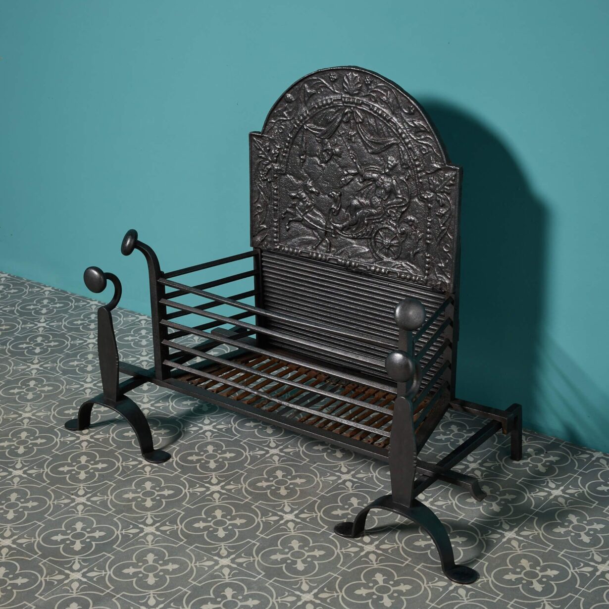 This antique fire grate with two accompanying andirons pairs practicality with style, offering a generously sized basket for burning large logs. Its signature feature is its Tudor/Jacobean style fire back, ornately cast with a royal figure riding a horse-drawn chariot.