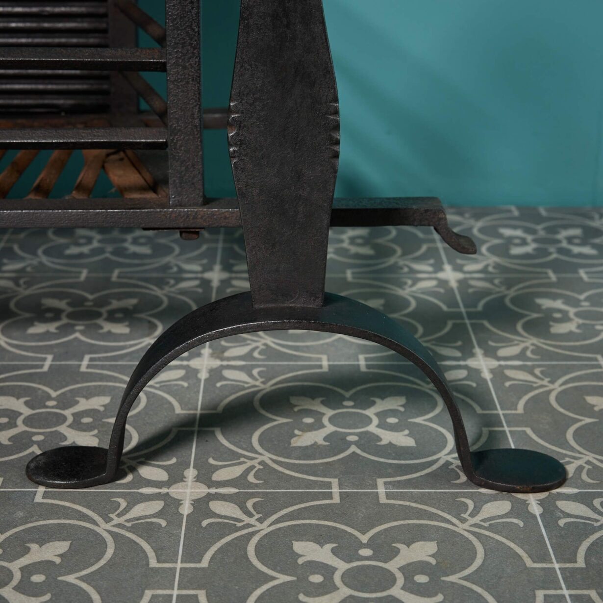back to topAn original Jacobean style wrought and cast iron fire grate on dogs by Thomas Elsley (stamped), British manufacturers of cast iron decorative works between 1882 and 1905.