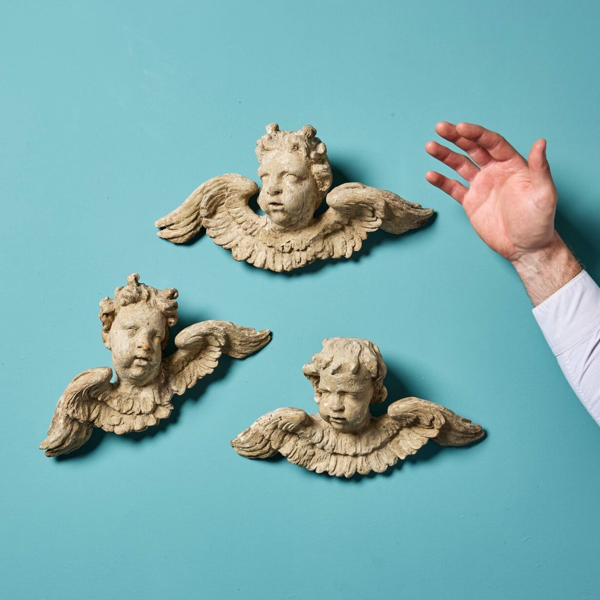 back to topA set of three mid 18th century baroque style polychrome cherubs, each with hooks to the reverse. Ready for hanging on an interior wall as desired.