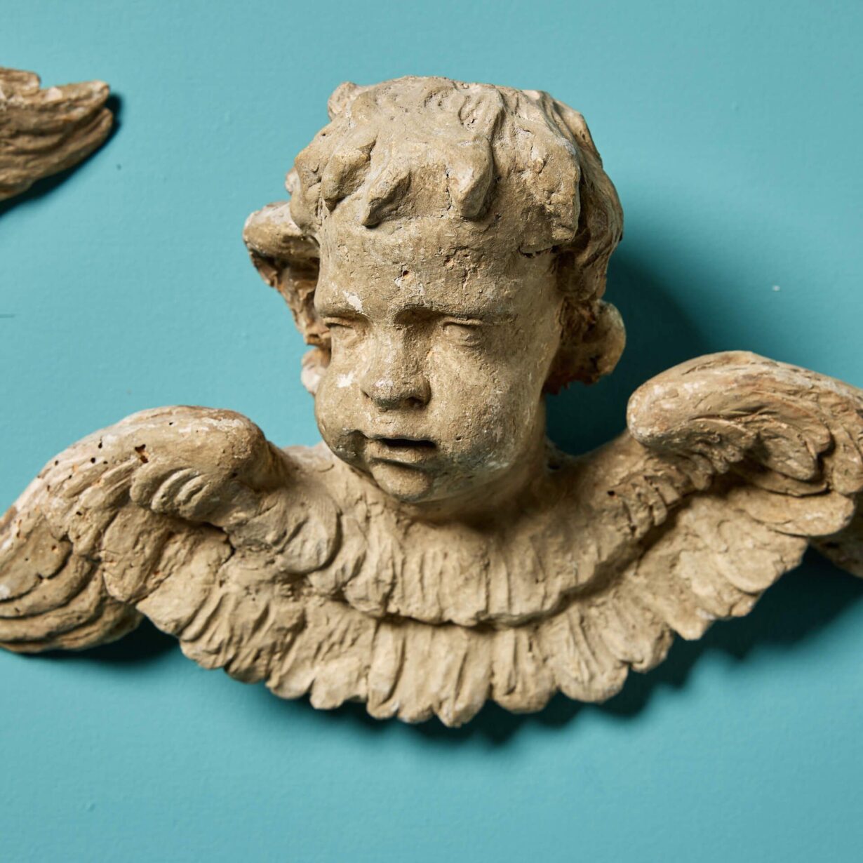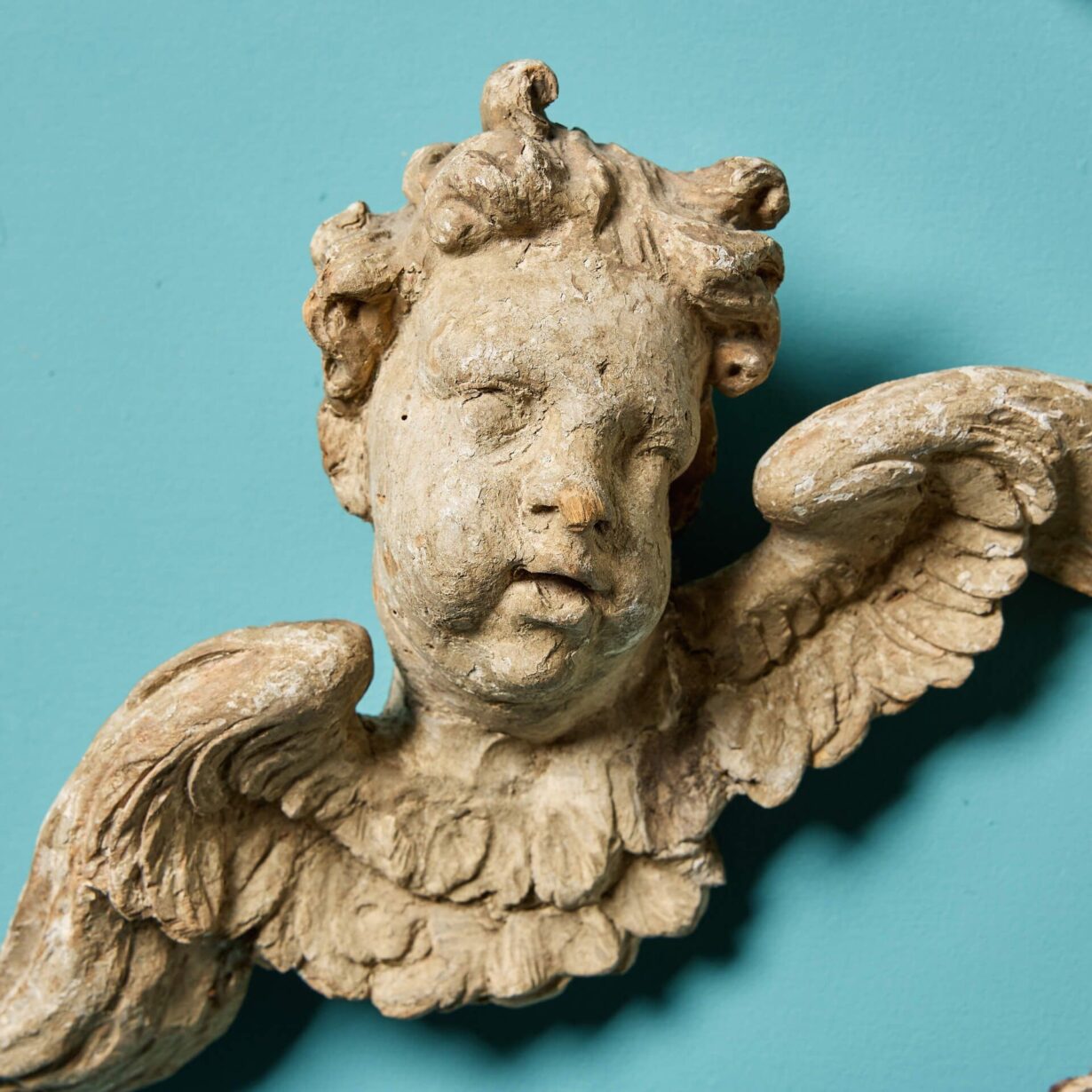 Over 270 years old, these quaint antique cherubs have an aged, timeworn look that tells the story of past centuries. They are carved from pine or limewood with a painted polychrome finish.