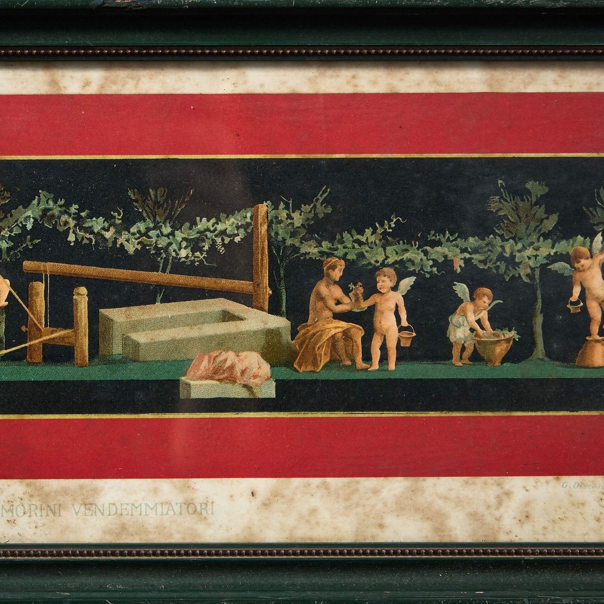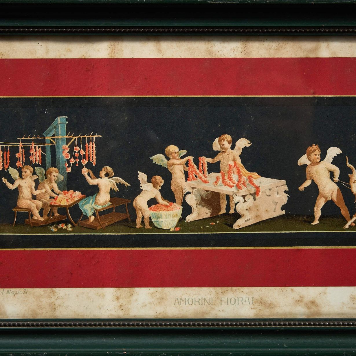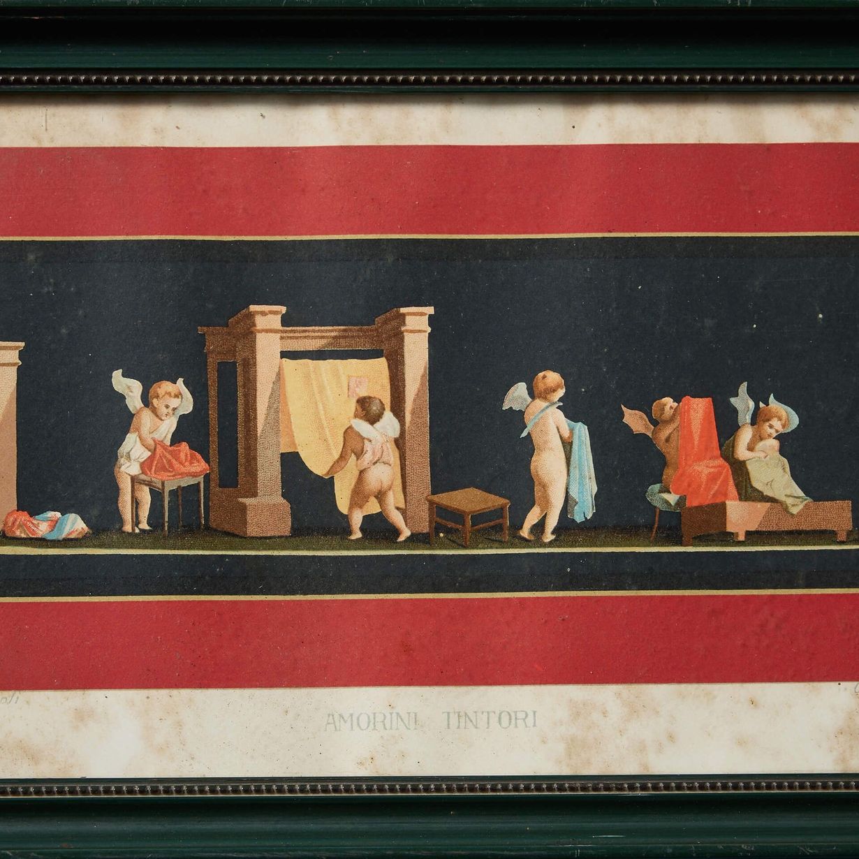 back to topA set of three 19th century Geramia Discanno hand coloured lithographs, captured from the walls of Pompeii. The frescoes are believed to be prints from a book published in 1890 by one of Italy’s oldest companies in the fine art sector, which still operates to this day. The original Negenborn and Bowinkel fine art store was founded in 1879, on Via Chiatamone, Naples.