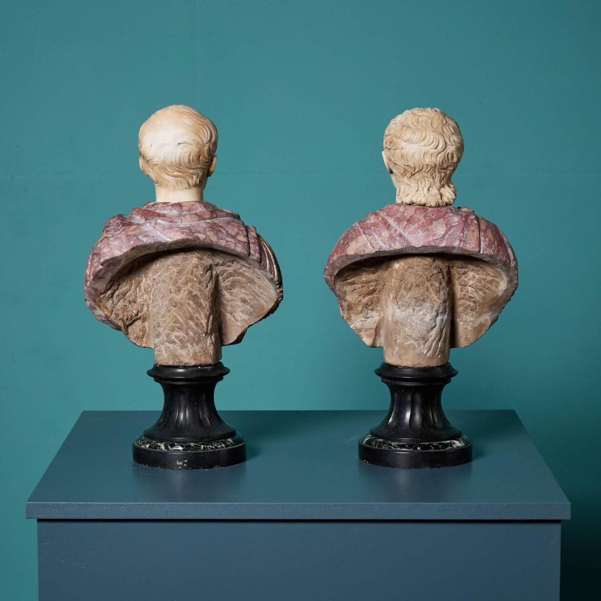 Carved with white marble heads and variegated marble attire to their shoulders, these two 18th century Italian busts inspired by Roman history are a striking pair for a console or mantelpiece, each elevated by a later 19th century black and green marble socle.