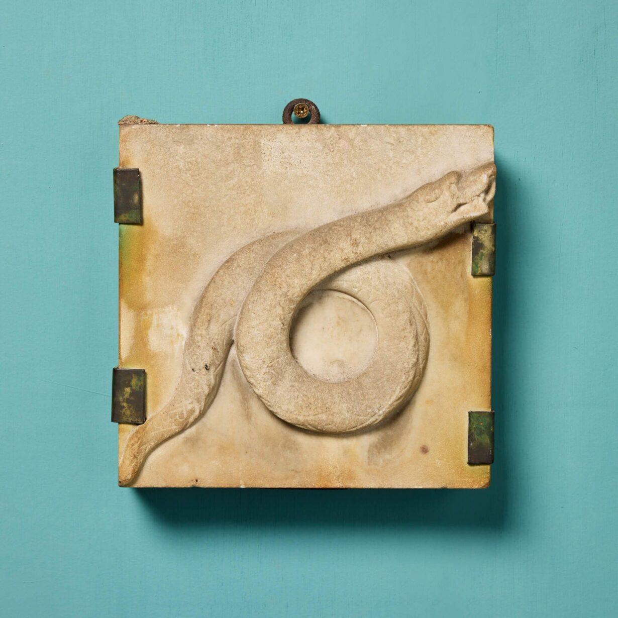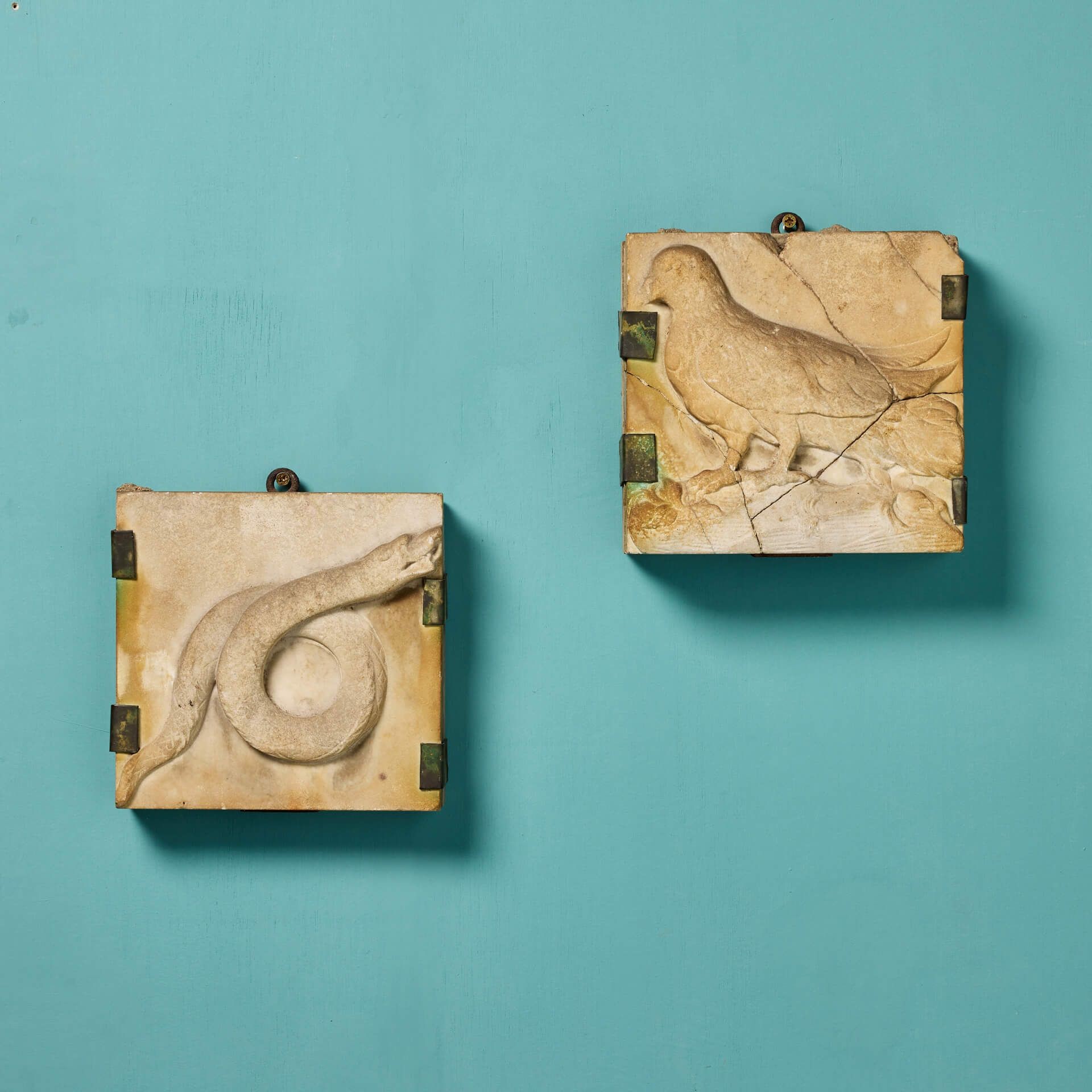 back to topA pair of interesting ancient Greek style statuary marble relics or wall plaques, depicting a serpent and dove in relief.