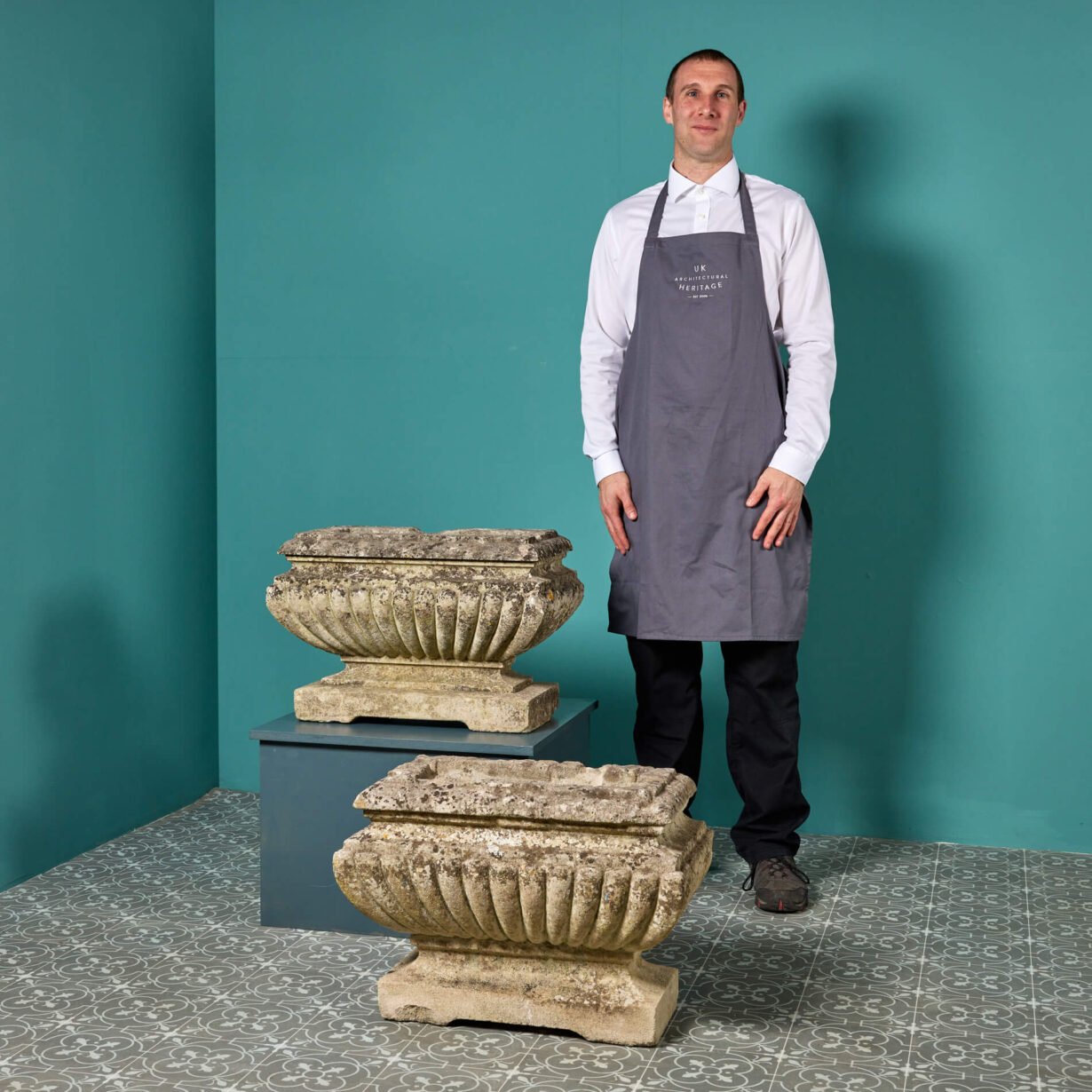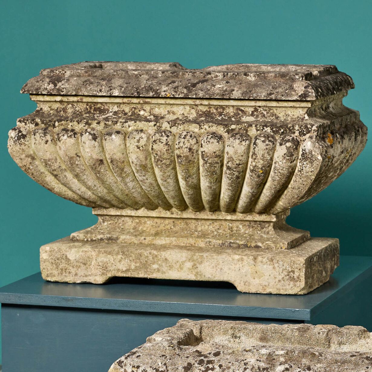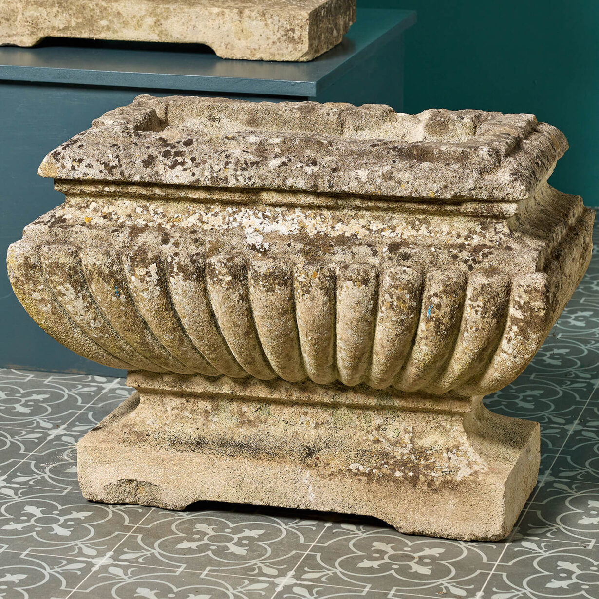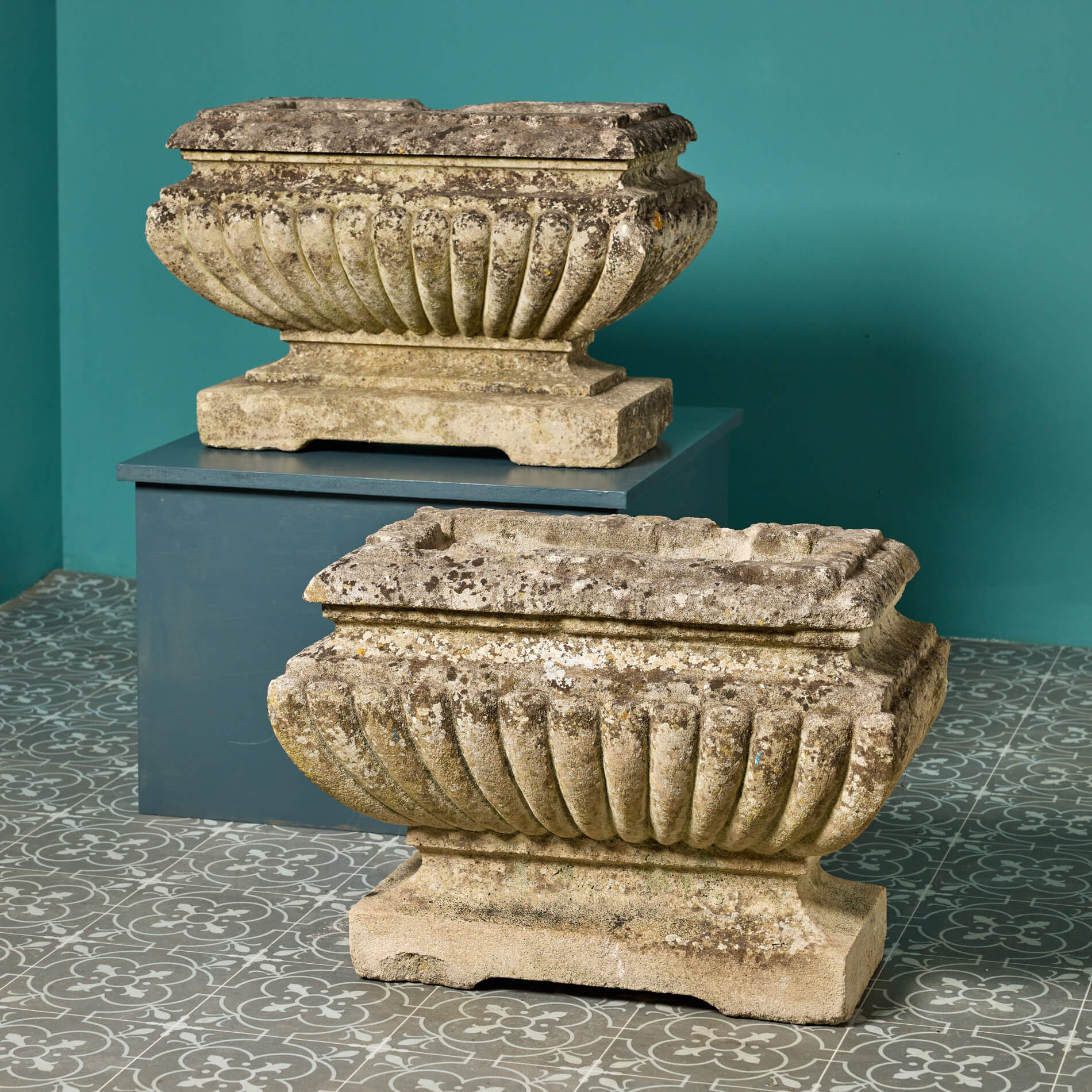 back to topA magnificent set of 2 aged limestone planters dating from the early 1830s. They are a very near pair with a large scale, differing in height by only a few centimetres (see below for exact dimensions of each). Made in limestone, these antique trough planters are handcrafted with beautifully formed gadrooned detailing and short sweeping pedestal bases. But what makes these planters particularly handsome is the surface weathering. Only exposure to the elements over hundreds of years can such a patina of weathering be achieved. They look beautiful placed in an English country garden or period townhouse courtyard planted with an abundance of flowers.