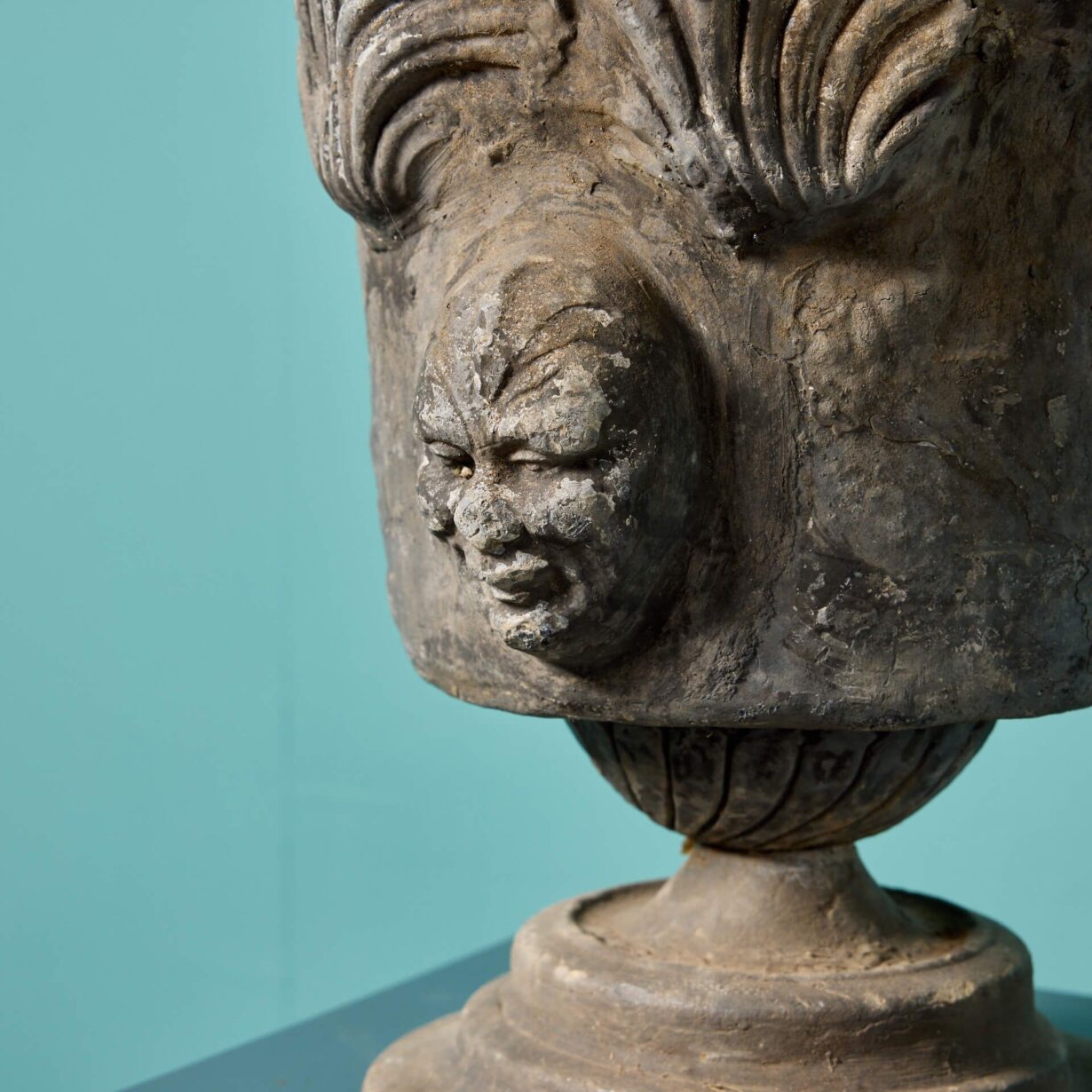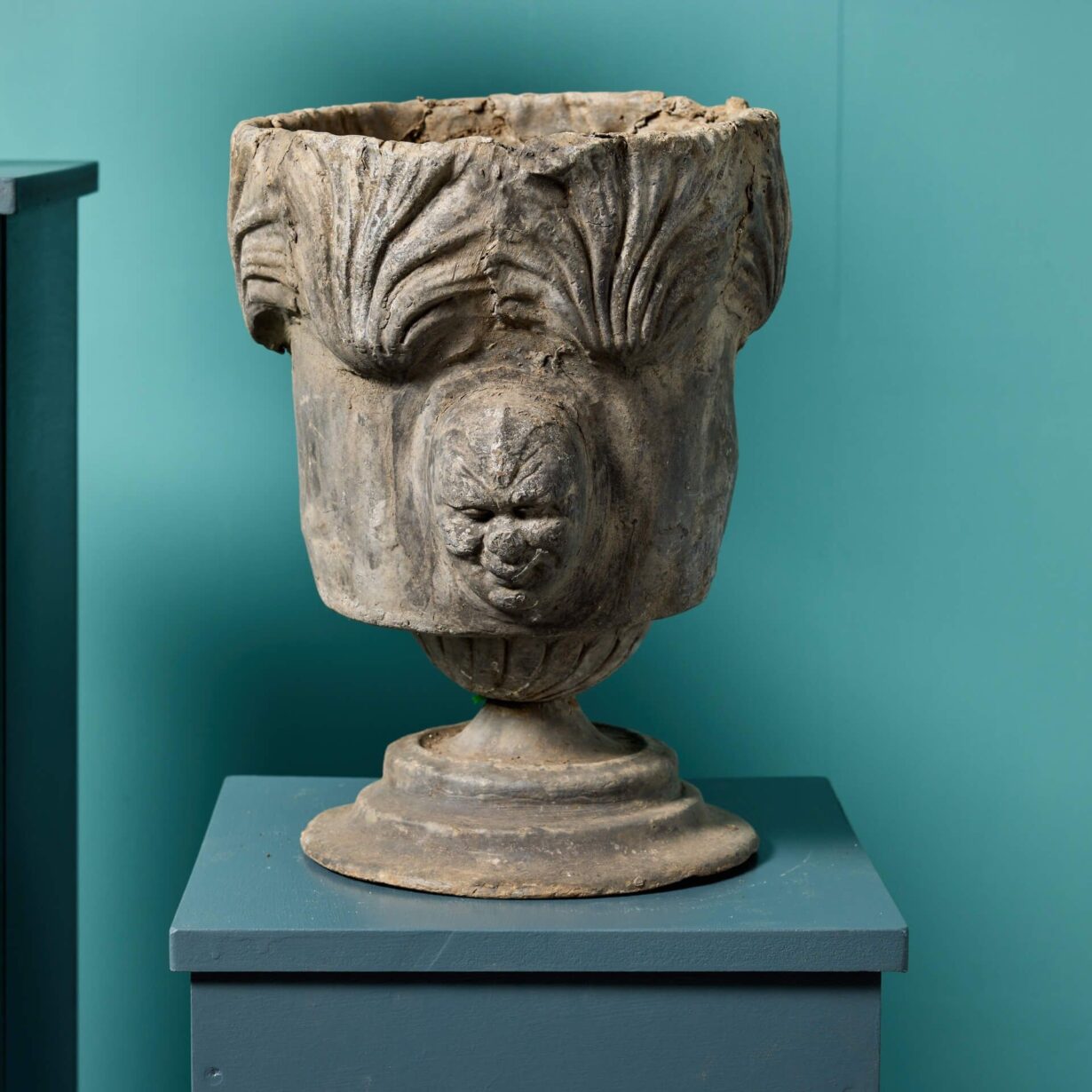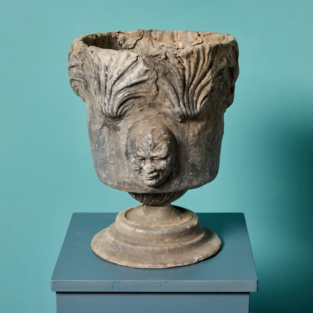 back to topTwo antique Georgian style garden urns or planters made from cast lead circa 1800. These unusual antique urns are of a matching design, each decorated with masks to the front and standing on round socle bases. Dating from the Georgian period, each is over 220 years old and offers a glimpse into the craftsmanship of early 19th century England.