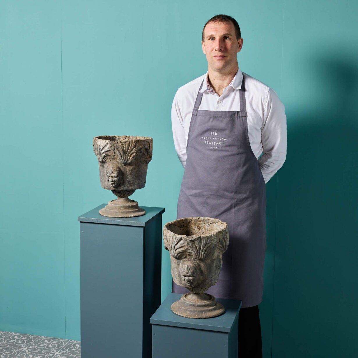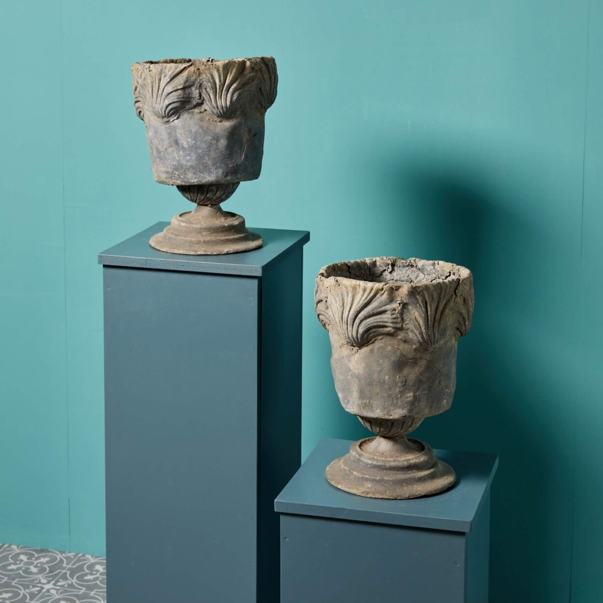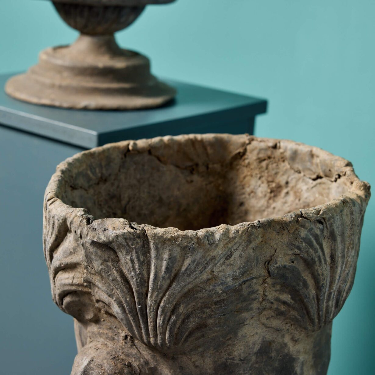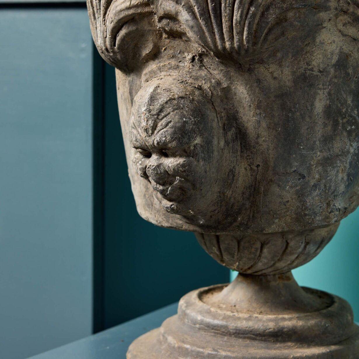 back to topTwo antique Georgian style garden urns or planters made from cast lead circa 1800. These unusual antique urns are of a matching design, each decorated with masks to the front and standing on round socle bases. Dating from the Georgian period, each is over 220 years old and offers a glimpse into the craftsmanship of early 19th century England.