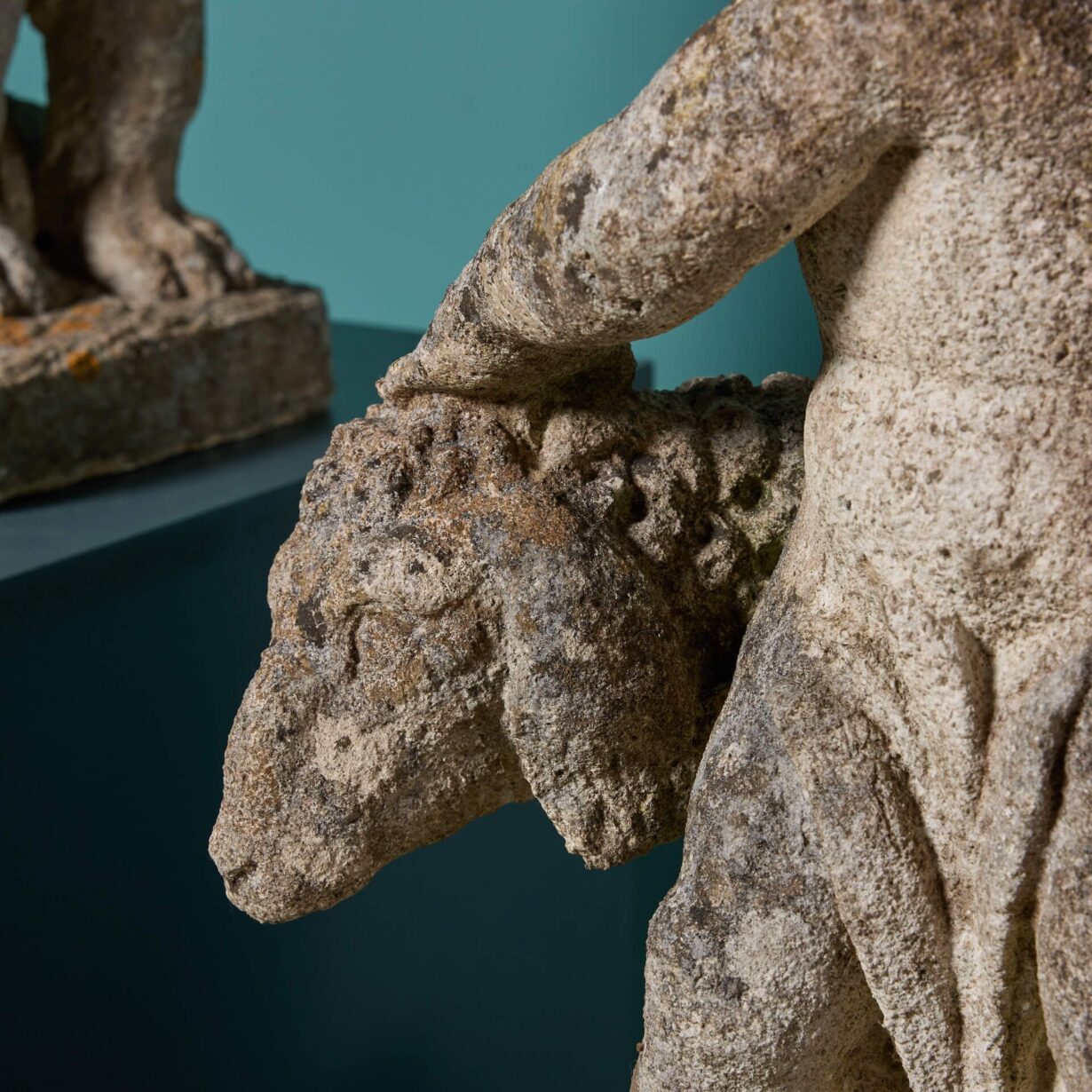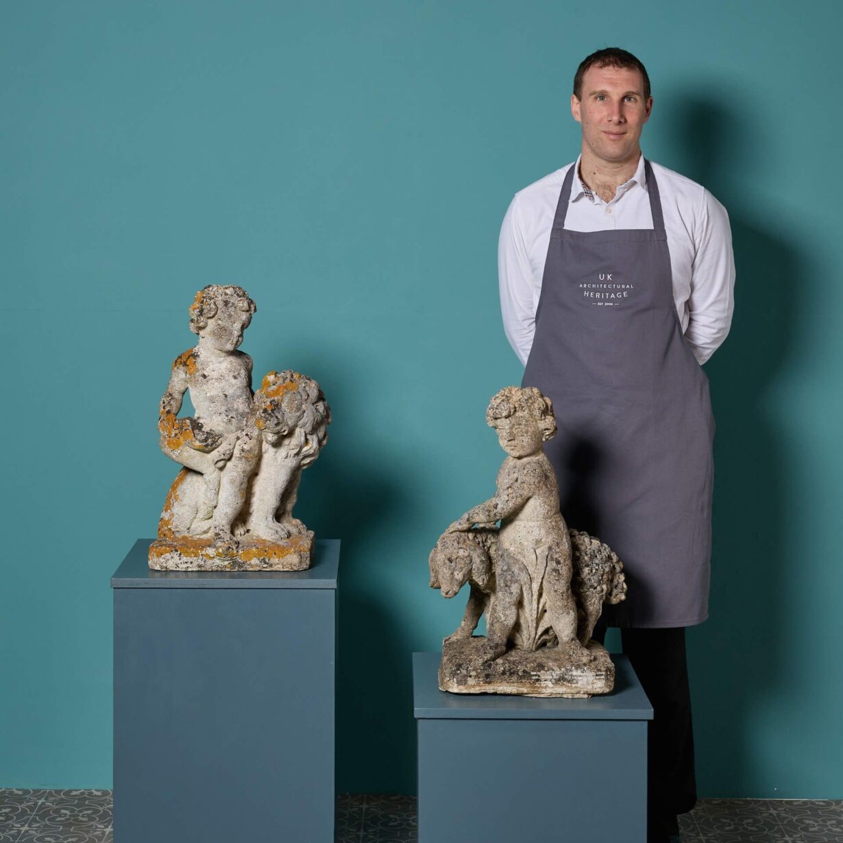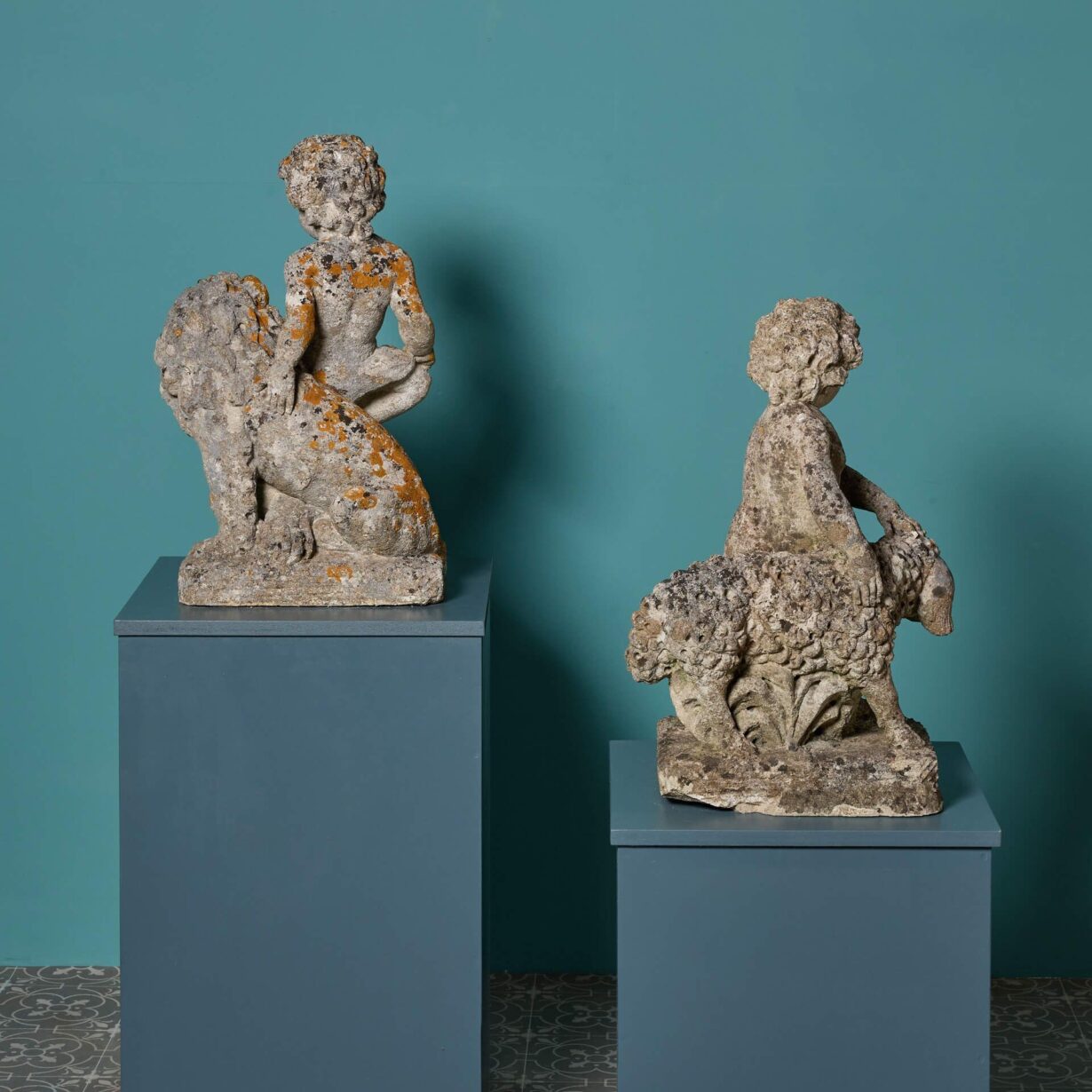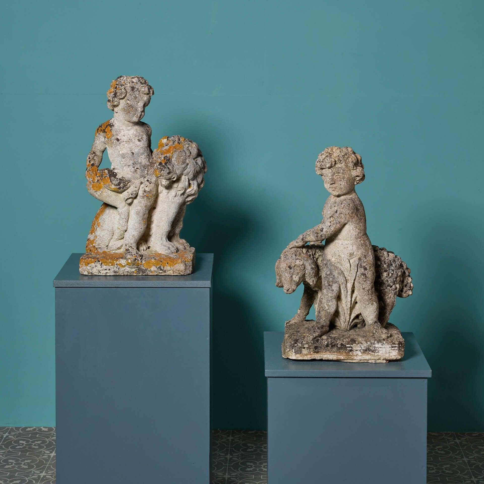 The putti, lion and sheep are brilliantly carved, the weathering only enhancing each sculpture’s detail. From the locks of hair on each putti’s head to the curling wool of the sheep, these are simply charming antique garden ornaments for your flowerbed or design scheme.