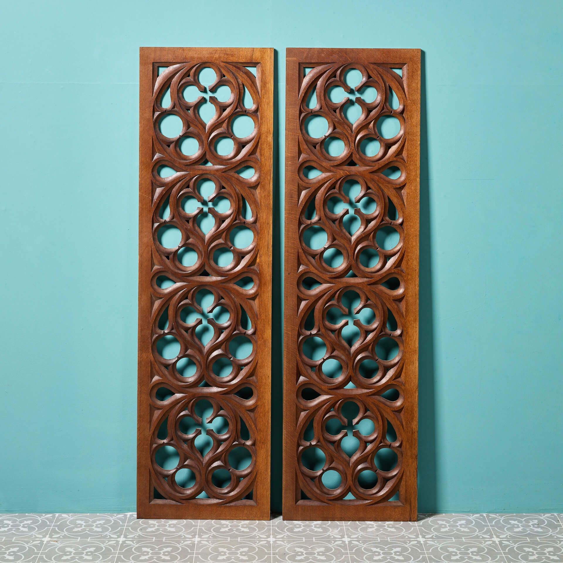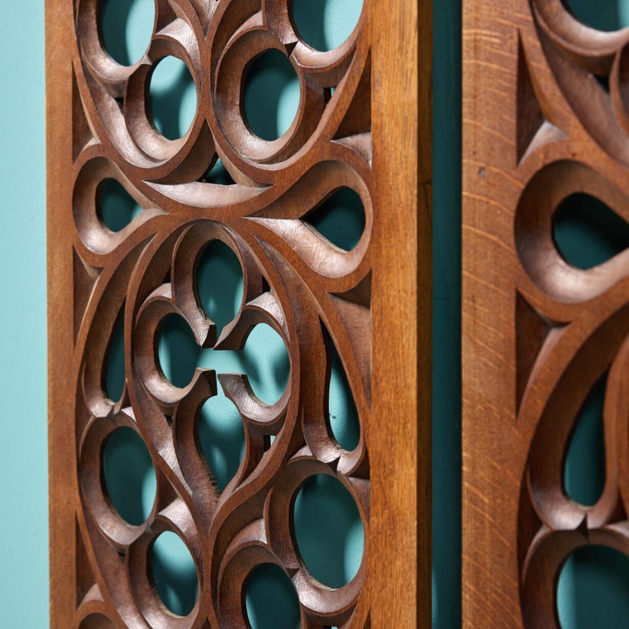 back to topThis pair of beautifully antique carved oak panels would’ve once formed part of a rood screen in a church, separating the nave from the chancel. Dating from the late 19th century, each tall panel is richly carved by hand to one side in a typical ecclesiastical manner. In the 21st century, the pair make a beautiful wall feature in a period property, the rich oak colour looking striking on a neutral backdrop or as decorative panels in a converted chapel or barn.