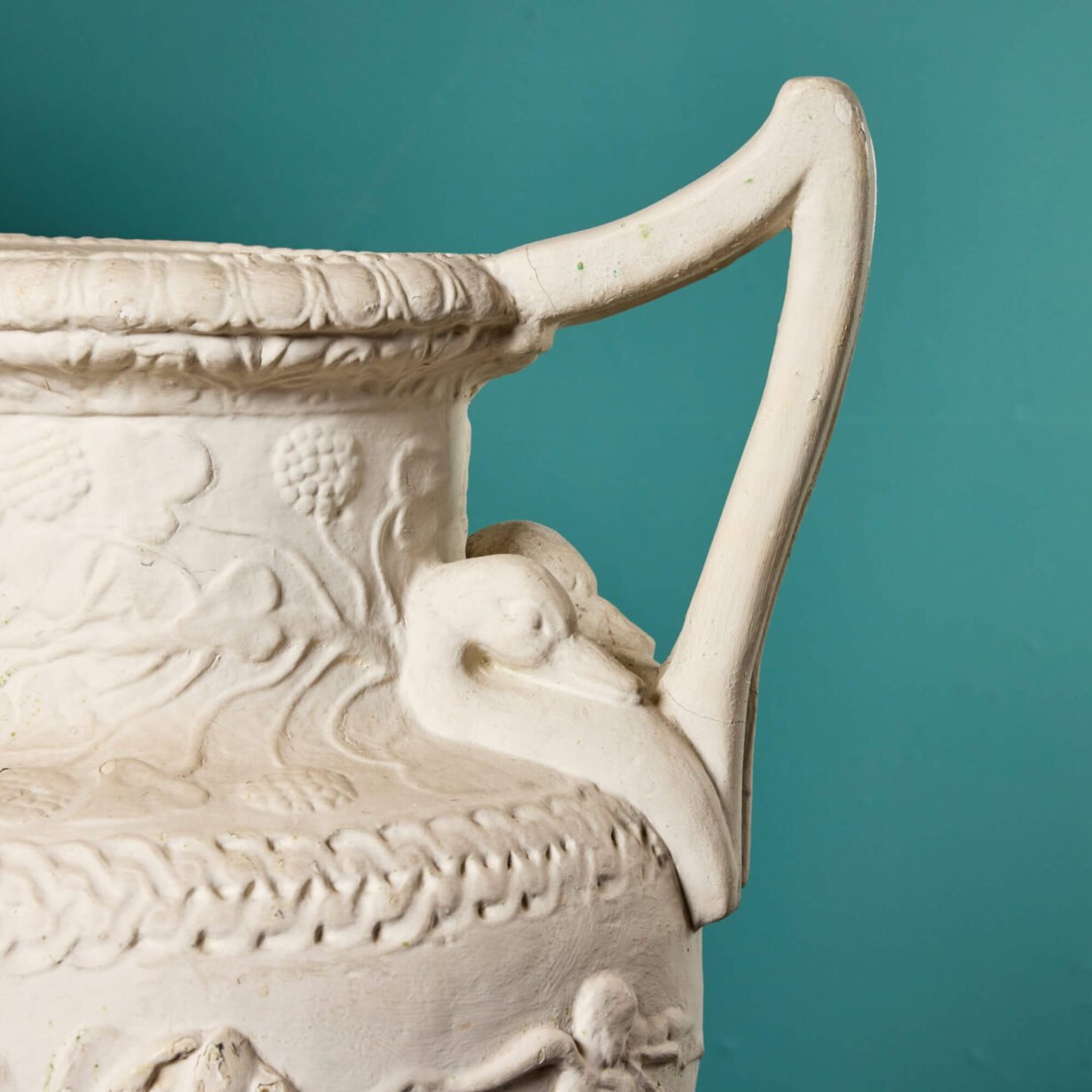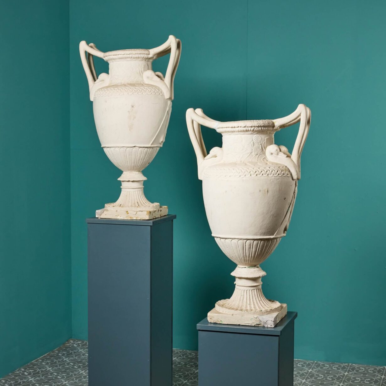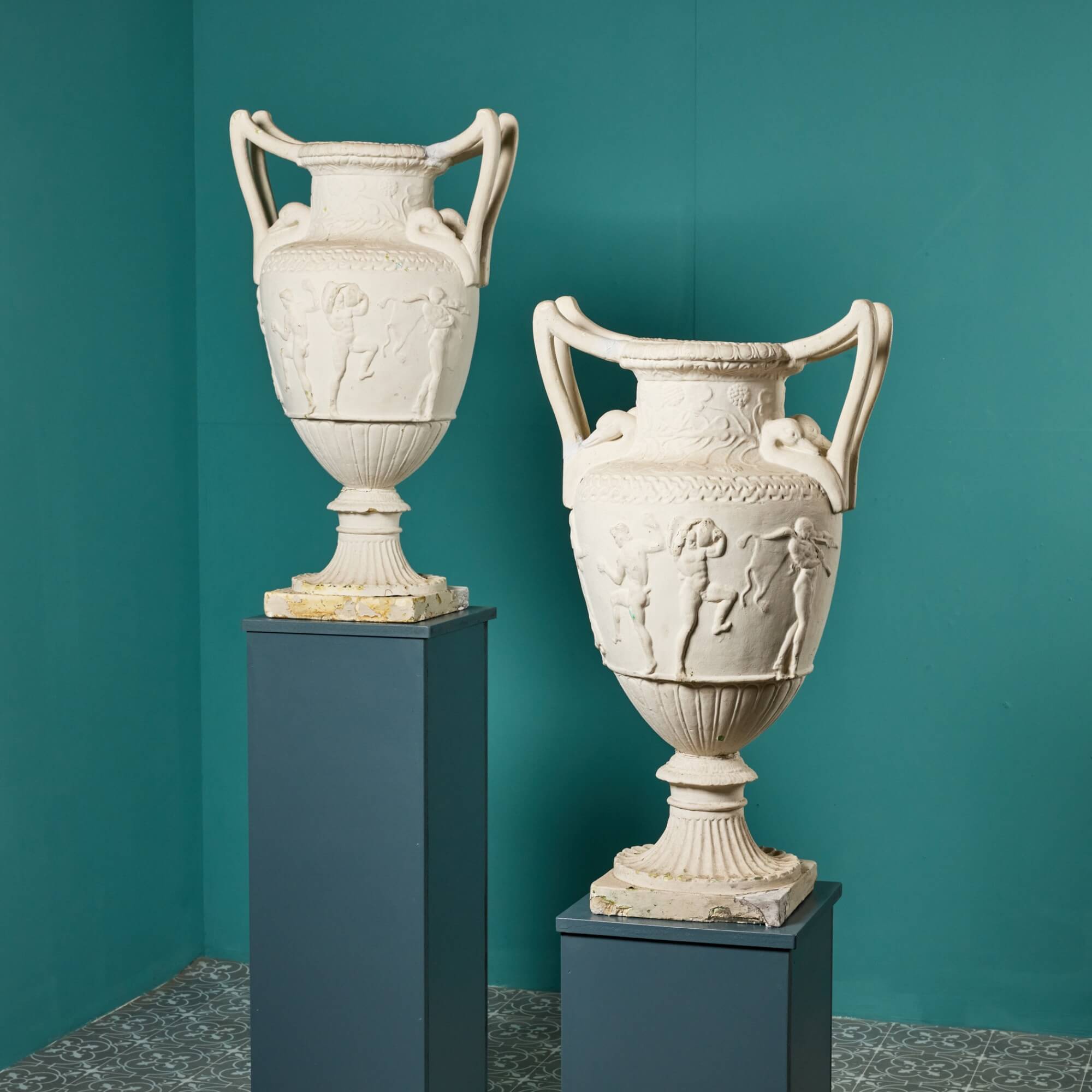 back to topA stunning pair of large Neoclassical vases or urns made in plaster and dating from the middle of the 20th century. These impressive vases have a distinctly Grecian look, ornately detailed in relief with Neoclassical style figures, uniform patterning and unusual swan neck handles. The classical figures decorate one side only while the back is plain. They look particularly striking on plinths or columns, especially either side of a doorway or as decorative objects of interest in a large room. Though inspiration for these plaster vases is unknown, some of the details resemble notable marble vases of history such as the Greek vase by sculptor Sosibios dating from 50 BCE.