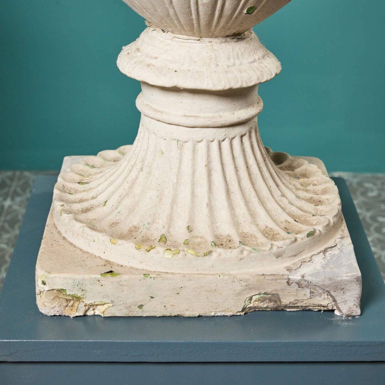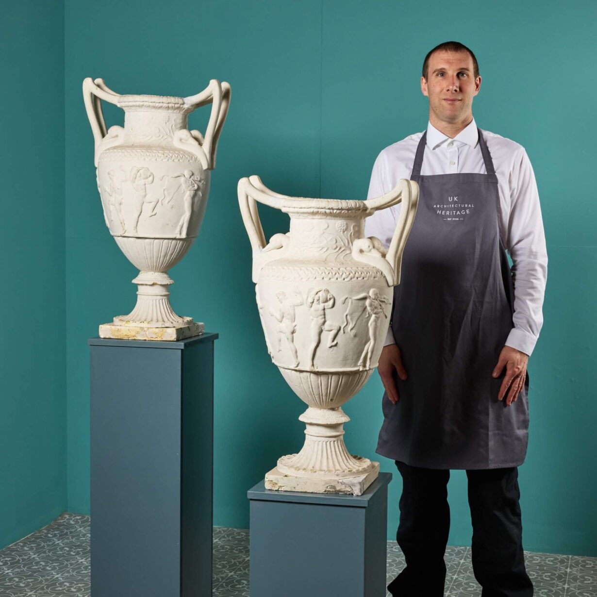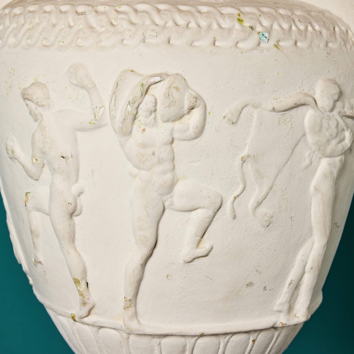 back to topA stunning pair of large Neoclassical vases or urns made in plaster and dating from the middle of the 20th century. These impressive vases have a distinctly Grecian look, ornately detailed in relief with Neoclassical style figures, uniform patterning and unusual swan neck handles. The classical figures decorate one side only while the back is plain. They look particularly striking on plinths or columns, especially either side of a doorway or as decorative objects of interest in a large room. Though inspiration for these plaster vases is unknown, some of the details resemble notable marble vases of history such as the Greek vase by sculptor Sosibios dating from 50 BCE.