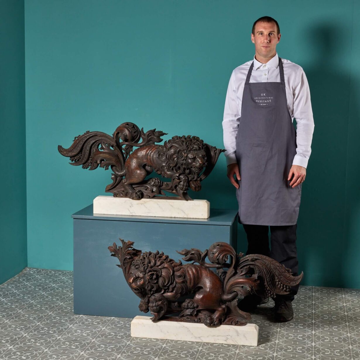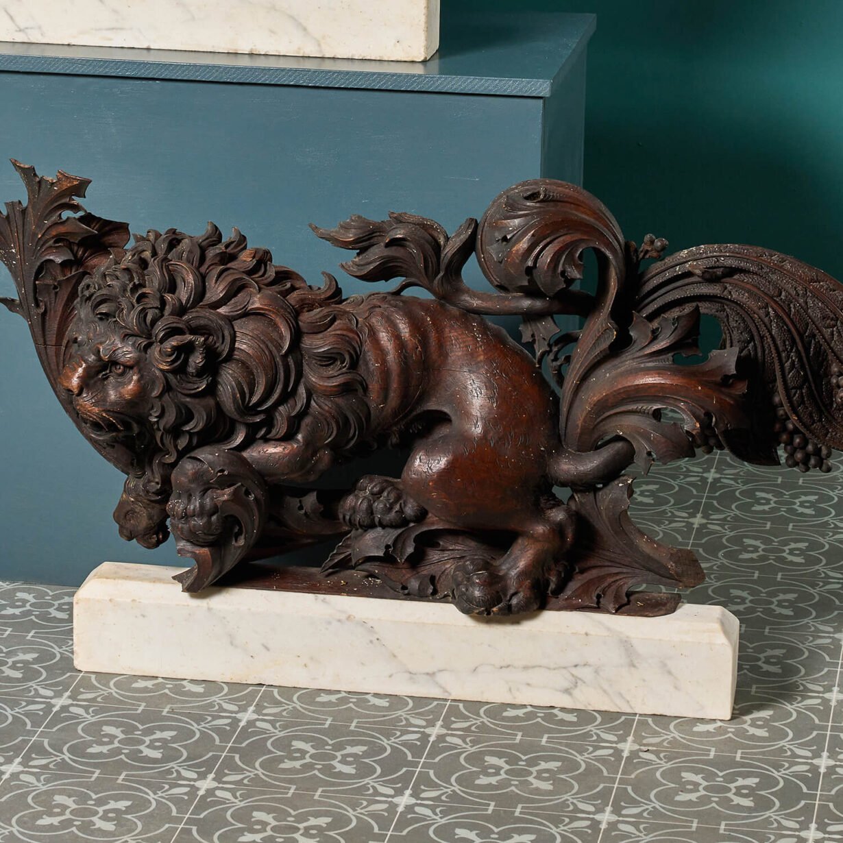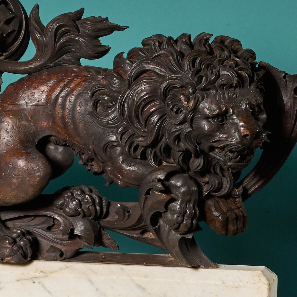 back to topA beautiful set of two wooden lion sculptures mounted onto Carrara marble plinths, ready to be placed in an interior as a decorative antique feature. Handsomely carved into oak with a rich, age-old patina, these carved lions date from the late 1800s, made at the hand of a skilled woodworker. Each lion has a characteristic sense of movement, standing in a poised position as if lively or ready to pounce – a stance described as courant in heraldry – among intertwined scrolling foliage, fruiting vines and acanthus leaves. They are of impressive scale, one lion facing left while the other faces right, making for a striking pair on a large sideboard, on columns either side of a large doorway or beside a grand staircase.