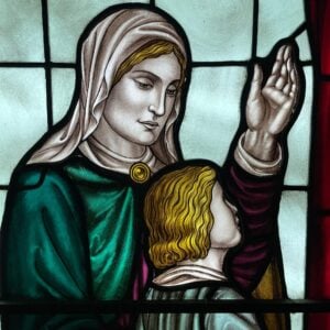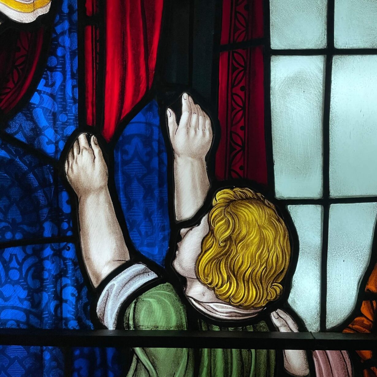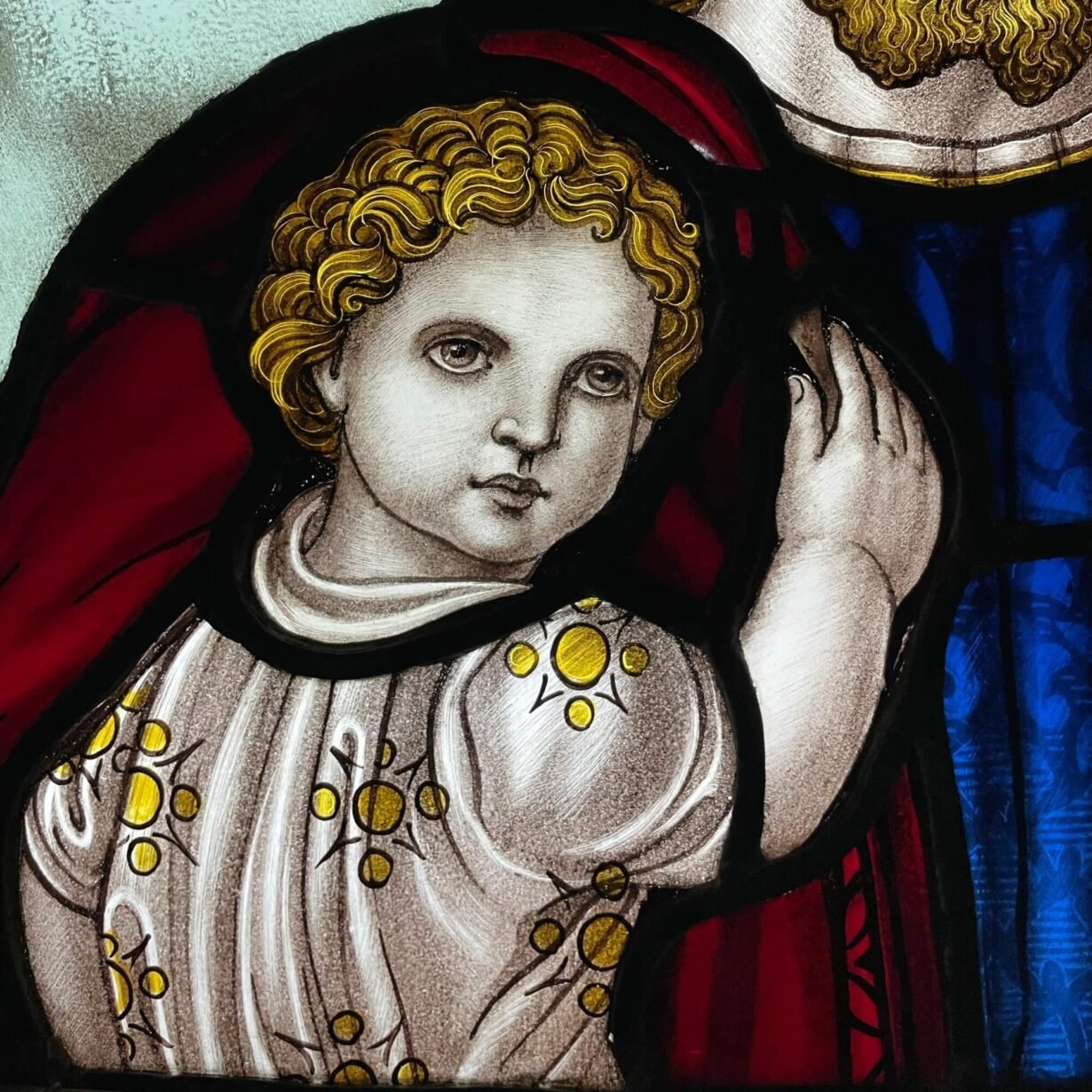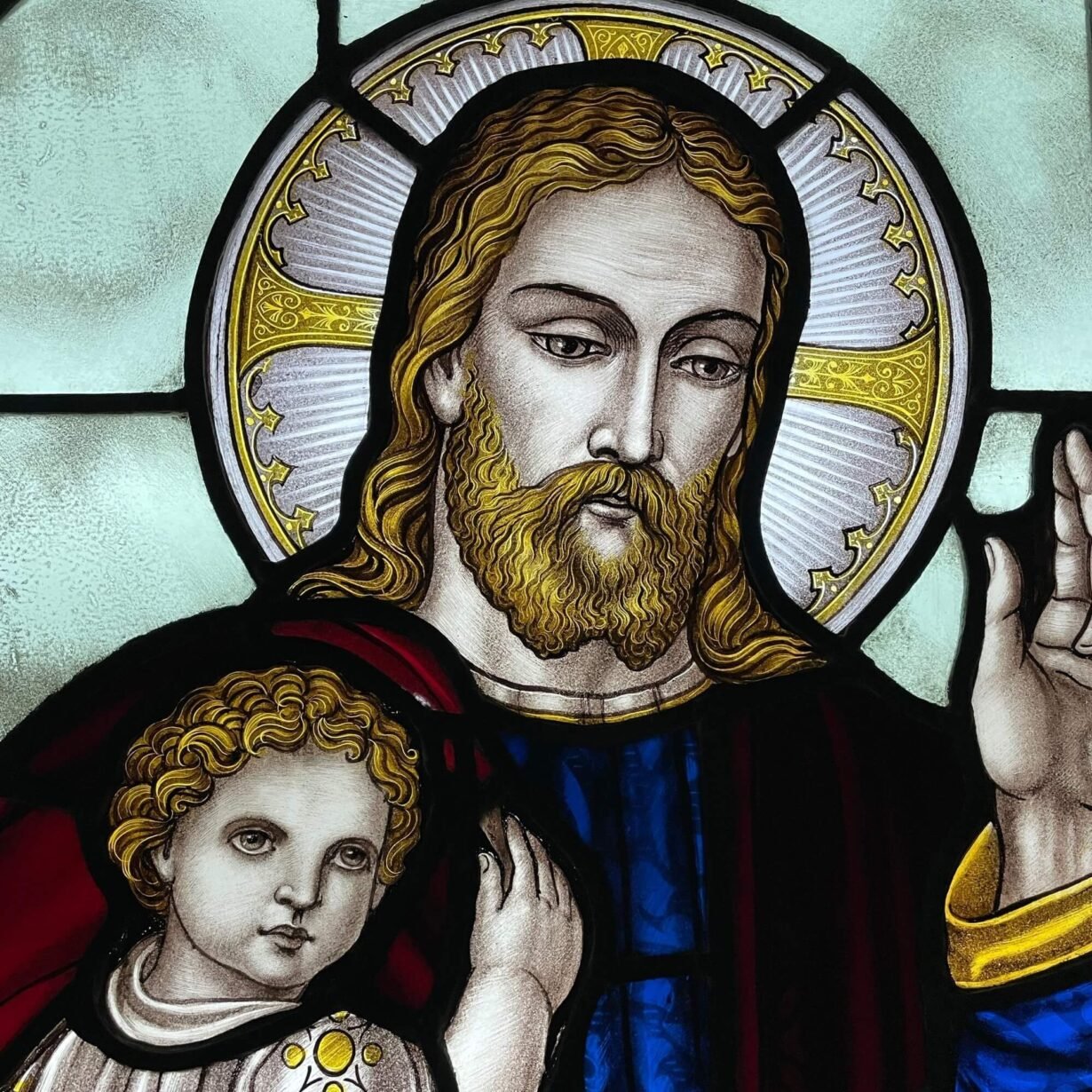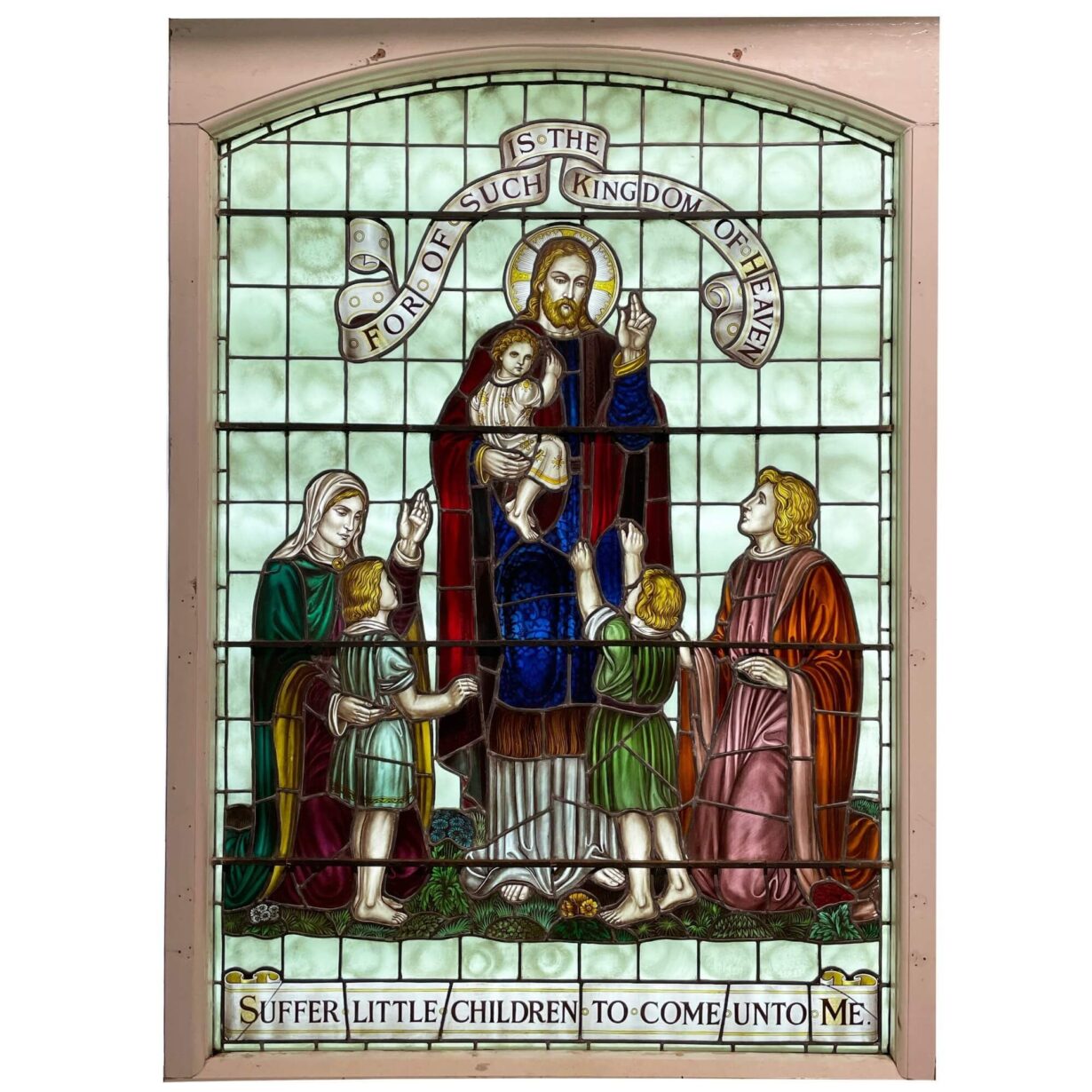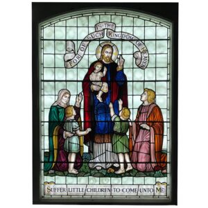 Jesus is depicted holding a child in his arms while blessing other children and their parents, dressed in vibrant shades of green, blue and red between two scrolls reading: “Suffer little children to come unto me, for of such is the kingdom of heaven” (Matthew 19:14). In this verse, Jesus is reaching out to children – a segment of society often considered insignificant – suggesting that, despite their vulnerability, children have as much to teach humanity as adults.