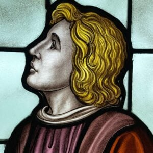 back to topA magnificent and very large reclaimed religious stained glass window made by Osborne and Phillips in 1949. This spectacular window stands at over 2.2m (7 ft) tall and features a religious subject, beautifully captured in stained and hand painted glass.