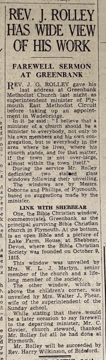 They created this window in 1949 for Greenbank Methodist Church, Plymouth. A newspaper report (pictured) from the Western Evening Herald from the 29th August 1949 details two stained glass windows dedicated to the church on the Rev. Rolley’s last address as minister.