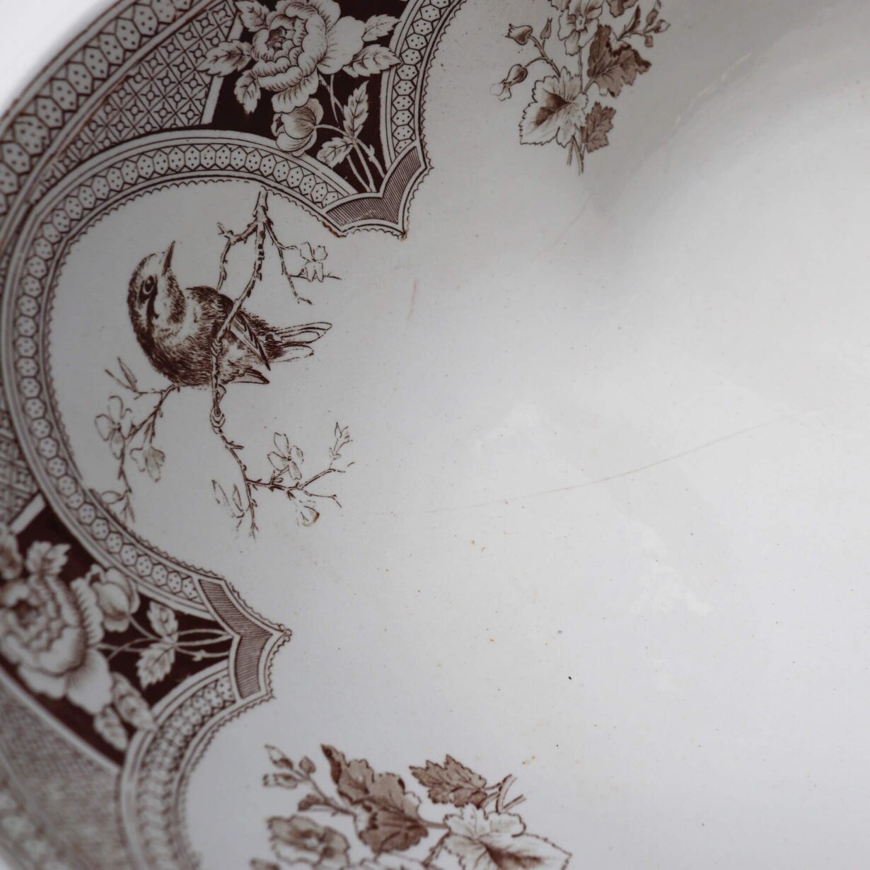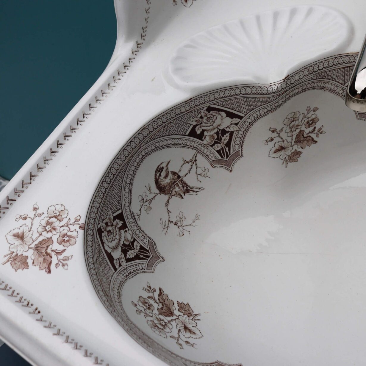 back to topThis elegant Victorian bathroom sink is a beautiful wash basin for the bathroom of a Victorian property or a contemporary cloakroom seeking a vintage look. Made in porcelain, this antique sink is decorated with a sepia toned transfer print, detailing intricate birds and florals to the basin and splashback surround. Taps shown are not included. See further details of condition in report below.