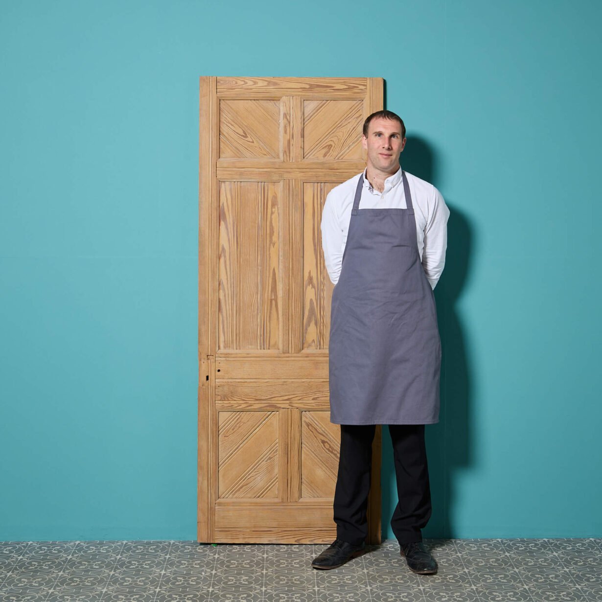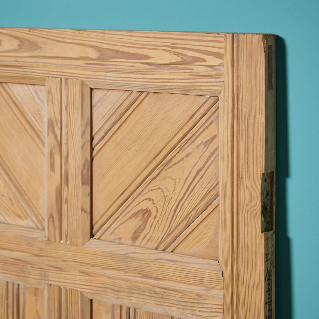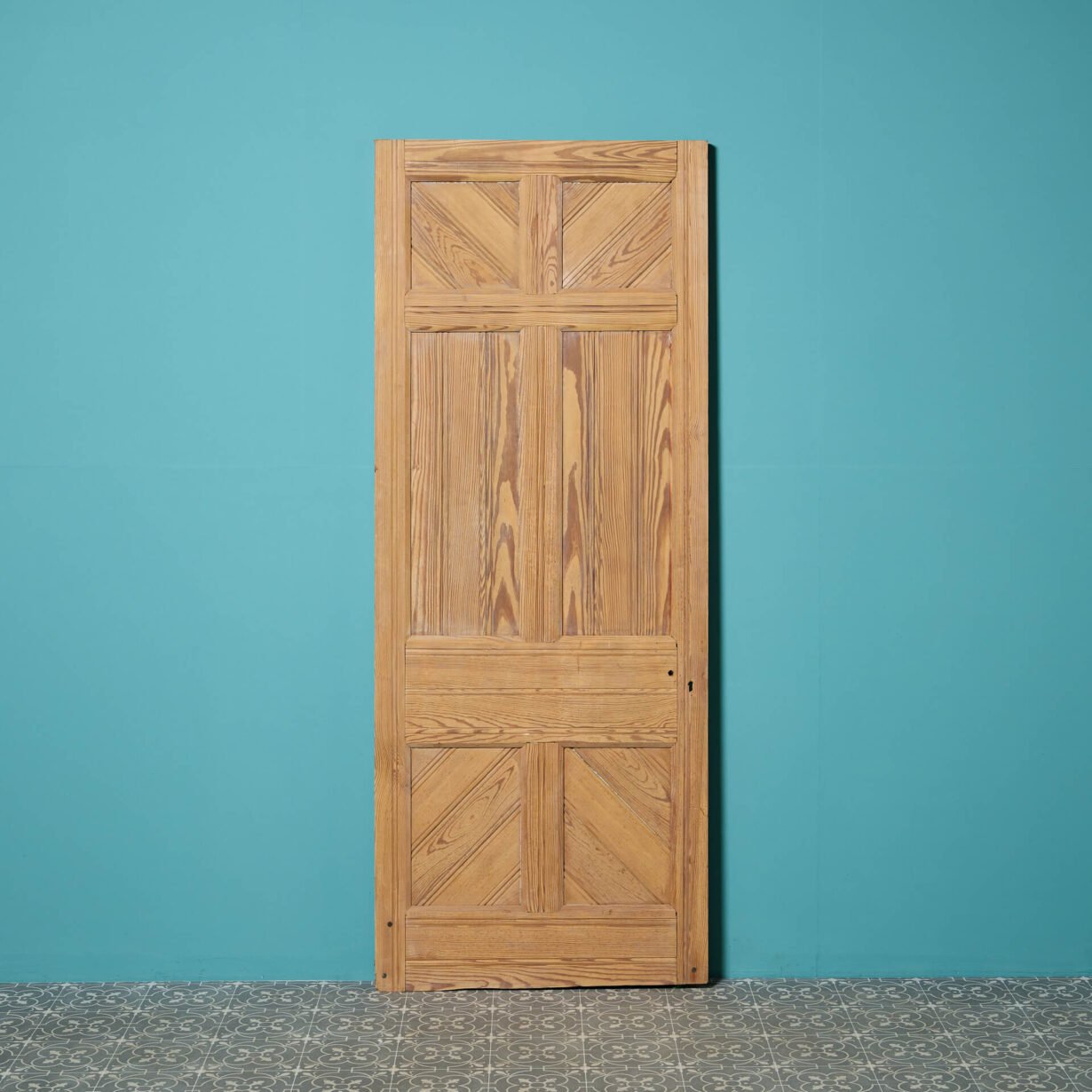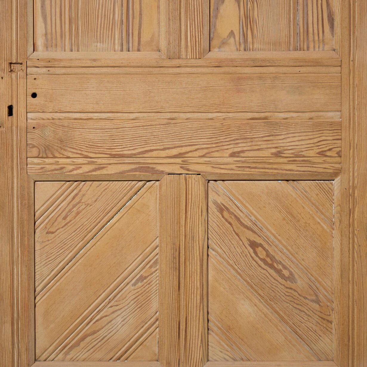 This reclaimed door is made from solid pitch pine that has a characteristic warm wood colour and attractive grain that looks handsome in any interior setting. It features 6 panels to both the front and the back, with vertical construction to the centre and diagonal construction to the top and base panels.