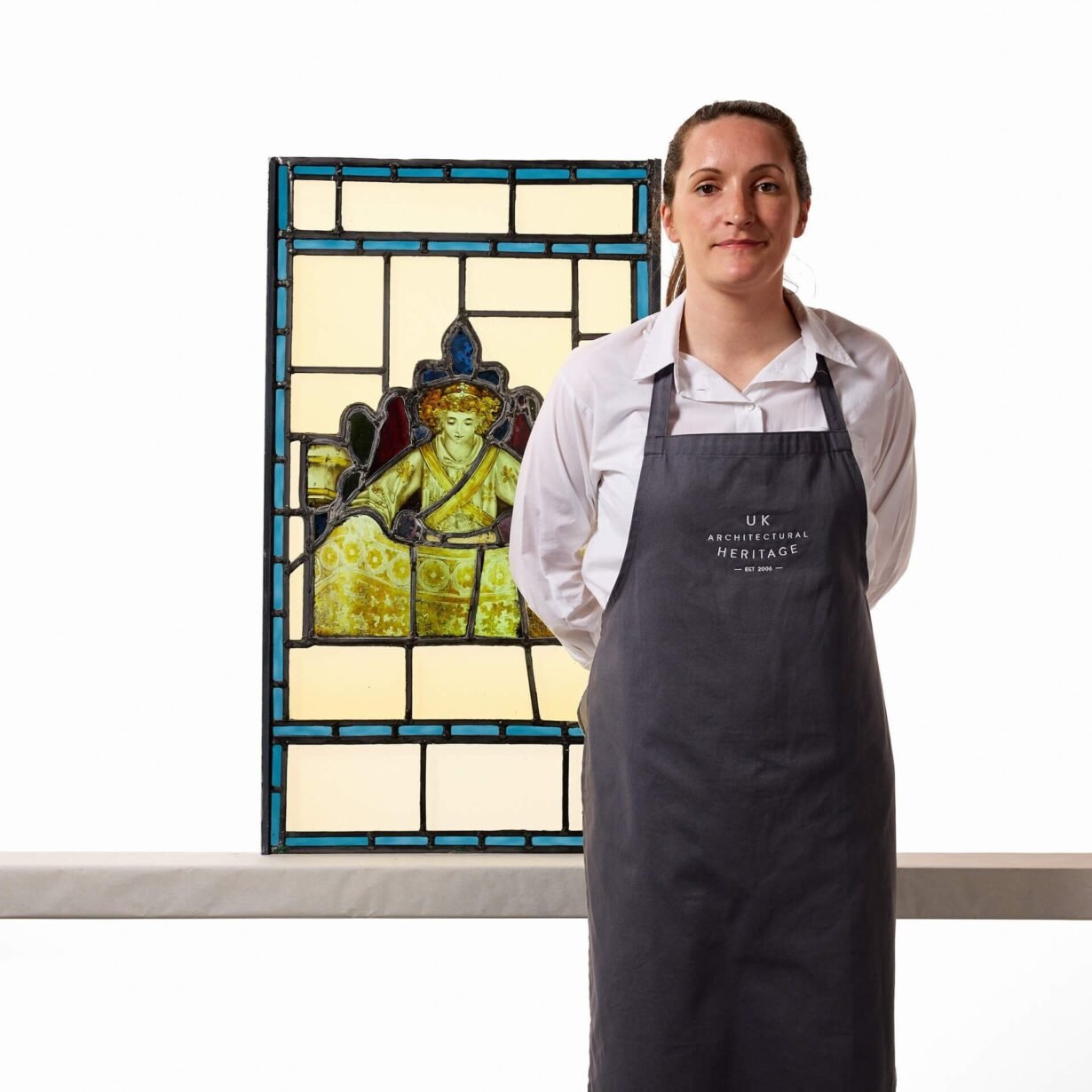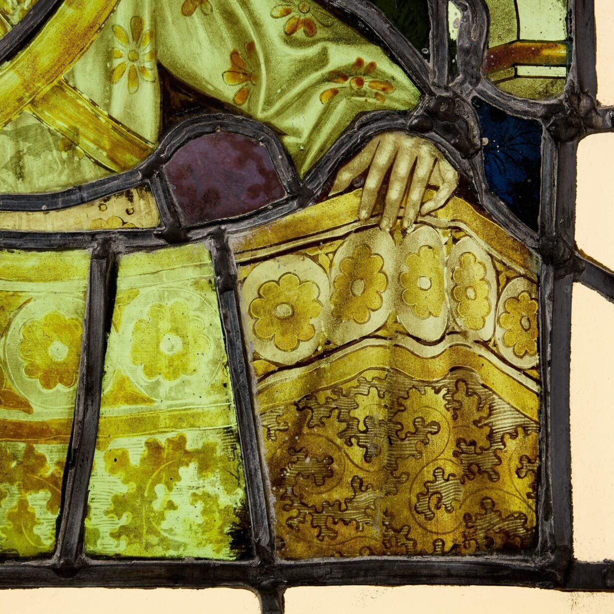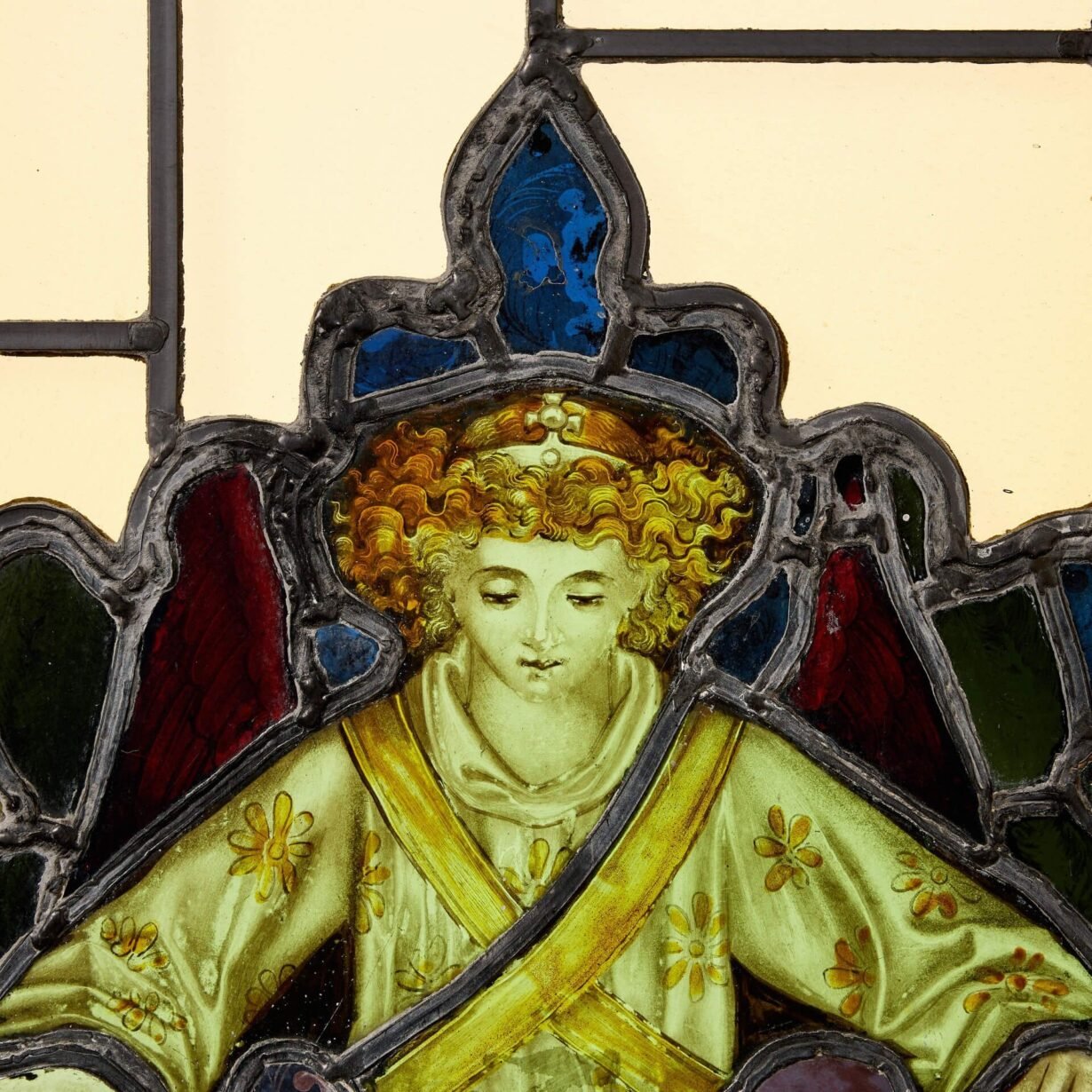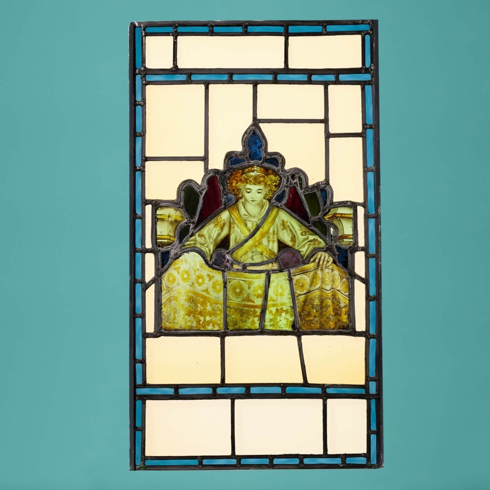 This unusual antique window depicts a young boy dressed in yellow and white, a crown atop their curling blonde hair, holding a cloak or perhaps dress of similar colours. It is a stunning piece of early 19th century art, brought to life by natural light.